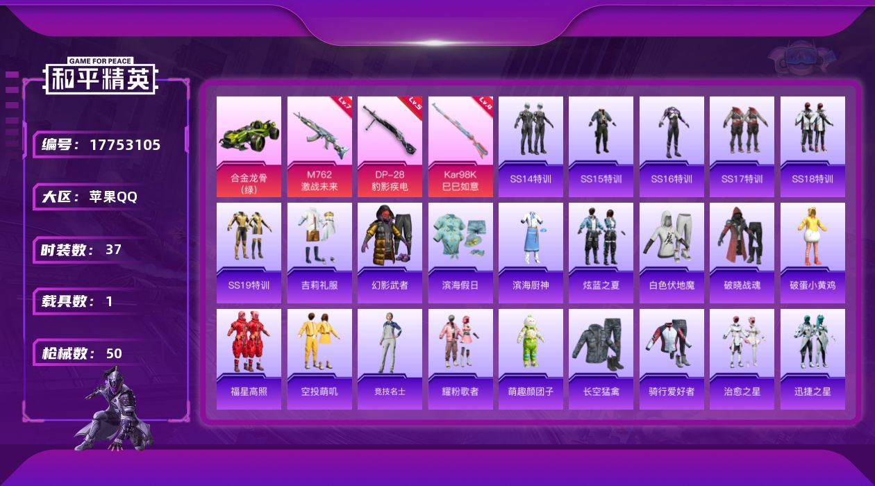 [17753105]苹果 手Q-0粉装-3特效枪-1载具-1粉色飞行器-17367热力值-11王牌印记-37套装-50枪皮【粉色枪皮等级】:M762-激战未来(七级),Kar98K-巳巳如意(四级),DP-28-豹影疾电(五级)【粉色载具】:合金龙骨(绿)【粉色枪皮】:M762-激战未来,Kar98K-巳巳如意,DP-28-豹影疾电【粉色飞行器】:激战未来飞行器