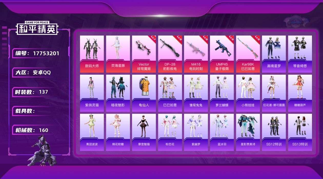 [17753201]地铁天赋满级 安卓 手Q-2粉装-5特效枪-0载具-1粉色飞行器-50694热力值-8王牌印记-137套装-160枪皮【热门品类】:套装-龟仙人【粉色套装】:粉装-数码大师,角色-荧海星豚【粉色枪皮等级】:M416-电玩时刻(五级),UMP45-量子极限(五级),Vector-绯穹魔姬(七级),Kar98K-巳巳如意(五级),DP-28-豹影疾电(五级)【粉色枪皮】:M416-电玩时刻,UMP45-量子极限,Vector-绯穹魔姬,Kar98K-巳巳如意,DP-28-豹影疾电【粉色飞行器】:炫彩糖果飞行器