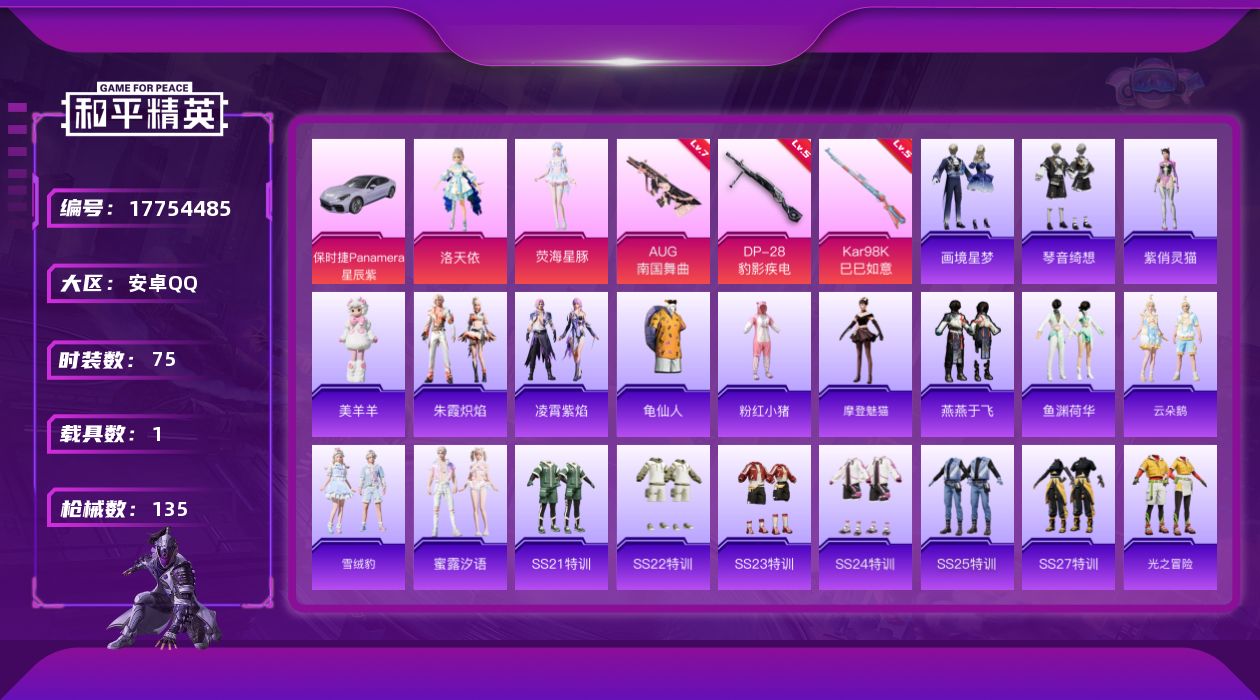 [17754485]安卓 手Q-2粉装-5特效枪-1载具-0粉色飞行器-38105热力值-1王牌印记-75套装-135枪皮 【热门品类】:套装-龟仙人,套装-粉红小猪 【粉色套装】:角色-洛天依,角色-荧海星豚 【粉色枪皮等级】:AUG-南国舞曲(七级),UMP45-萌骑冒险(五级),Kar98K-巳巳如意(五级),Mk14-福马献瑞(五级),DP-28-豹影疾电(五级) 【粉色载具】:保时捷Panamera(星辰紫) 【粉色枪皮】:AUG-南国舞曲,UMP45-萌骑冒险,Kar98K-巳巳如意,Mk14-福马献瑞,DP-28-豹影疾电 【粉色降落伞】:梦幻火箭降落伞,星之彼岸降落伞,第五大道降落伞,炫光之旅降落伞,月影灵韵降落伞,无垠阁降落伞,极意拳锋降落伞,炫彩糖果降落伞 【稀有套装】:套装-龟仙人,角色-摩登魅猫,套装-燕燕于飞,套装-鱼渊荷华,套装-云朵鹅,套装-雪绒豹,套装-蜜露汐语,套装-朱霞炽焰,套装-凌霄紫焰,玩偶服-美羊羊,角色-紫俏灵猫,套装-画境星梦,套装-琴音绮想,套装-雨过天青,套装-红釉青花 【稀有枪皮】:AKM-星之彼岸,AKM-破晓战魂,AKM-龙的传人,M16A4-幻世战舞者,SCAR-L-炫彩节奏,SCAR-L-玉兔迎春,M416-彩虹嘻嘻猴,M416-糯团青竹,M416-蓝色火焰,GROZA-懵萌河马,GROZA-荧海星豚,AUG-天降萌叽,AUG-耀粉歌者,AUG-闲梦青缨,QBZ-彩虹符号,M762-天降萌叽,M762-彩虹符号,M762-快乐主宰,M762-云朵鹅,Mk47-妙红点点,G36C-懵萌河马,AC-VAL-天降萌叽,蜜獾-天降萌叽,ACE32-画境星梦,ARX-凌霄紫焰,UZI-啾咪啾咪,UZI-天降萌叽,UMP45-生命誓言,Vector-生命誓言,汤姆逊-天降萌叽,汤姆逊-像素花束,MP5K-画境星梦,JS9-凌霄紫焰,P90-巳巳如意,SKS-炫彩节奏,Mini14-涂山之恋,Mini14-炫彩节奏,Mini14-耀粉歌者,Mini14-绯穹魔姬,SLR-彩虹符号,莫辛纳甘-懵萌河马,AMR-妙红点点,SVD-云朵鹅,M1加兰德-画境星梦,S686-彩虹符号,S12K-玩趣呆呆,DBS-第五大道,DBS-月影灵韵,AA12-G-画境星梦,SPAS-12-云朵鹅,M249-妙红点点,M249-星之彼岸,DP-28-彩虹符号,