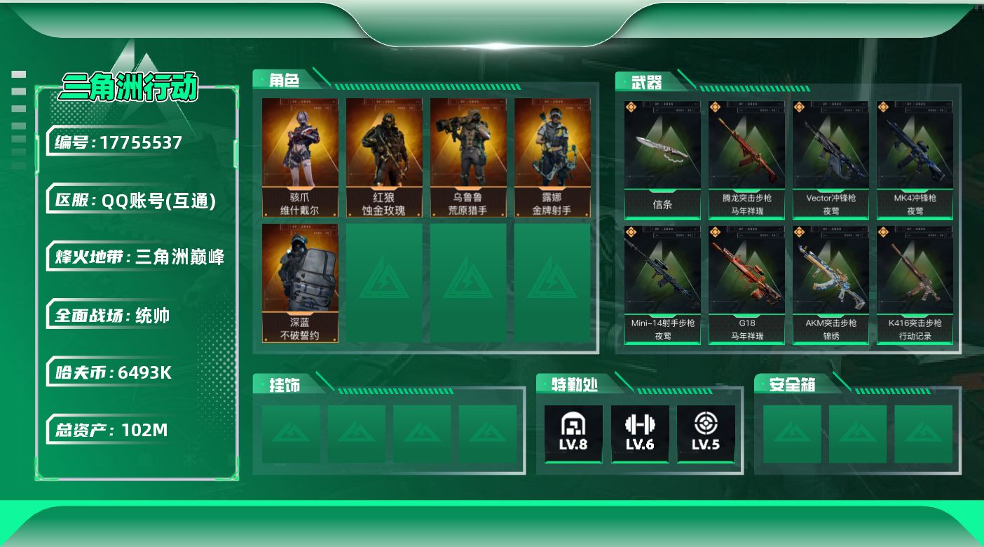 [17755537]102m总资产-6493k哈夫币-60烽火等级-三角洲巅峰-50战场等级-统帅 【干员外观】:红狼-蚀金玫瑰,骇爪-维什戴尔,深蓝-不破誓约,露娜-金牌射手,乌鲁鲁-荒原猎手 【近战皮肤】:近战-信条,近战-黑鹰 【传说外观】:M4A1突击步枪-蚀金玫瑰,AKM突击步枪-锦绣,ASh-12战斗步枪-鹅鸭杀,K416突击步枪-行动记录,AUG突击步枪-悠然茶歇,SG552突击步枪-运动员,SCAR-H战斗步枪-启航,G3战斗步枪-骑士,腾龙突击步枪-马年祥瑞,腾龙突击步枪-万金泪冠,K437突击步枪-锦绣,MK47突击步枪-悠然茶歇,P90冲锋枪-信条,Vector冲锋枪-夜莺,UZI冲锋枪-悠然茶歇,SMG-45冲锋枪-锦绣,勇士冲锋枪-能天使-午夜邮差,勇士冲锋枪-万金泪冠,QCQ171冲锋枪-鹅鸭杀,MK4冲锋枪-夜莺,M250通用机枪-骑士之心,QJB201轻机枪-鹅鸭杀,Mini-14射手步枪-夜莺,M14射手步枪-蛮荒,SKS射手步枪-骑士,SR-25射手步枪-信条,R93狙击步枪-维什戴尔,AWM狙击步枪-万金泪冠,G18-马年祥瑞 【史诗外观】:QBZ95-1突击步枪-竞技风,ASh-12战斗步枪-无极限,K416突击步枪-冬日风情,K416突击步枪-腊梅,K416突击步枪-阿萨拉特攻,M7战斗步枪-百步穿杨,SG552突击步枪-哈夫克警备,SCAR-H战斗步枪-囚徒,G3战斗步枪-流沙送葬,PTR-32突击步枪-工业狂潮,AS Val突击步枪-百步穿杨,腾龙突击步枪-猎鳄行动,K437突击步枪-守护者,K437突击步枪-丛影谍踪,MP5冲锋枪-战术竞备,MP5冲锋枪-竞技风,Vector冲锋枪-百步穿杨,SR-3M紧凑突击步枪-战术竞备,SR-3M紧凑突击步枪-开工大吉,勇士冲锋枪-工业狂潮,勇士冲锋枪-丛影谍踪,MP7冲锋枪-守护者,MP7冲锋枪-六套之力,725双管霰弹枪-炽焰,M249轻机枪-丛影谍踪,M250通用机枪-囚徒,QJB201轻机枪-炽焰,Mini-14射手步枪-守护者,VSS射手步枪-丛影谍踪,SVD狙击步枪-阿萨拉工艺,M14射手步枪-工业狂潮, M14射手步枪-航天庆典,SR-25射手步枪-聚光灯,SV-98狙击步枪-囚徒,M700狙击步枪-蝮蛇,M700狙击步枪-百步穿杨,M700狙击步枪-哈夫克警备,AWM狙击步枪-无极