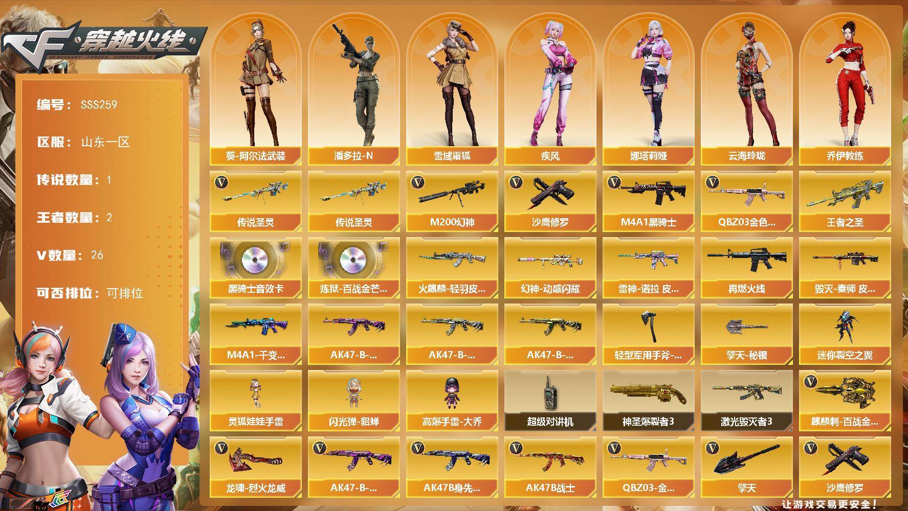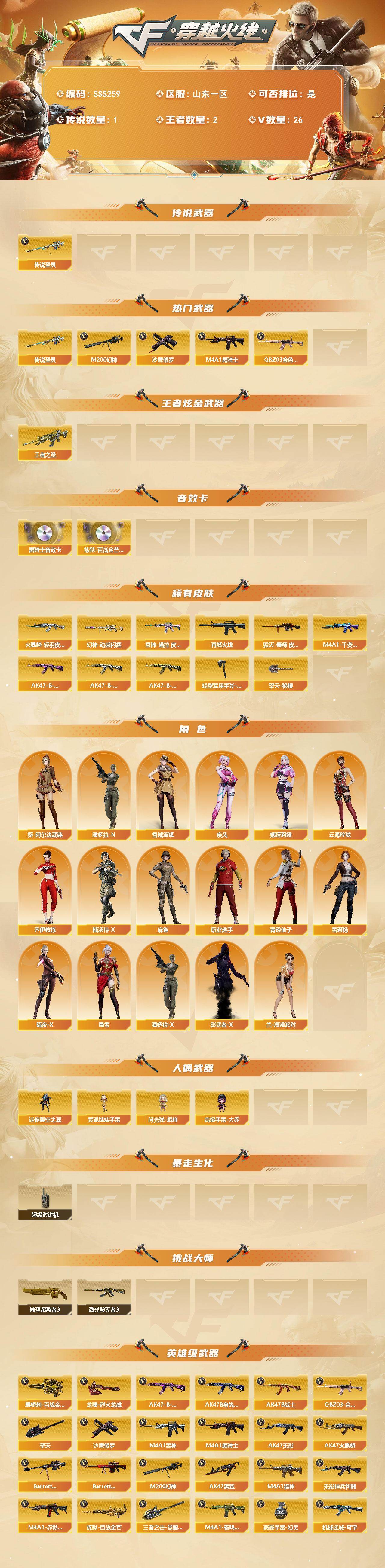 [17756584]山东一区-26V-2王者武器数-0炫金武器数 【传说武器】:传说圣灵 【热门武器】:传说圣灵,QBZ03-金色蔷薇,M200-幻神,M4A1-黑骑士,沙鹰-修罗 【王者炫金武器】:王者之圣 【音效卡】:M4A1-黑骑士音效卡,炼狱-百战金芒-庆典舞曲音效卡 【皮肤】:幻神-动感闪耀 皮肤,雷神-诺拉 皮肤,M4A1-再燃火线,火麒麟-轻羽皮肤,毁灭-秦师 皮肤,M4A1-千变-孔明皮肤,AK47-B-常胜将军-曹操*2,AK47-B-常胜将军-刘备,AK47-B-常胜将军-孙权,轻型军用手斧-再燃火线,擎天-秘银 【角色】:雪域霜狐,乔伊教练,云海玲珑,葵-阿尔法武装,暗夜-X,疾风,兰-海滩派对,麻雀,娜塔莉娅,潘多拉-X,青霞仙子,斯沃特-X,蜀雪,雪莉杨,影武者-X,职业选手,潘多拉-N 【人偶武器】:迷你裂空之翼,闪光弹-貂蝉,高爆手雷-大乔,灵狐娃娃手雷 【暴走生化】:超级对讲机 【挑战大师】:神圣爆裂者III,激光毁灭者III 【英雄级武器】:AK47-火麒麟,M4A1-雷神,M4A1-黑骑士,AK47-无影,AK47-黑鲨,无影-神兵利器,QBZ03-金色蔷薇,M4A1-猎神,AK47-B-常胜将军,机械迷城-穹宇,AK47-B-身先士卒,AK47-B-战士,Barrett-毁灭,Barrett-极光,M200-幻神,炼狱-百战金芒,沙鹰-修罗,擎天,麒麟刺-百战金芒,王者之击-觉醒版,龙啸-烈火龙威,高爆手雷-幻灵,M4A1-赤狱骑士,M4A1-苍鸣雷神 【源级武器】:魂·雷神-诺拉,灵·黑骑士-炫光,源·青龙,源-金色蔷薇,魂·英雄-湾区光枢,AWM-裁决-百城联赛天津,魂·裁决-新人王绿豆,魂·裁决-羽掣,御·毁灭-葫芦兄弟,灵·Barrett-朱雀-炫光*2,源·炼狱,魂·炼狱-月,加特林-炼狱-掌火,御·炼狱-女娲,魂·修罗-迷彩,魂·修罗-现代金属,灵·天神-穹宇,源·武圣glock,魂·屠龙-惊鸿,魂·擎天-蒸汽钟表,源·擎天-萌杀,源-擎天,源·龙啸,魂·龙啸-玩具枪,魂·麒麟刺-月,灵·麒麟刺-穹宇 【道具】:BS战队炫彩背包,XROCK炫彩背包,战舰背包,百战金芒炫彩背包,超级背包,雪域霜狐炫彩背包,女皇终结者-魔龙之吻,救世主-黑桃战神,绿色巨人,灵魂忍者,迷雾幽灵,夺命之镰,防化服*3,金色流光-枪王排位*2,星辰流光-枪王排