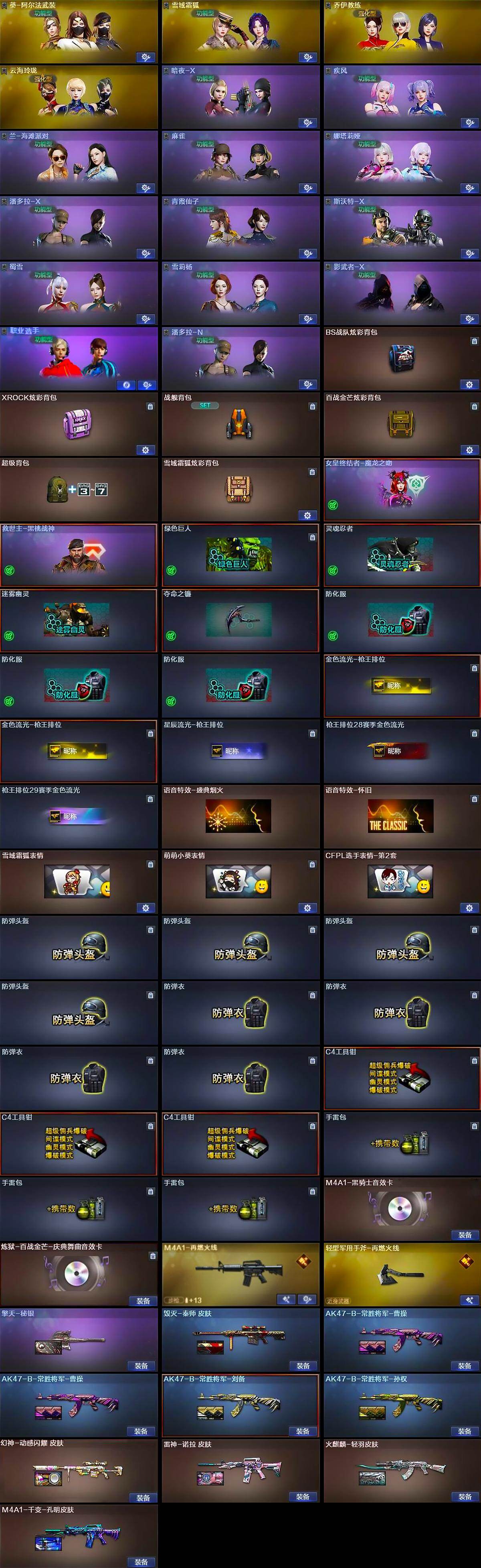 【道具】:BS战队炫彩背包,XROCK炫彩背包,战舰背包,百战金芒炫彩背包,超级背包,雪域霜狐炫彩背包,女皇终结者-魔龙之吻,救世主-黑桃战神,绿色巨人,灵魂忍者,迷雾幽灵,夺命之镰,防化服*3,金色流光-枪王排位*2,星辰流光-枪王排