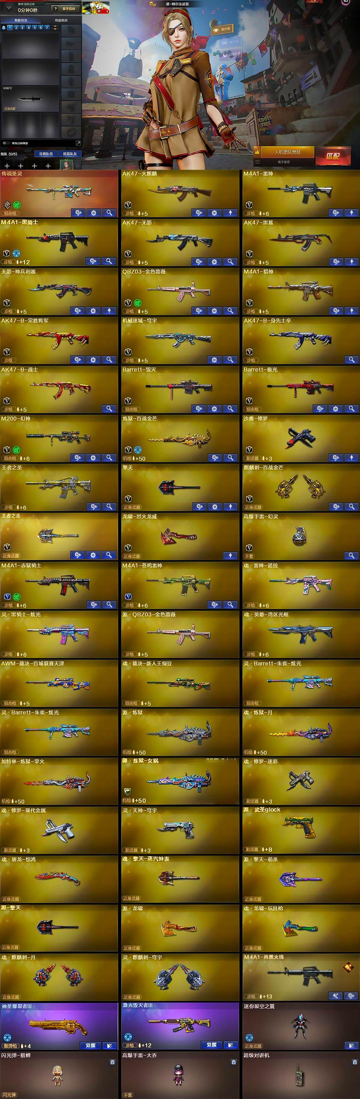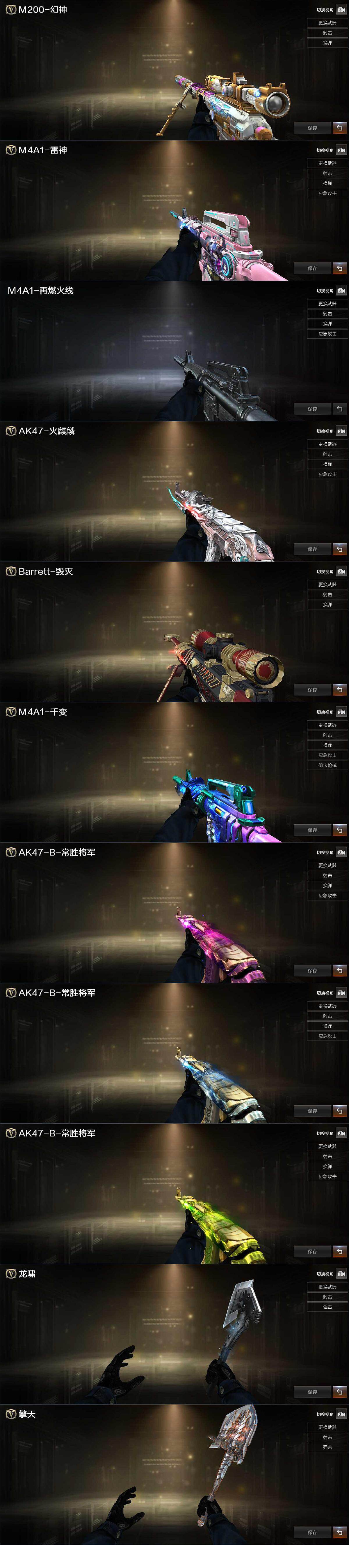 【英雄级武器】:AK47-火麒麟,M4A1-雷神,M4A1-黑骑士,AK47-无影,AK47-黑鲨,无影-神兵利器,QBZ03-金色蔷薇,M4A1-猎神,AK47-B-常胜将军,机械迷城-穹宇,AK47-B-身先士卒,AK47-B-战士,Barrett-毁灭,Barrett-极光,M200-幻神,炼狱-百战金芒,沙鹰-修罗,擎天,麒麟刺-百战金芒,王者之击-觉醒版,龙啸-烈火龙威,高爆手雷-幻灵,M4A1-赤狱骑士,M4A1-苍鸣雷神