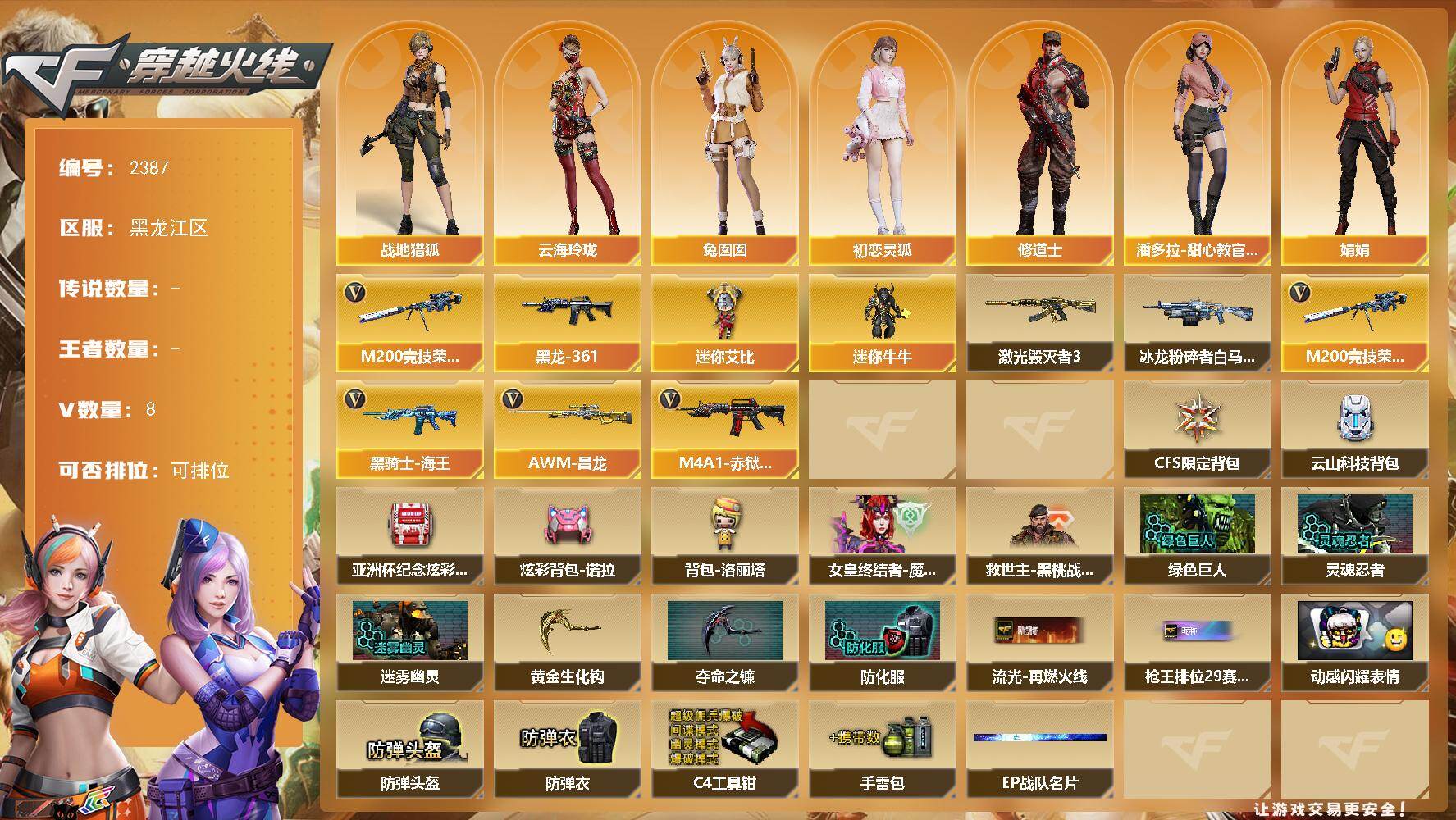 [17756944]黑龙江区-14V-0王者武器数-0炫金武器数 【热门武器】:M200-竞技荣光 【皮肤】:M4A1-黑龙-361 【角色】:战地猎狐,修道士,云海玲珑,暗夜-X,初恋灵狐,娟娟,潘多拉-甜心教官,兔囡囡,新娜塔莎 【人偶武器】:迷你牛牛,迷你艾比 【挑战大师】:冰龙粉碎者-白马银枪*2,激光毁灭者III 【英雄级武器】:黑骑士-海王,HK417-朱雀-电竞之星,机械迷城-穹宇,M200-竞技荣光,M4A1-赤狱骑士,AWM-昌龙 【道具】:CFS限定背包,云山科技背包,亚洲杯纪念炫彩背包,炫彩背包-诺拉,背包-洛丽塔,女皇终结者-魔龙之吻,救世主-黑桃战神,黄金生化钩,绿色巨人,灵魂忍者,迷雾幽灵,夺命之镰,防化服*3,流光-再燃火线,枪王排位29赛季金色流光,动感闪耀表情,EP战队名片,防弹头盔*5,防弹衣*5,C4工具钳*5,手雷包*5 【特殊枪械】: