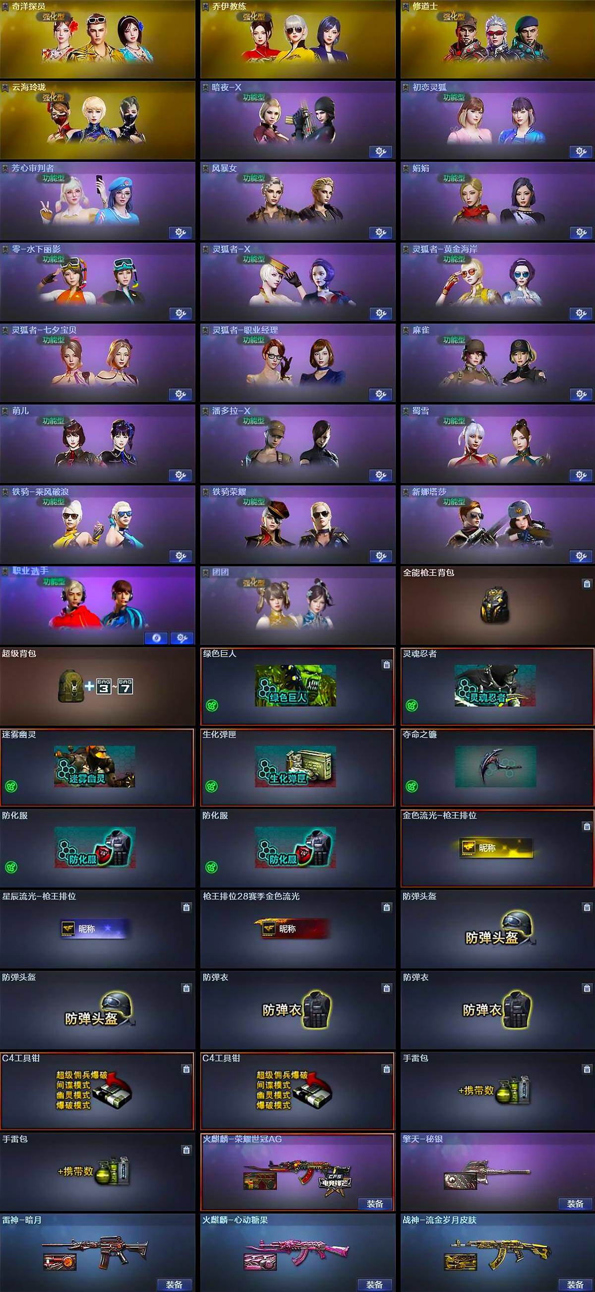 【道具】:全能枪王背包,超级背包,绿色巨人,灵魂忍者,迷雾幽灵,生化弹匣,夺命之镰,防化服*2,金色流光-枪王排位,星辰流光-枪王排位,枪王排位28赛季金色流光,防弹头盔*2,防弹衣*2,C4工具钳*2,手雷包*2