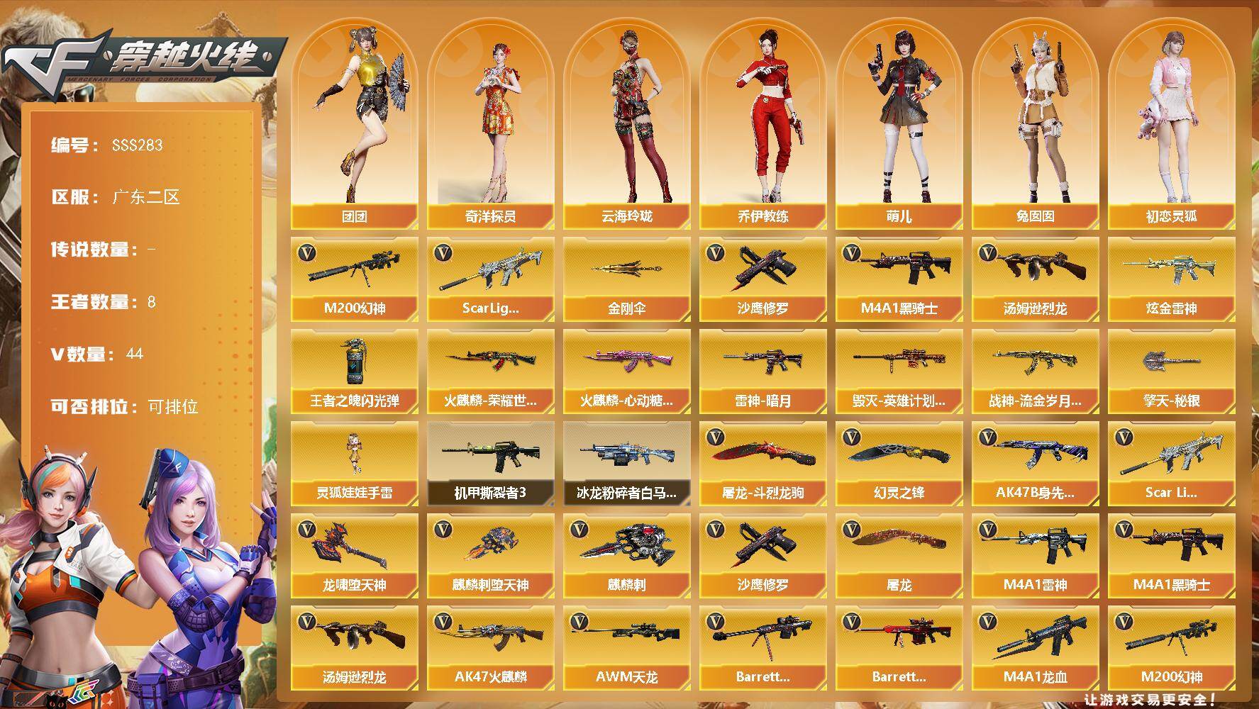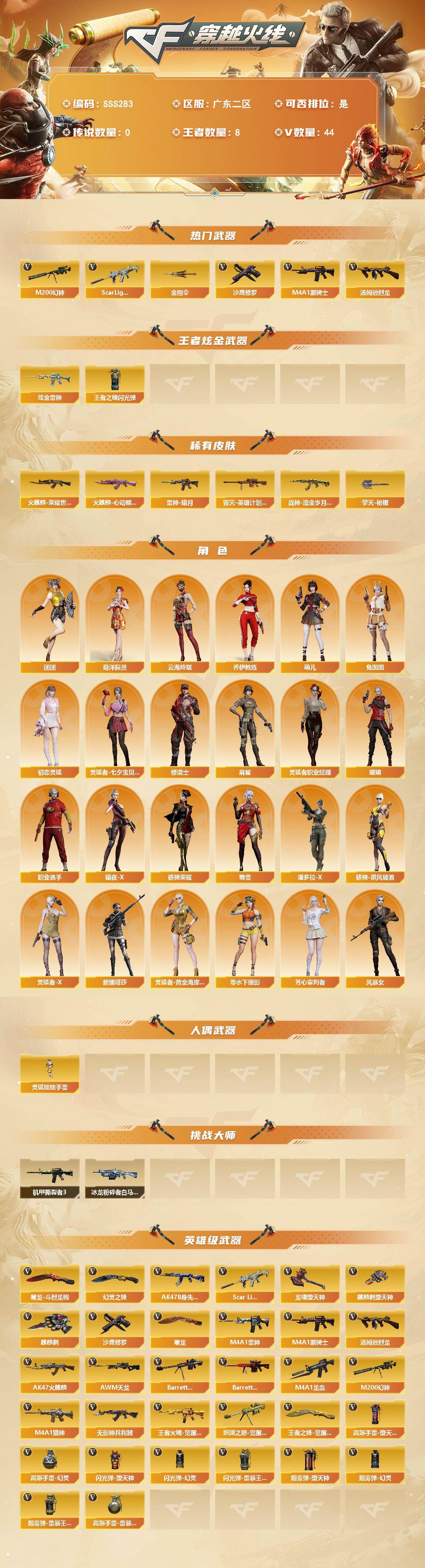[17757155]广东二区-47V-8王者武器数-1炫金武器数 【热门武器】:Scar Light-白虎,M200-幻神,M4A1-黑骑士,汤姆逊-烈龙,沙鹰-修罗,金刚伞 【王者炫金武器】:王者之魄闪光弹,炫金雷神 【皮肤】:雷神-暗月,火麒麟-荣耀世冠AG,火麒麟-心动糖果,毁灭-英雄计划 皮肤,战神-流金岁月皮肤,擎天-秘银 【角色】:奇洋探员,乔伊教练,修道士,云海玲珑,暗夜-X,初恋灵狐,芳心审判者,风暴女,娟娟,零-水下丽影,灵狐者-X,灵狐者-黄金海岸,灵狐者-七夕宝贝,灵狐者-职业经理,麻雀,萌儿,潘多拉-X,蜀雪,铁骑-乘风破浪,铁骑荣耀,兔囡囡,新娜塔莎,职业选手,团团 【人偶武器】:灵狐娃娃手雷 【挑战大师】:冰龙粉碎者-白马银枪,机甲撕裂者III 【英雄级武器】:AK47-火麒麟*2,M4A1-雷神,M4A1-黑骑士,M4A1-龙血,Scar Light-白虎,无影-神兵利器,M4A1-猎神,王者火魄-觉醒版,AK47-B-身先士卒,AWM-天龙,Barrett-毁灭,Barrett-极光,M200-幻神,炽渊之怒-觉醒版,汤姆逊-烈龙,沙鹰-修罗,屠龙*2,麒麟刺-堕天神*2,麒麟刺,幻灵之锋,龙啸-堕天神,王者之锋-觉醒版,屠龙-斗烈龙驹,高爆手雷-堕天神*2,高爆手雷-幻灵*2,高爆手雷-雷暴王者*2,闪光弹-堕天神*2,闪光弹-幻灵*2,闪光弹-雷暴王者,烟雾弹-堕天神*2,烟雾弹-幻灵*2,烟雾弹-雷暴王者 【源级武器】:魂·火麒麟-百城,御·火麒麟-平天大圣,源-黑龙,御·黑龙-龙太子,魂·M4A1-雷神-化蛇,魂·雷神-神秘按键,魂-雷神-萌杀,源·无影,源·武圣*2,魂·龙血-锋芒破茧,魂·QBZ03-金色蔷薇-萌杀,源·天龙,魂·裁决-凤灵,源·毁灭,御·毁灭-葫芦兄弟,魂·炼狱-电子连击,魂·炼狱-月,魂·炼狱-蒸汽钟表,加特林-炼狱-掌火,魂·修罗-神兵利器,魂·天神-宇航兔兔,源·武圣glock*2,源-擎天,源·龙啸 【道具】:全能枪王背包,超级背包,绿色巨人,灵魂忍者,迷雾幽灵,生化弹匣,夺命之镰,防化服*2,金色流光-枪王排位,星辰流光-枪王排位,枪王排位28赛季金色流光,防弹头盔*2,防弹衣*2,C4工具钳*2,手雷包*2 【特殊枪械】:1白虎,1黑骑士,1烈龙