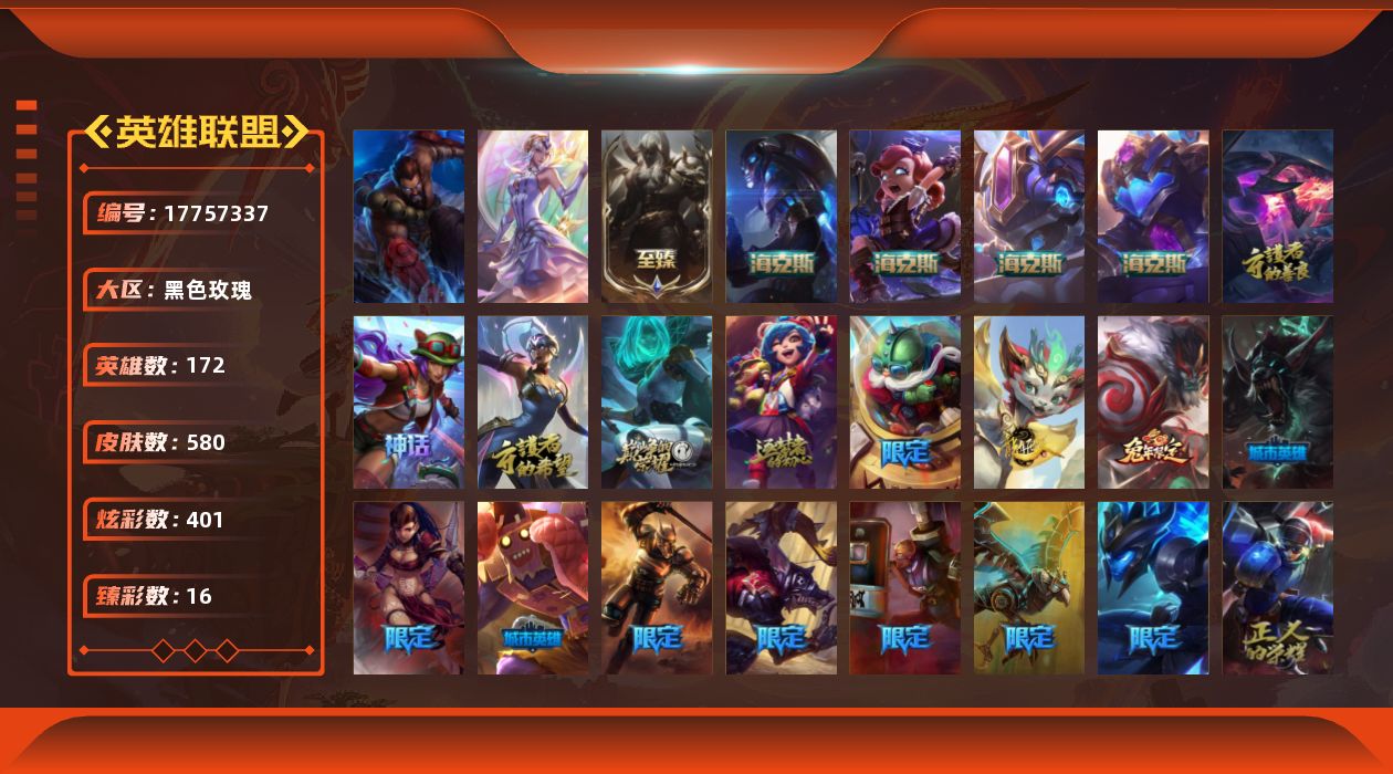 [17757337]未定级段位-172英雄-580皮肤-401炫彩-2终极-11神话-56限定-46传说-130史诗