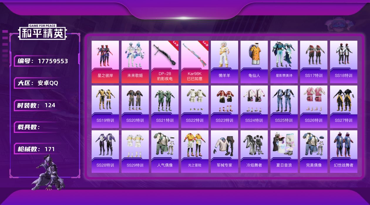 [17759553]安卓 手Q-2粉装-4特效枪-0载具-1粉色飞行器-45439热力值-4王牌印记-124套装-171枪皮 【热门品类】:套装-龟仙人 【粉色套装】:粉装-星之彼岸,粉装-未来歌姬 【粉色枪皮等级】:ACE32-萌骑漫游(三级),Kar98K-巳巳如意(五级),Mk14-福马献瑞(五级),DP-28-豹影疾电(五级) 【粉色枪皮】:ACE32-萌骑漫游,Kar98K-巳巳如意,Mk14-福马献瑞,DP-28-豹影疾电 【粉色飞行器】:炫彩糖果飞行器 【粉色降落伞】:星之彼岸降落伞,妙趣可丽降落伞,炫彩糖果降落伞 【稀有套装】:套装-龟仙人,套装-炫彩糖果,套装-马上有钱,套装-星影赞美诗,玩偶服-懒羊羊 【稀有枪皮】:AKM-破晓战魂,AKM-虎虎生威,AKM-龙的传人,M16A4-幻世战舞者,M16A4-红色方程式,M16A4-蓝色火焰,SCAR-L-夜灯,SCAR-L-幽秘魅影,SCAR-L-炫彩节奏,SCAR-L-玉兔迎春,SCAR-L-红色方程式,M416-红色方程式,M416-蓝色火焰,GROZA-彩虹符号,GROZA-懵萌河马,AUG-天降萌叽,AUG-耀粉歌者,QBZ-彩虹符号,M762-天降萌叽,M762-彩虹符号,Mk47-妙红点点,G36C-懵萌河马,AC-VAL-天降萌叽,蜜獾-天降萌叽,蜜獾-娇憨猪猪,UZI-啾咪啾咪,UZI-天降萌叽,UZI-娇憨猪猪,UZI-红色方程式,UMP45-夜灯,UMP45-生命誓言,UMP45-蓝色火焰,Vector-焰鹰斗篷,Vector-彩虹符号,Vector-生命誓言,汤姆逊-天降萌叽,汤姆逊-炫彩节奏,汤姆逊-耀粉歌者,汤姆逊-像素花束,Kar98K-炫彩节奏,Kar98K-王子的夏天,Kar98K-红色方程式,M24-炫彩节奏,M24-幻彩电音,AWM-焰鹰斗篷,AWM-垂柳戏鸭,AWM-音爆索尼克,SKS-夜灯,SKS-炫彩节奏,VSS-彩虹符号,VSS-星之彼岸,Mini14-涂山之恋,Mini14-炫彩节奏,Mini14-耀粉歌者,SLR-娇憨猪猪,SLR-彩虹符号,莫辛纳甘-懵萌河马,AMR-妙红点点,M417-惊鸿侠骨,M200-惊鸿侠骨,S686-彩虹符号,S686-生命誓言,S686-红色方程式,S1897-炫彩节奏,S12K-破晓战魂,S12K-垂柳戏鸭,S12K-夜灯,S12K-娇憨