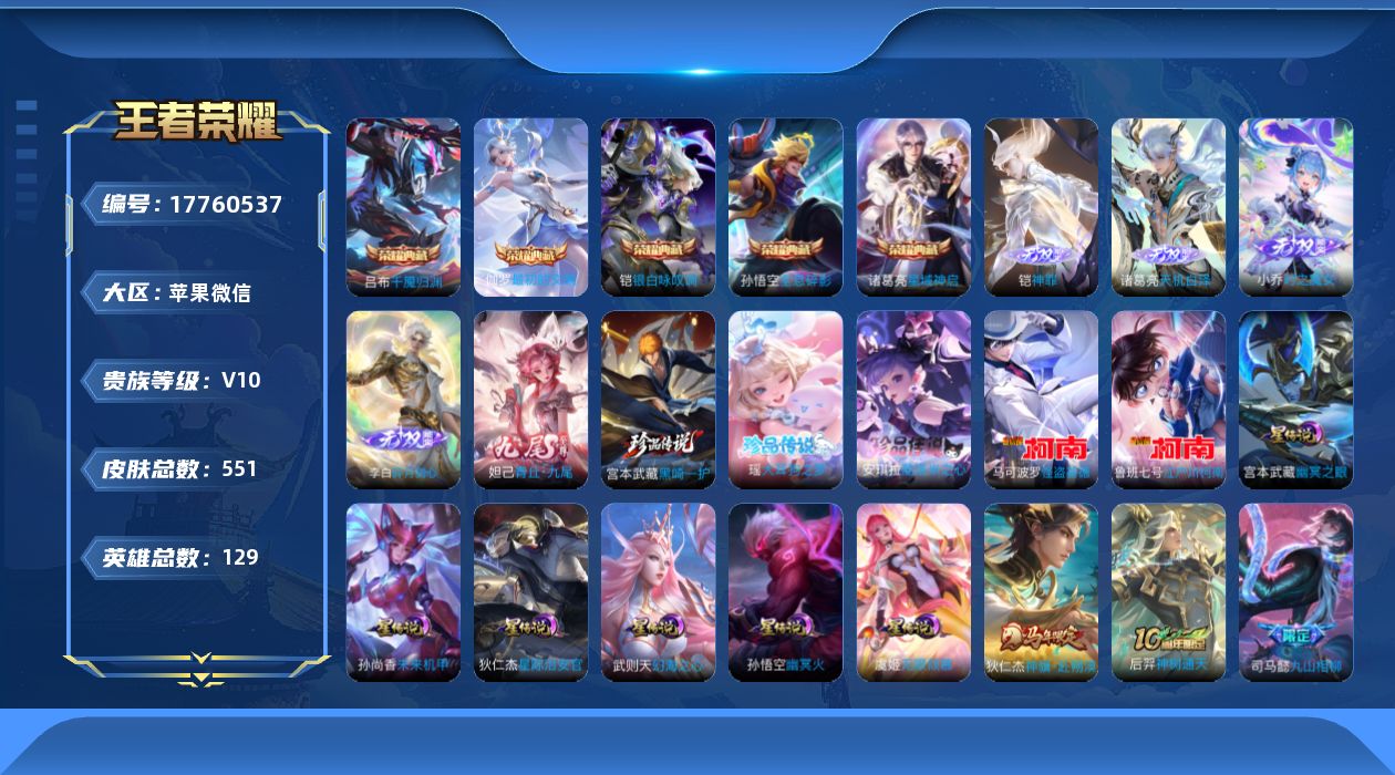 [17760537]苹果WX-V10-最强王者段位-129英雄-551皮肤-5典藏皮肤-1典藏英雄-5无双-5珍品传说-51传说-183史诗