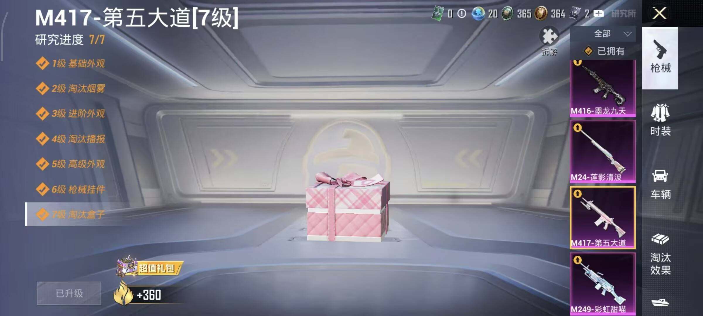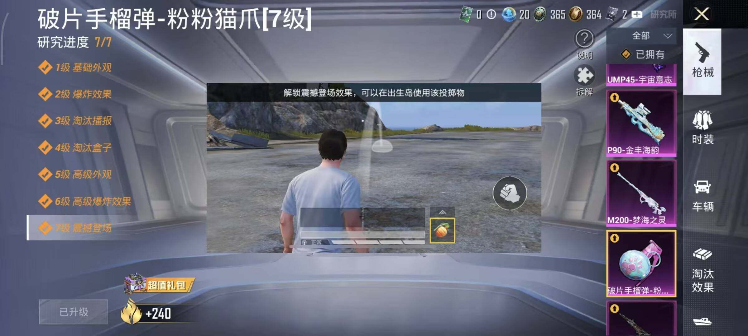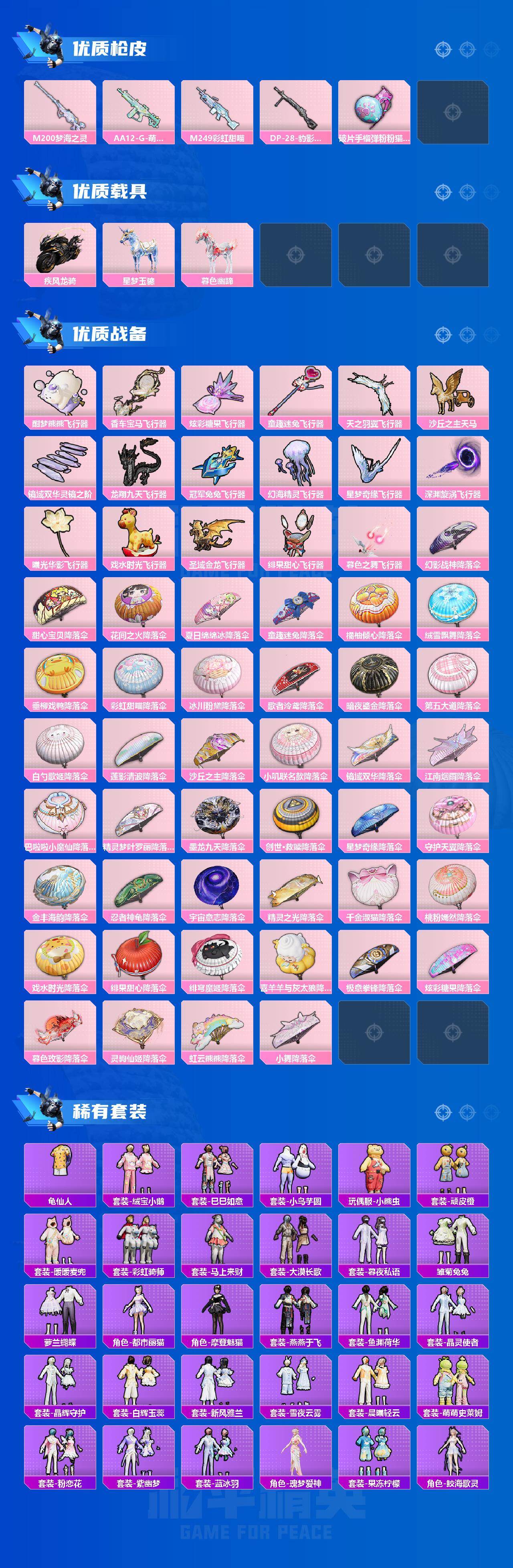 M416-墨龙九天,GROZA-精灵之光,UMP45-宇宙意志,P90-金丰海韵,Kar98K-巳巳如意,M24-莲影清波,M417-第五大道,M200-梦海之灵,M249-彩虹甜喵,破片手榴弹-粉粉猫爪