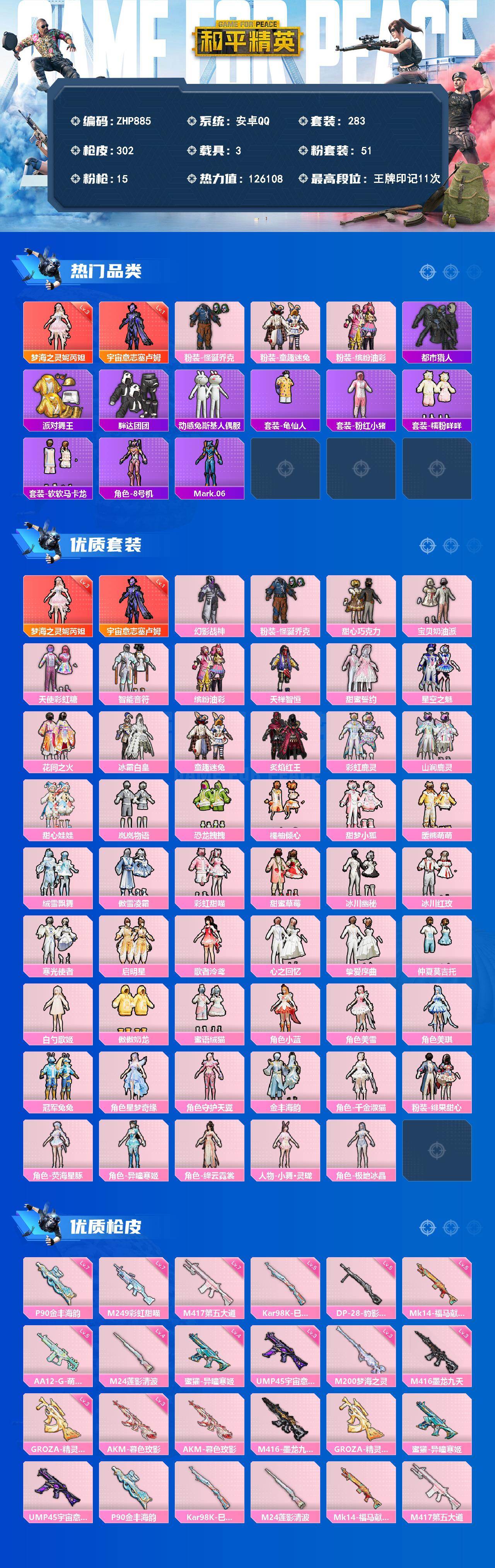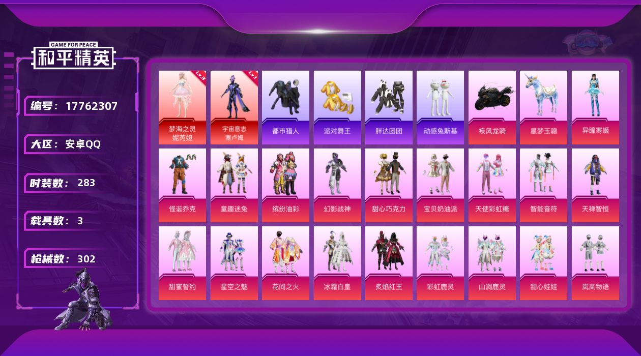 [17762307]安卓 手Q-2神装-51粉装-15特效枪-3载具-19粉色飞行器-126108热力值-11王牌印记-283套装-302枪皮 【红色神装等级】:宇宙意志-塞卢姆(一级),梦海之灵-妮芮妲(三级) 【红色角色神装】:宇宙意志-塞卢姆,梦海之灵-妮芮妲 【热门品类】:粉装-怪诞乔克,粉装-童趣迷兔,粉装-缤纷油彩,套装-都市猎人,套装-派对舞王,套装-胖达团团,套装-动感兔斯基人偶服,套装-龟仙人,套装-粉红小猪,套装-糯粉咩咩,套装-软软马卡龙,角色-8号机,角色-Mark.06 【粉色套装】:粉装-幻影战神,粉装-怪诞乔克,粉装-甜心巧克力,粉装-宝贝奶油派,粉装-天使彩虹糖,粉装-智能音符,粉装-缤纷油彩,粉装-天禅智恒,粉装-甜蜜誓约,粉装-星空之魅,粉装-花间之火,粉装-冰霜白皇,粉装-童趣迷兔,粉装-炙焰红王,粉装-彩虹鹿灵,粉装-山涧鹿灵,粉装-甜心娃娃,粉装-岚岚物语,粉装-恐龙拽拽,粉装-橘柚倾心,粉装-甜梦小狐,粉装-暖熊萌萌,粉装-绒雪飘舞,粉装-傲雪凌霜,粉装-彩虹甜喵,粉装-甜蜜草莓,粉装-冰川幽秘,粉装-冰川红玫,粉装-寒光使者,粉装-启明星,角色-歌者泠鸢,粉装-心之回忆,粉装-挚爱序曲,粉装-仲夏莫吉托,角色-白勺歌姬,粉装-傲傲奶龙,粉装-蜜语绒猫,角色-小蓝,角色-美雪,角色-美琪,粉装-冠军兔兔,角色-星梦奇缘,角色-守护天翼,粉装-金丰海韵,角色-千金淑猫,粉装-绯果甜心,角色-荧海星豚,角色-异瞳寒姬,角色-绛云霓裳,人物-小舞·灵珑,角色-极地冰晶 【粉色枪皮等级】:AKM-暮色玫影(三级),M416-墨龙九天(三级),GROZA-精灵之光(三级),蜜獾-异瞳寒姬(四级),UMP45-宇宙意志(三级),P90-金丰海韵(七级),Kar98K-巳巳如意(五级),M24-莲影清波(四级),Mk14-福马献瑞(五级),M417-第五大道(七级),M200-梦海之灵(三级),AA12-G-萌骑幻想(五级),M249-彩虹甜喵(七级),DP-28-豹影疾电(五级) 【粉色载具】:疾风龙骑,星梦玉骢,暮色幽蹄 【粉色枪皮】:AKM-暮色玫影,M416-墨龙九天,GROZA-精灵之光,蜜獾-异瞳寒姬,UMP45-宇宙意志,P90-金丰海韵,Kar98K-巳巳如意,M24-莲影清波,Mk14-福马献瑞,M417-第五大道,M200-梦海之灵,
