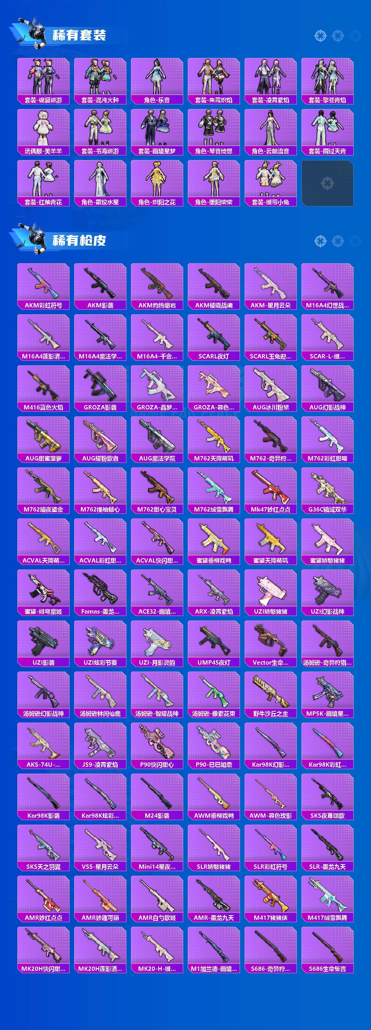 【粉色枪皮】:AKM-暮色玫影,M416-墨龙九天,GROZA-精灵之光,蜜獾-异瞳寒姬,UMP45-宇宙意志,P90-金丰海韵,Kar98K-巳巳如意,M24-莲影清波,Mk14-福马献瑞,M417-第五大道,M200-梦海之灵,