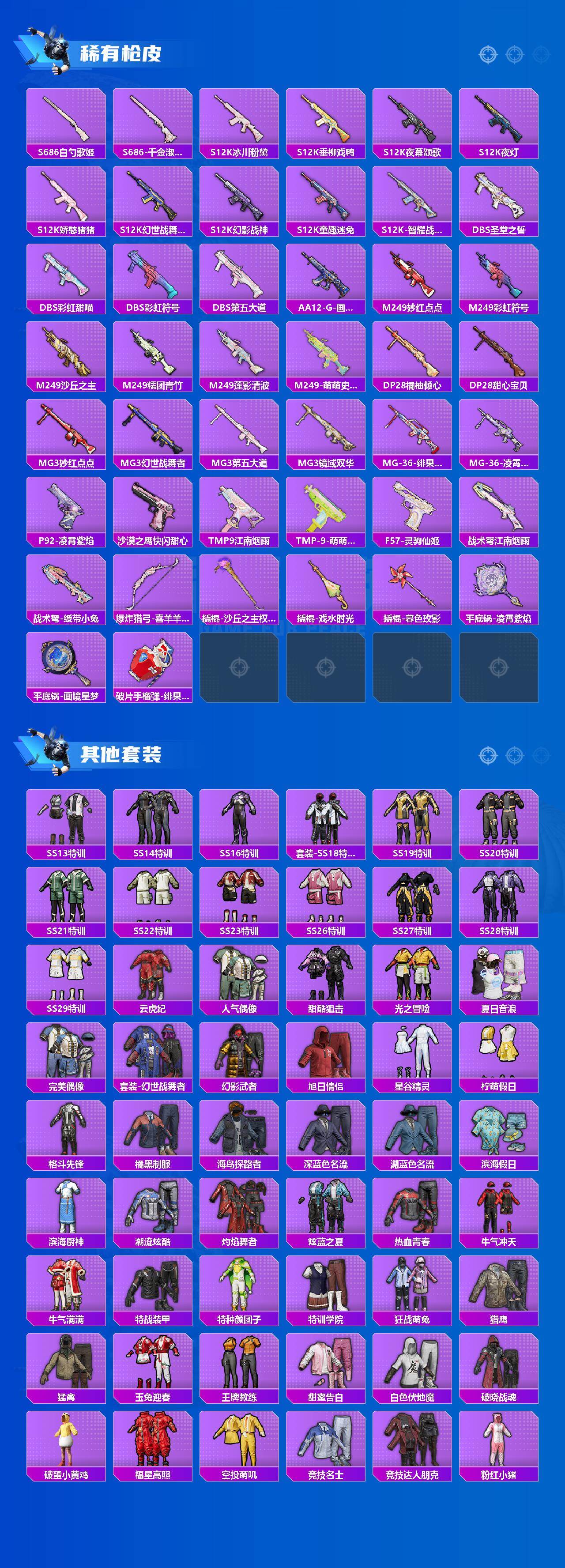 - [17429109]【特价出售/店主推荐】117m总资产-13719k哈伏币-60烽火等级-白银-1战场等级-无军衔 【干员外观】:骇爪-维什戴尔,红狼-电锯惊魂 【近战皮肤】:近战-黑鹰 【传说外观】:M4A1突击步枪-阿米娅,SCAR-H战斗步枪-启航,G3战斗步枪-骑士,KC17突击步枪-电锯惊魂,R93狙击步枪-维什戴尔 【史诗外观】:QBZ95-1突击步枪-曙光,AUG突击步枪-蝮蛇,腾龙突击步枪-猎鳄行动,MP5冲锋枪-深海恐惧,MP5冲锋枪-战术竞备,SVD狙击步枪-阿萨拉工艺,M700狙击步枪-哈夫克警备 【稀有外观】:M7战斗步枪-捣蛋鬼,SCAR-H战斗步枪-荣耀列队,腾龙突击步枪-冰天雪地,MP5冲锋枪-哈夫克卫队,MP5冲锋枪-精英联盟,P90冲锋枪-黄昏,P90冲锋枪-捣蛋鬼,UZI冲锋枪-亚特兰蒂斯,SMG-45-行动开启,勇士冲锋枪-冰天雪地,M1014霰弹枪-幻影结构,QJB201轻机枪-哈夫克卫队,Mini-14射手步枪-荣耀列队,SKS射手步枪-弄臣,SV-98狙击步枪-星链科技,SV-98狙击步枪-哈夫克航天,SV-98狙击步枪-精英联盟,G18-精英联盟 【普通外观】:M4A1突击步枪-粉色涂装,QBZ95-1突击步枪-高雅黑,QBZ95-1突击步枪-海浪,QBZ95-1突击步枪-海色,QBZ191突击步枪-三角洲力量,K416突击步枪-几何迷彩,K416突击步枪-高雅黑,M16A4突击步枪-高雅黑,AUG突击步枪-浅蓝涂装,M7战斗步枪-红色涂装,SG552突击步枪-三角洲力量,SG552突击步枪-浅蓝涂装,SG552突击步枪-海浪,SCAR-H战斗步枪-数码迷彩,G3战斗步枪-高雅黑,PTR-32突击步枪-黄蜂,MP5冲锋枪-海色,MP5冲锋枪-黄蜂,P90冲锋枪-三角洲力量,Vector冲锋枪-几何迷彩,UZI冲锋枪-海色,野牛冲锋枪-高雅黑,SR-3M紧凑突击步枪-三角洲力量,QCQ171冲锋枪-三角洲力量,M1014霰弹枪-高雅黑,M1014霰弹枪-海浪,M249轻机枪-黄蜂,M250通用机枪-条纹,QJB201轻机枪-三角洲力量,SVD狙击步枪-高雅黑,SKS射手步枪-三角洲力量,SR-25射手步枪-黄蜂,SV-98狙击步枪-红色涂装,QSZ92G-条纹,沙漠之鹰-海浪,沙漠之鹰-高雅黑 【载具外观】:轮式突击炮-荣耀 【挂饰】:挂