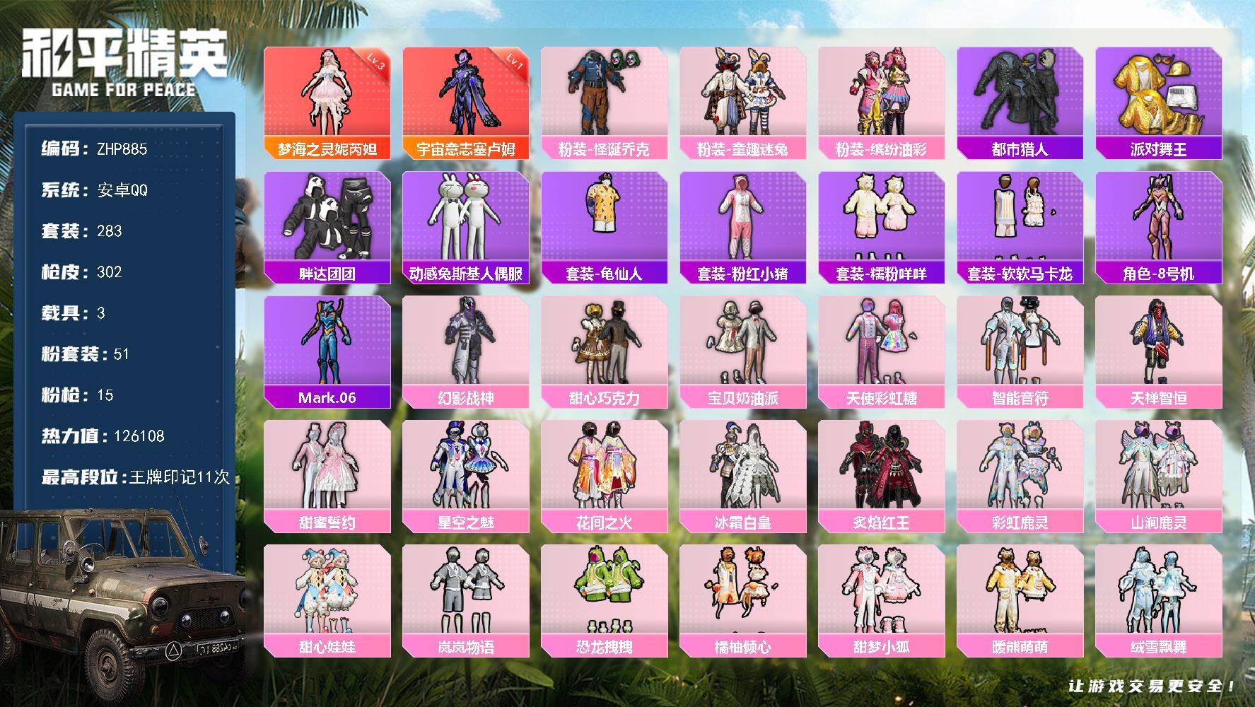 [17762307]安卓 手Q-2神装-51粉装-15特效枪-3载具-19粉色飞行器-126108热力值-11王牌印记-283套装-302枪皮