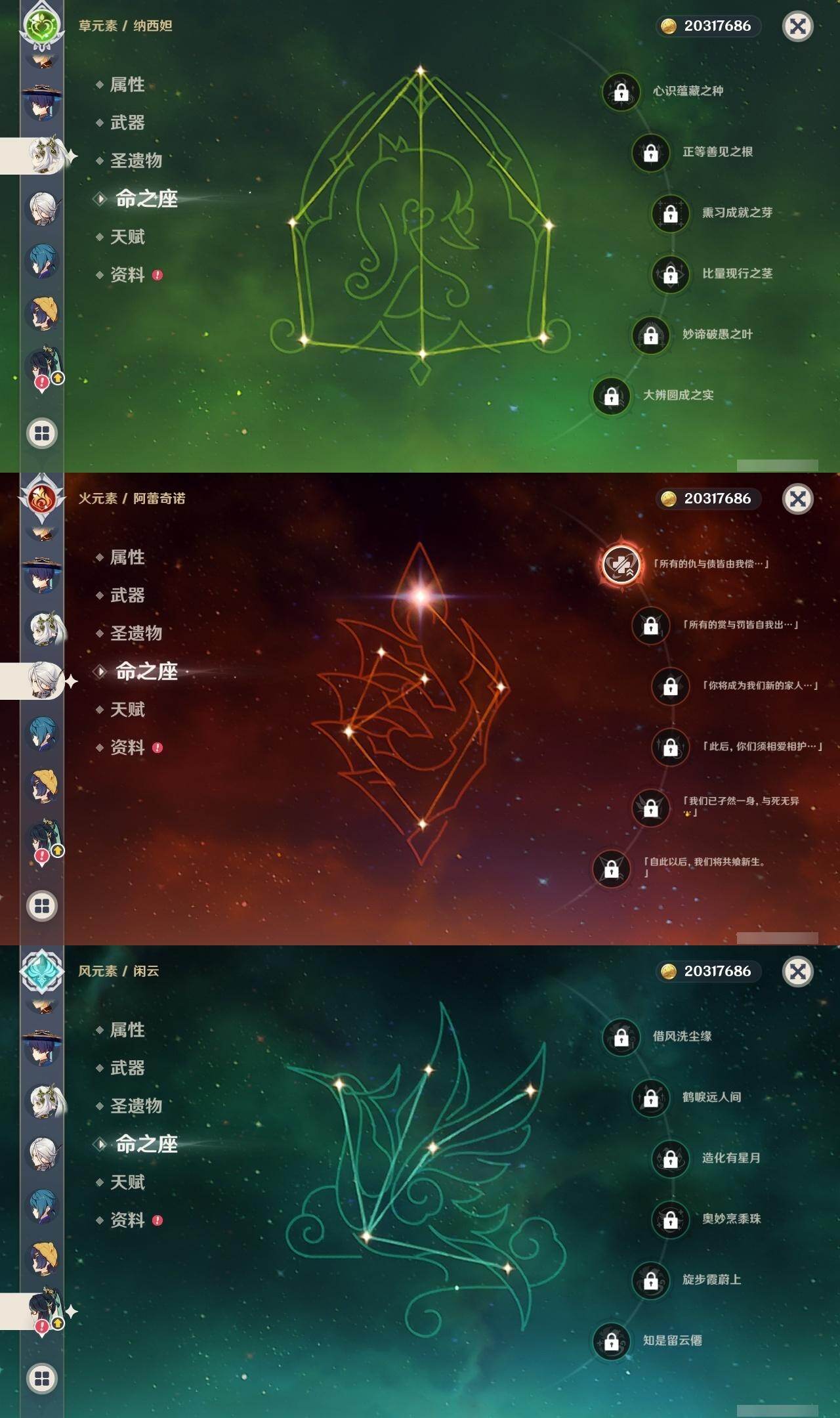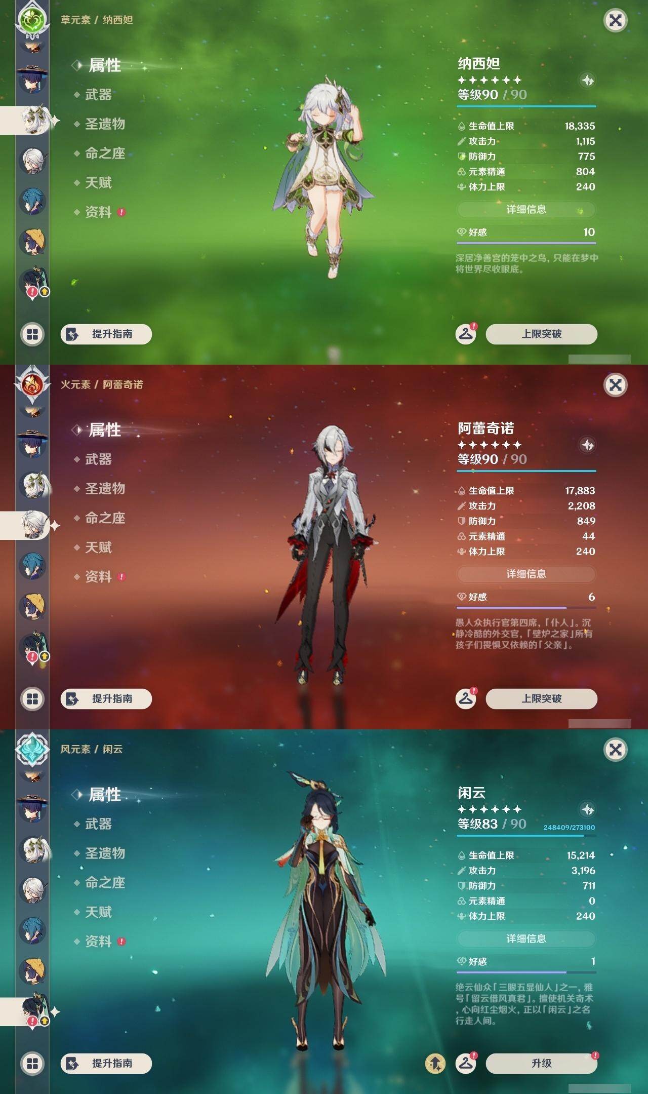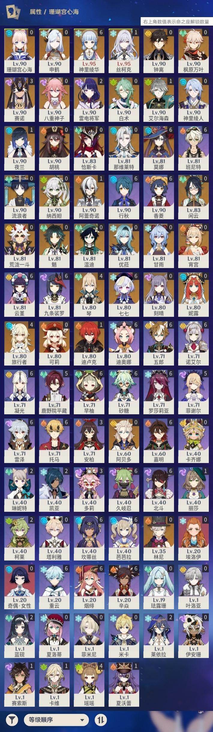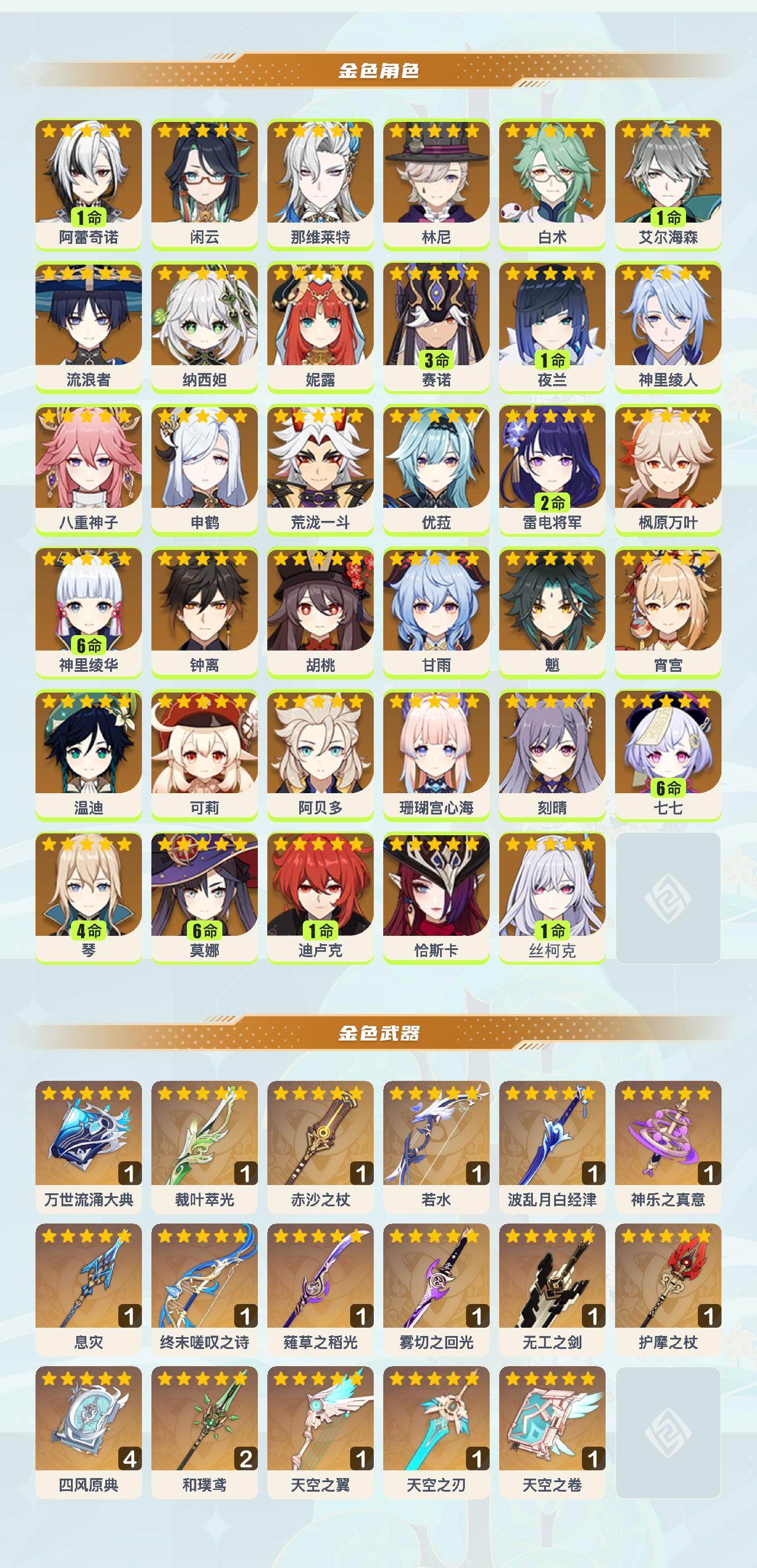 1命阿蕾奇诺,0命闲云,0命那维莱特,0命林尼,0命白术,1命艾尔海森,0命流浪者,0命纳西妲,0命妮露,3命赛诺,1命夜兰,0命神里绫人,0命八重神子,0命申鹤,0命荒泷一斗,0命优菈,2命雷电将军,0命枫原万叶,满命神里绫华,0命钟离,0命胡桃,0命甘雨,0命魈,0命宵宫,0命温迪,0命可莉,0命阿贝多,0命珊瑚宫心海,0命刻晴,满命七七,4命琴,满命莫娜,1命迪卢克,0命恰斯卡,1命丝柯克,精1万世流涌大典,精1裁叶萃光,精1赤沙之杖,精1若水,精1波乱月白经津,精1神乐之真意,精1息灾,精1终末嗟叹之诗,精1薙草之稻光,精1雾切之回光,精1无工之剑,精1护摩之杖,精4四风原典,精2和璞鸢,精1天空之翼,精1天空之刃,精1天空之卷