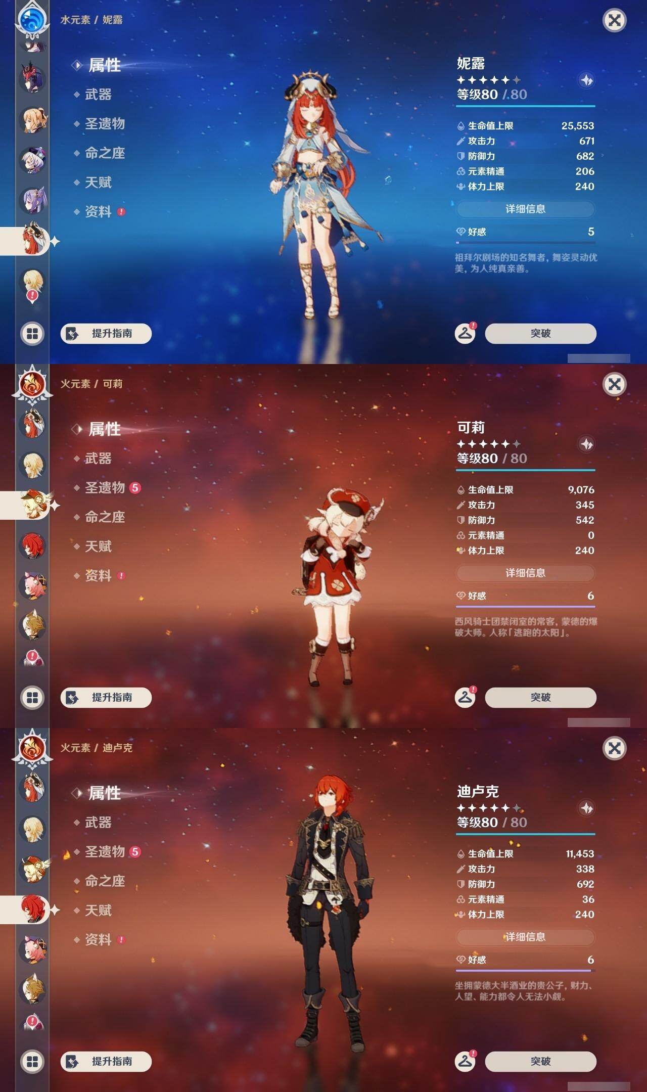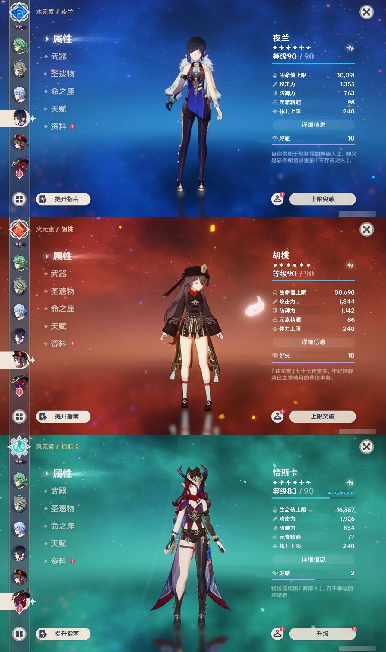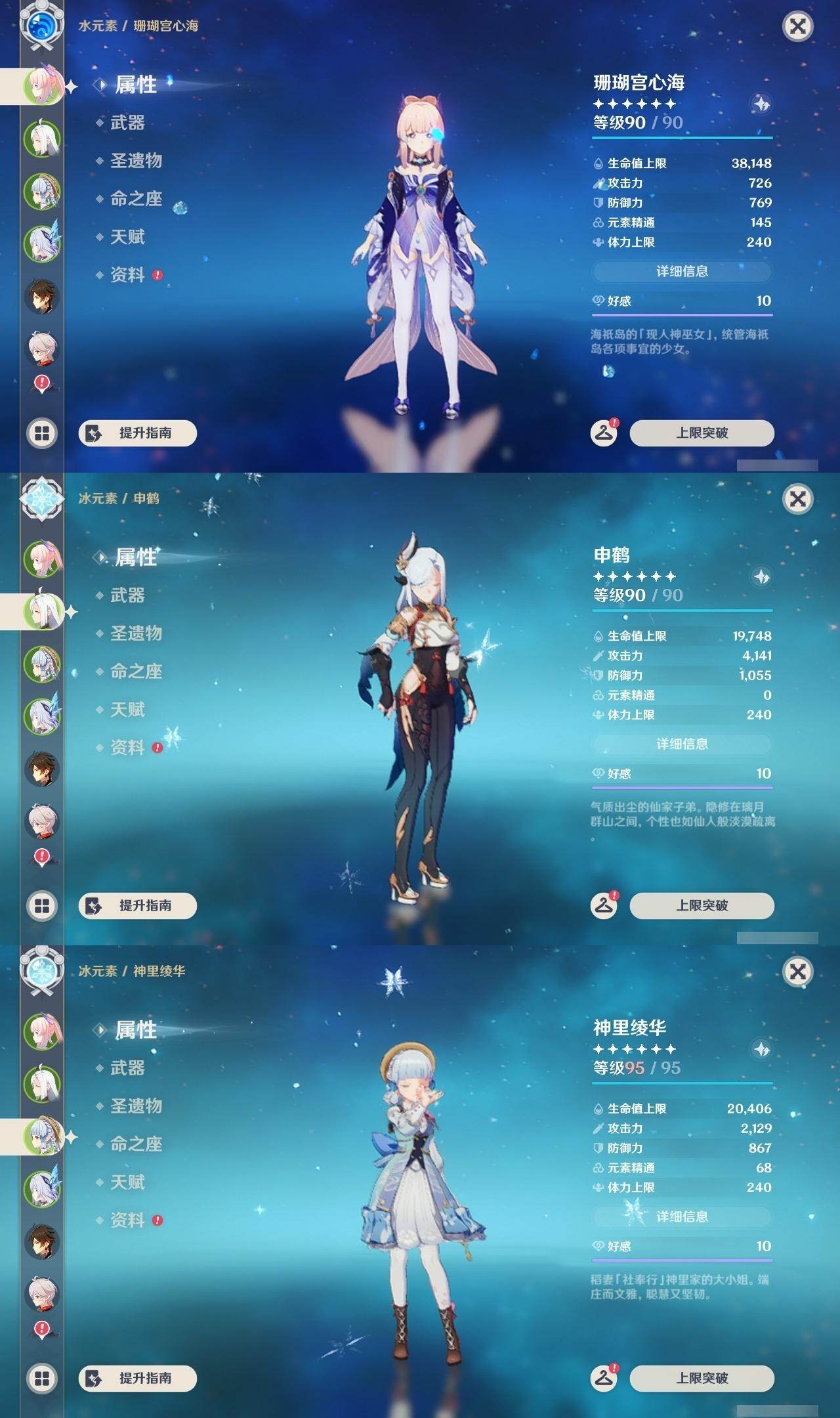 珊瑚宫心海,申鹤,神里凌华,钟离,枫原万叶,八重神子,雷电将军,胡桃,莫娜,荒泷一斗,魈,温迪,优菈,甘雨,宵宫,琴,七七,刻晴,可莉,迪卢克,阿贝多
