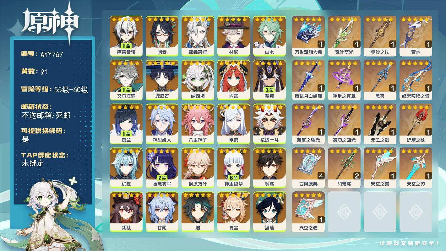 [17762943]60级/91黄/女主/35个五星角色/20个五星武器 1命阿蕾奇诺,0命闲云,0命那维莱特,0命林尼,0命白术,1命艾尔海森,0命流浪者,0命纳西妲,0命妮露,3命赛诺,1命夜兰,0命神里绫人,0命八重神子,0命申鹤,0命荒泷一斗,0命优菈,2命雷电将军,0命枫原万叶,满命神里绫华,0命钟离,0命胡桃,0命甘雨,0命魈,0命宵宫,0命温迪,0命可莉,0命阿贝多,0命珊瑚宫心海,0命刻晴,满命七七,4命琴,满命莫娜,1命迪卢克,0命恰斯卡,1命丝柯克,精1万世流涌大典,精1裁叶萃光,精1赤沙之杖,精1若水,精1波乱月白经津,精1神乐之真意,精1息灾,精1终末嗟叹之诗,精1薙草之稻光,精1雾切之回光,精1无工之剑,精1护摩之杖,精4四风原典,精2和璞鸢,精1天空之翼,精1天空之刃,精1天空之卷