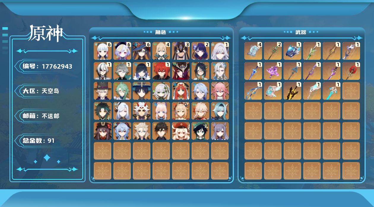 - [15187750]60级/280黄/女主/46个五星角色/42个五星武器 0命千织,0命闲云,0命娜维娅,0命芙宁娜,0命莱欧斯利,0命那维莱特,0命白术,4命迪希雅,0命艾尔海森,4命流浪者,满命纳西妲,满命妮露,0命赛诺,满命提纳里,满命夜兰,0命神里绫人,满命八重神子,2命申鹤,满命荒泷一斗,满命雷电将军,2命枫原万叶,满命神里绫华,满命钟离,满命胡桃,满命甘雨,0命魈,满命宵宫,0命温迪,0命可莉,满命达达利亚,0命阿贝多,0命珊瑚宫心海,满命刻晴,满命七七,满命琴,满命莫娜,满命迪卢克,2命希诺宁,0命玛拉妮,0命恰斯卡,0命玛薇卡,0命茜特菈莉,1命梦见月瑞希,0命菈乌玛,0命奈芙尔,0命杜林,精1有乐御簾切,精1鹤鸣余音,精1裁断,精1静水流涌之辉,精1万世流涌大典,精1裁叶萃光,精5图莱杜拉的回忆,精5千夜浮梦,精3赤沙之杖,精2圣显之钥,精2猎人之径,精3若水,精3波乱月白经津,精5神乐之真意,精5息灾,精5赤角石溃杵,精1终末嗟叹之诗,精5冬极白星,精5薙草之稻光,精5飞雷之弦振,精4雾切之回光,精5护摩之杖,精1磐岩结绿,精1和璞鸢,精5天空之脊,精1贯虹之槊,精2天空之翼,精5阿莫斯之弓,精4天空之刃,精1斫峰之刃,精5天空之卷,精1风鹰剑,精1狼的末路,精3天空之傲,精1岩峰巡歌,精1冲浪时光