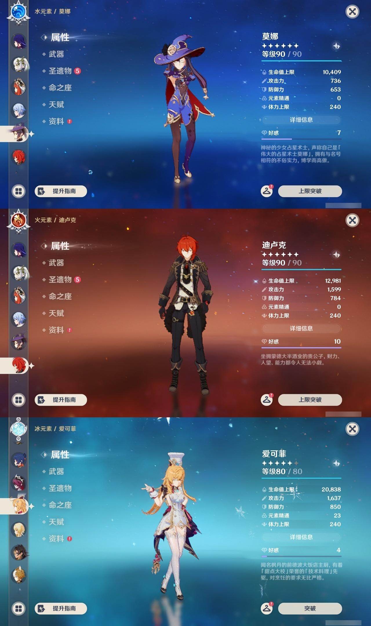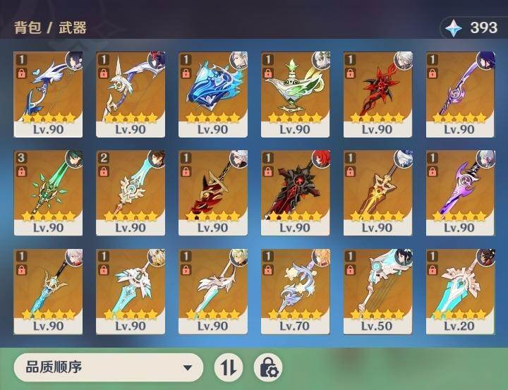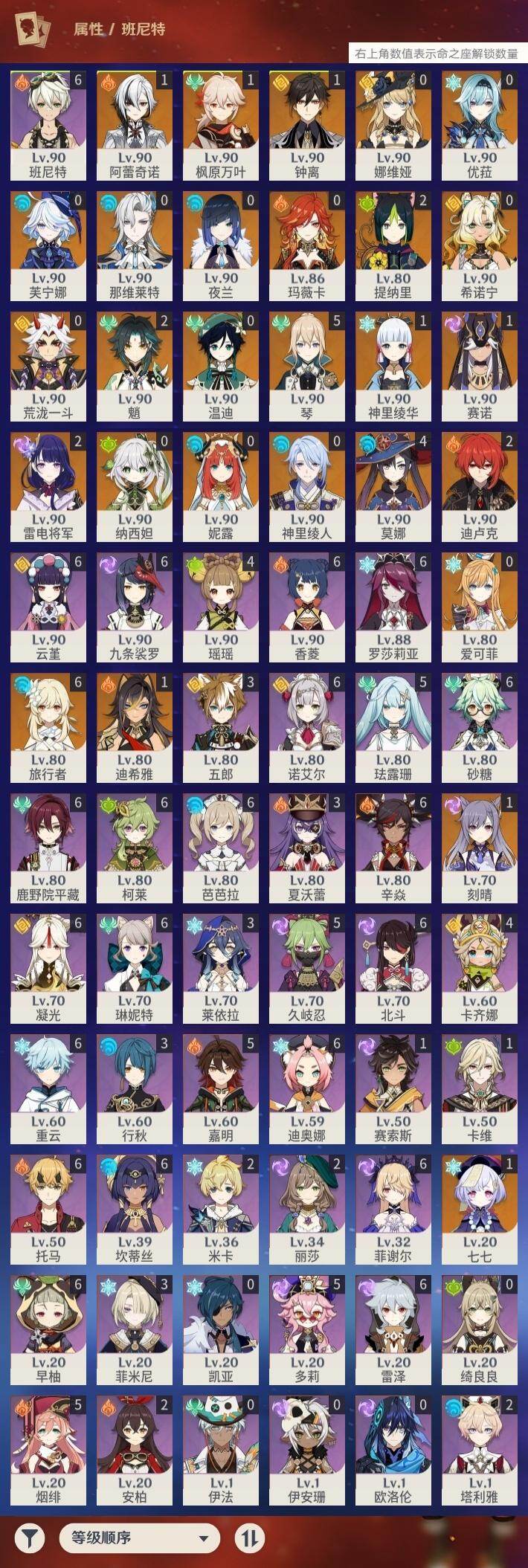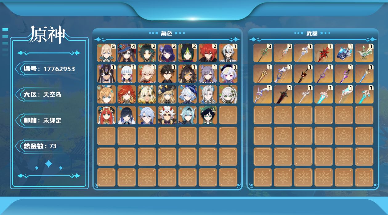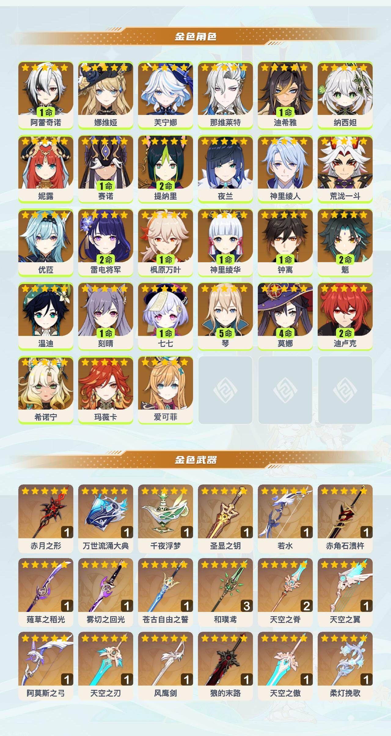 1命阿蕾奇诺,0命娜维娅,0命芙宁娜,0命那维莱特,1命迪希雅,0命纳西妲,0命妮露,1命赛诺,2命提纳里,0命夜兰,0命神里绫人,0命荒泷一斗,0命优菈,2命雷电将军,1命枫原万叶,1命神里绫华,1命钟离,2命魈,0命温迪,1命刻晴,1命七七,5命琴,4命莫娜,2命迪卢克,0命希诺宁,0命玛薇卡,0命爱可菲,精1赤月之形,精1万世流涌大典,精1千夜浮梦,精1圣显之钥,精1若水,精1赤角石溃杵,精1薙草之稻光,精1雾切之回光,精1苍古自由之誓,精3和璞鸢,精2天空之脊,精1天空之翼,精1阿莫斯之弓,精1天空之刃,精1风鹰剑,精1狼的末路,精1天空之傲,精1柔灯挽歌