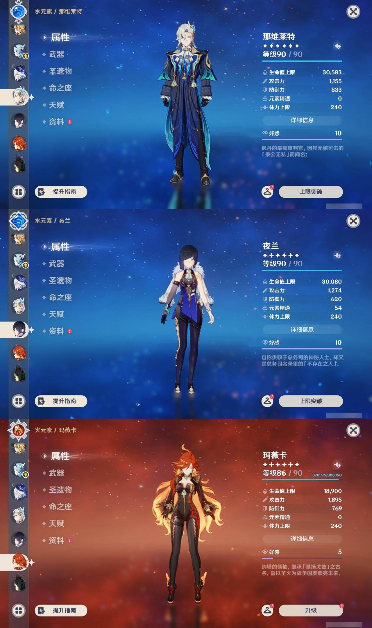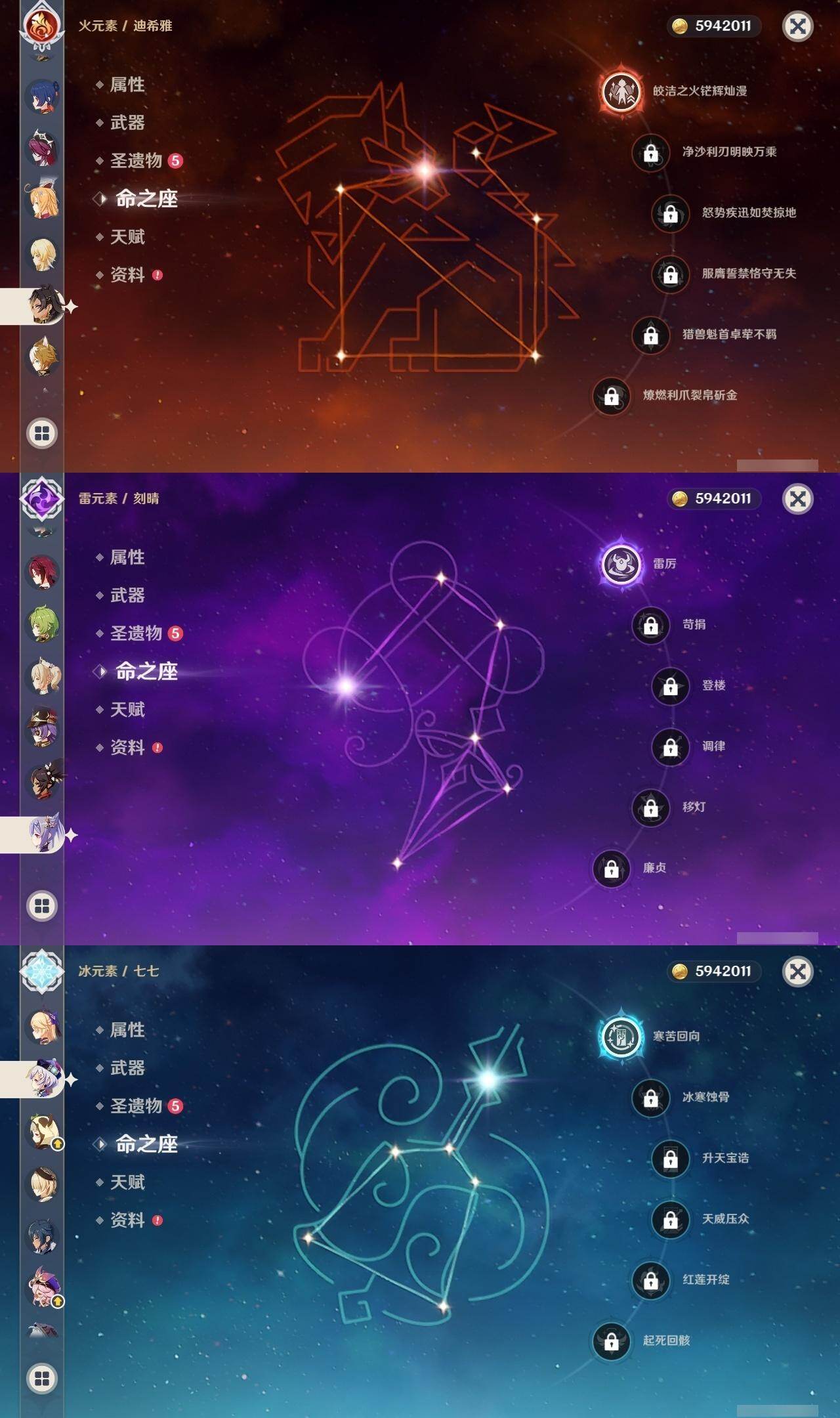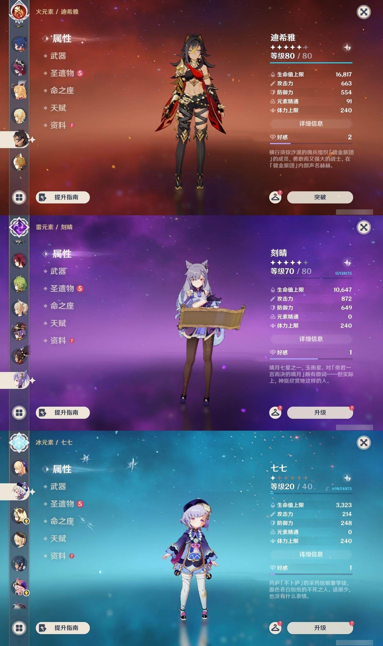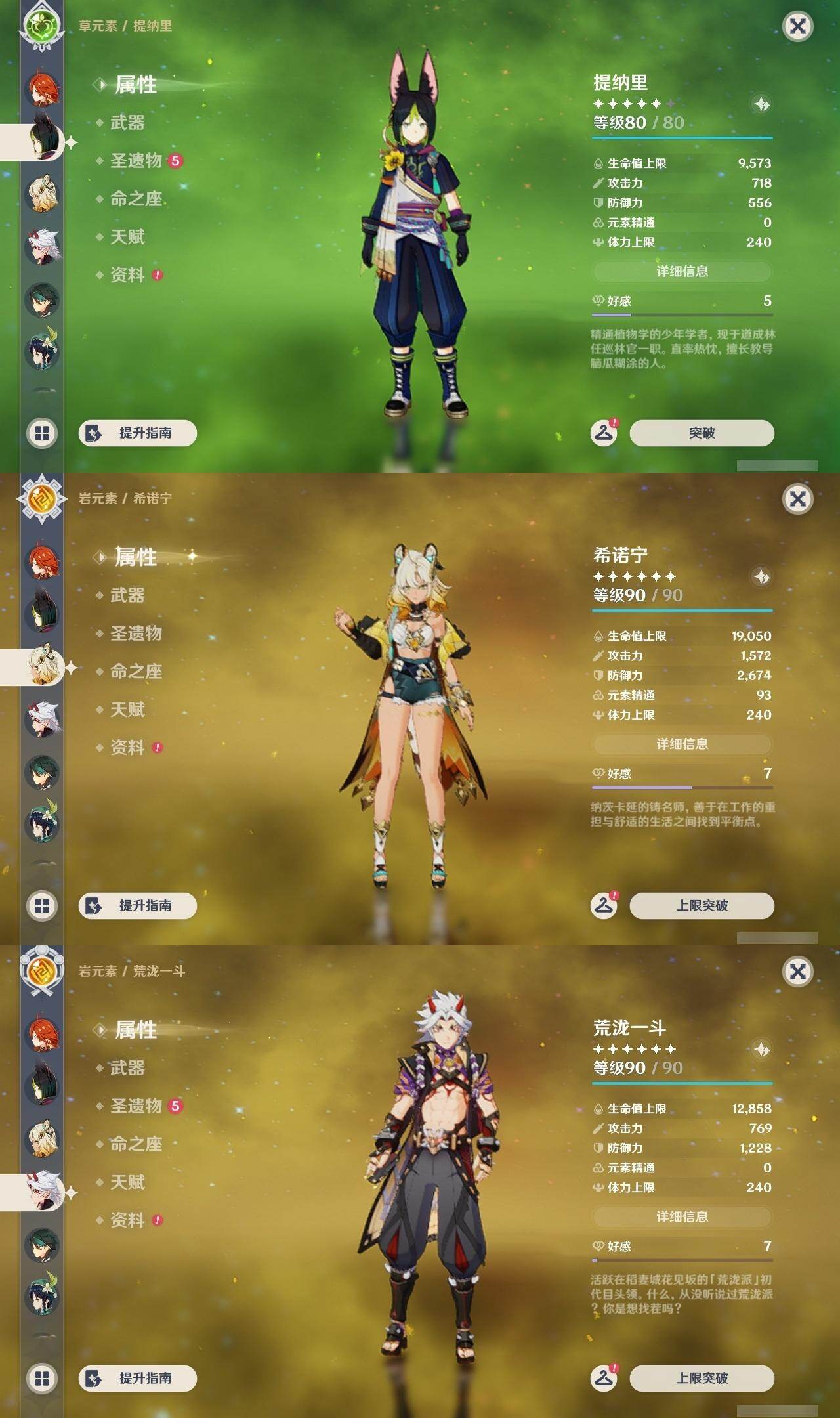 1命阿蕾奇诺,0命娜维娅,0命芙宁娜,0命那维莱特,1命迪希雅,0命纳西妲,0命妮露,1命赛诺,2命提纳里,0命夜兰,0命神里绫人,0命荒泷一斗,0命优菈,2命雷电将军,1命枫原万叶,1命神里绫华,1命钟离,2命魈,0命温迪,1命刻晴,1命七七,5命琴,4命莫娜,2命迪卢克,0命希诺宁,0命玛薇卡,0命爱可菲,精1赤月之形,精1万世流涌大典,精1千夜浮梦,精1圣显之钥,精1若水,精1赤角石溃杵,精1薙草之稻光,精1雾切之回光,精1苍古自由之誓,精3和璞鸢,精2天空之脊,精1天空之翼,精1阿莫斯之弓,精1天空之刃,精1风鹰剑,精1狼的末路,精1天空之傲,精1柔灯挽歌