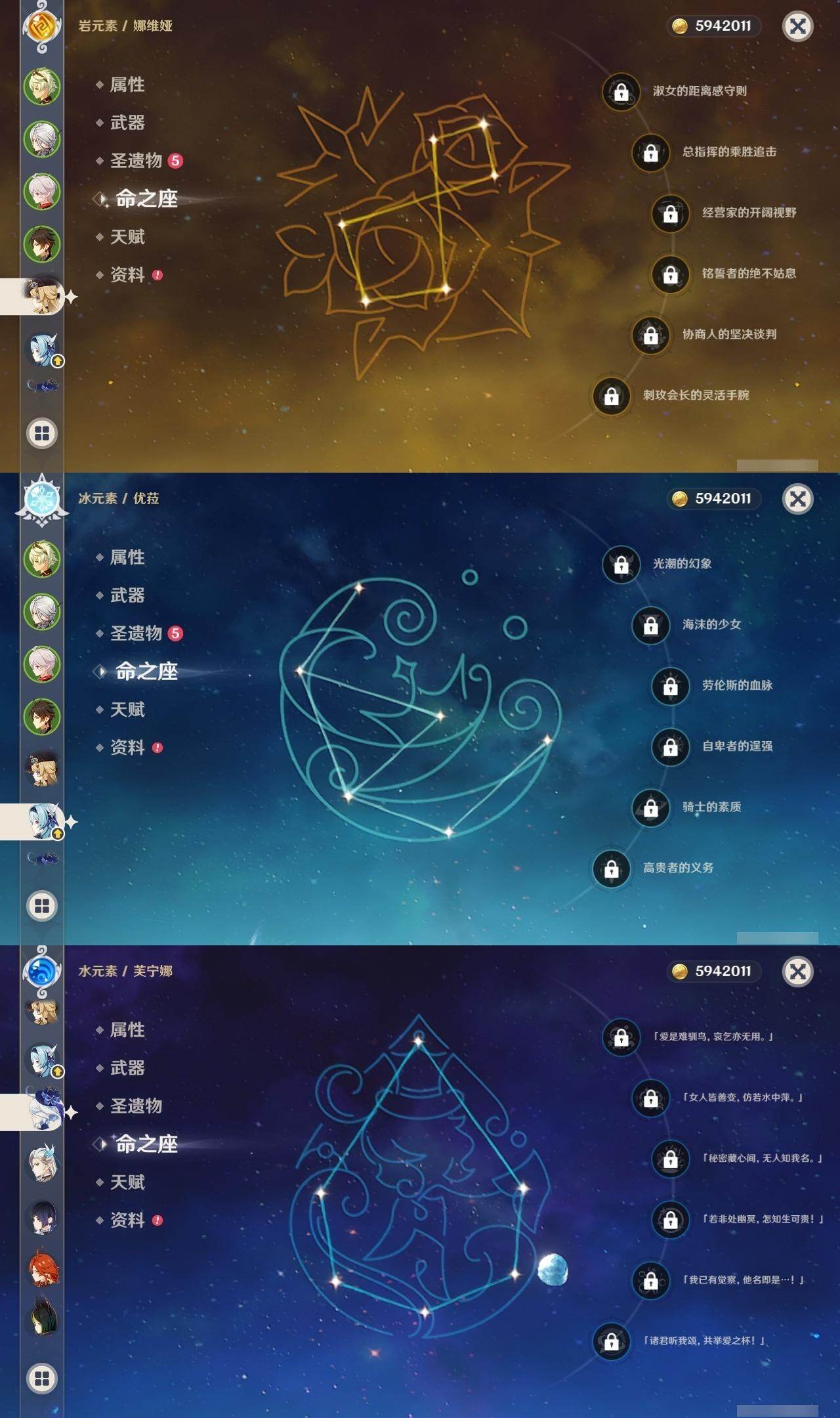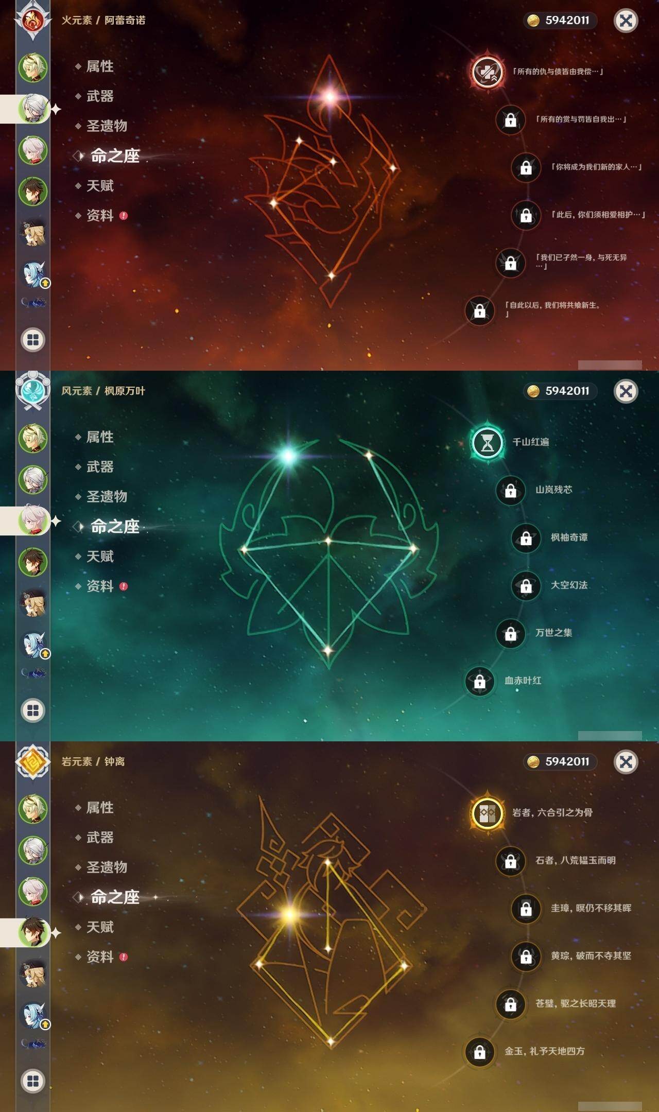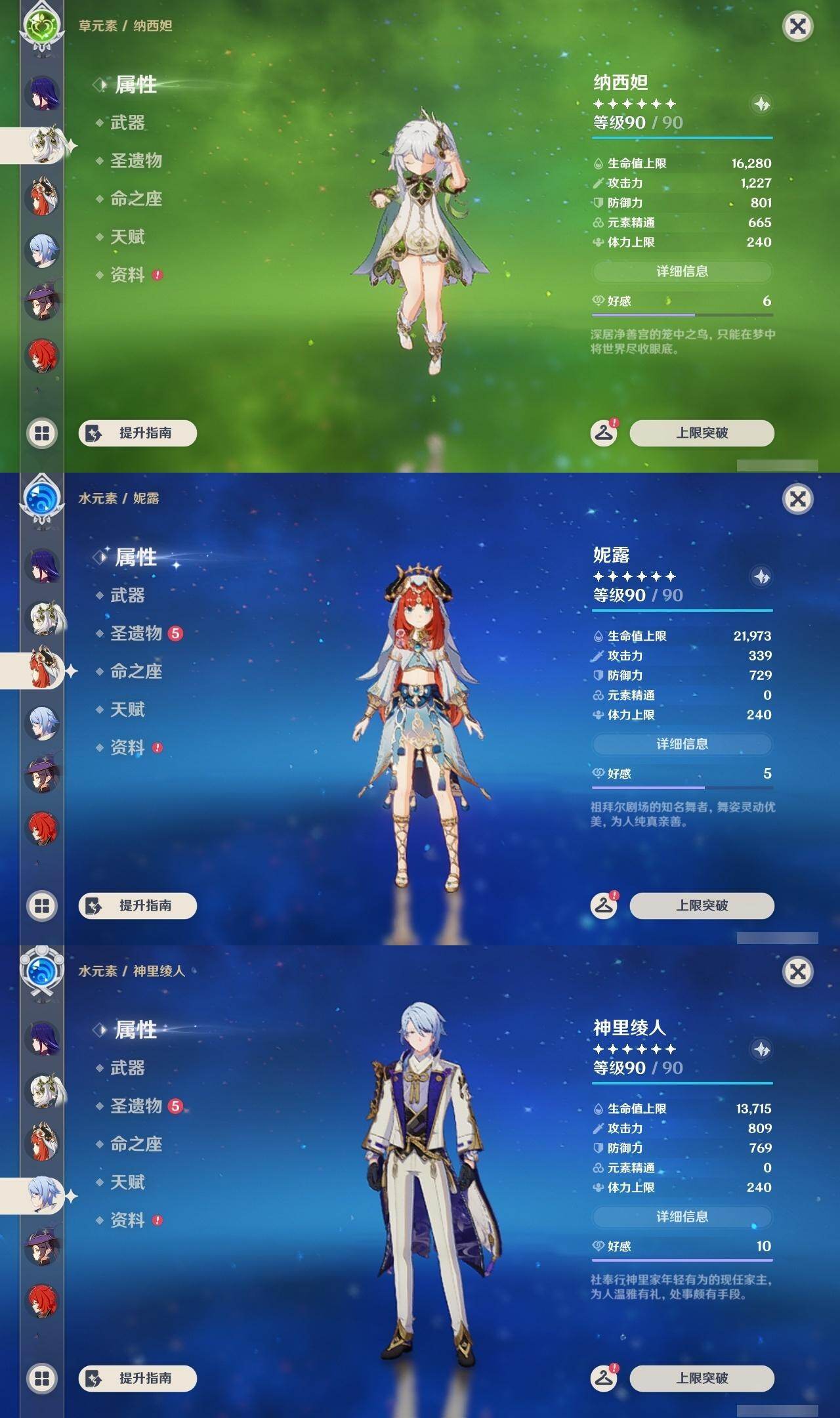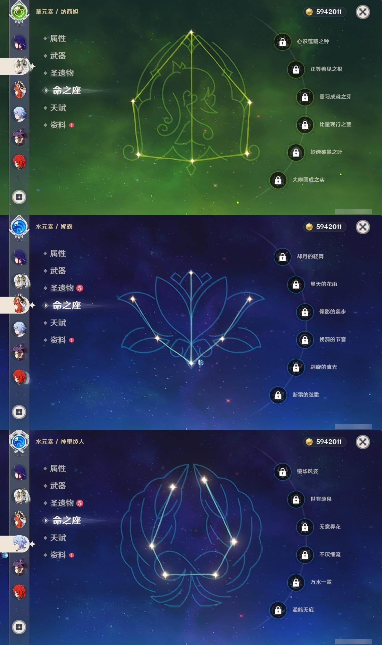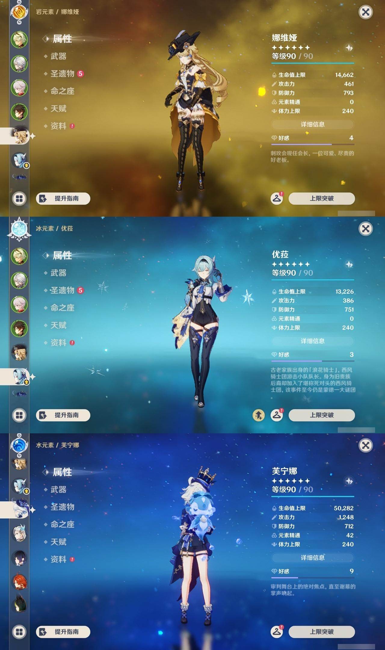 1命阿蕾奇诺,0命娜维娅,0命芙宁娜,0命那维莱特,1命迪希雅,0命纳西妲,0命妮露,1命赛诺,2命提纳里,0命夜兰,0命神里绫人,0命荒泷一斗,0命优菈,2命雷电将军,1命枫原万叶,1命神里绫华,1命钟离,2命魈,0命温迪,1命刻晴,1命七七,5命琴,4命莫娜,2命迪卢克,0命希诺宁,0命玛薇卡,0命爱可菲,精1赤月之形,精1万世流涌大典,精1千夜浮梦,精1圣显之钥,精1若水,精1赤角石溃杵,精1薙草之稻光,精1雾切之回光,精1苍古自由之誓,精3和璞鸢,精2天空之脊,精1天空之翼,精1阿莫斯之弓,精1天空之刃,精1风鹰剑,精1狼的末路,精1天空之傲,精1柔灯挽歌