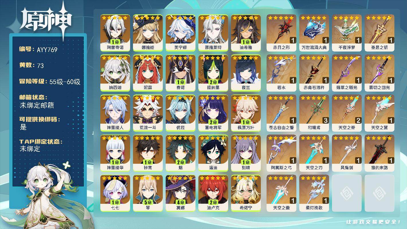 [17762953]60级/73黄/女主/27个五星角色/18个五星武器 1命阿蕾奇诺,0命娜维娅,0命芙宁娜,0命那维莱特,1命迪希雅,0命纳西妲,0命妮露,1命赛诺,2命提纳里,0命夜兰,0命神里绫人,0命荒泷一斗,0命优菈,2命雷电将军,1命枫原万叶,1命神里绫华,1命钟离,2命魈,0命温迪,1命刻晴,1命七七,5命琴,4命莫娜,2命迪卢克,0命希诺宁,0命玛薇卡,0命爱可菲,精1赤月之形,精1万世流涌大典,精1千夜浮梦,精1圣显之钥,精1若水,精1赤角石溃杵,精1薙草之稻光,精1雾切之回光,精1苍古自由之誓,精3和璞鸢,精2天空之脊,精1天空之翼,精1阿莫斯之弓,精1天空之刃,精1风鹰剑,精1狼的末路,精1天空之傲,精1柔灯挽歌