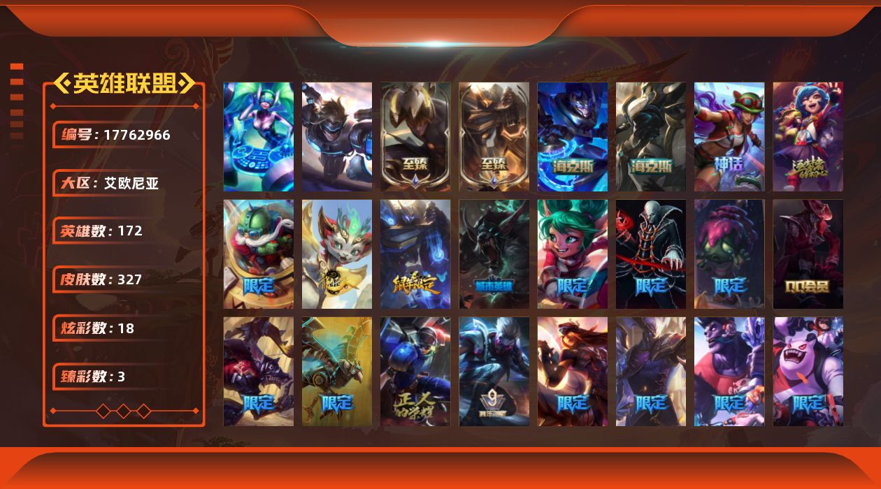 [17762966]黑铁段位-172英雄-327皮肤-18炫彩-2终极-7神话-29限定-25传说-87史诗