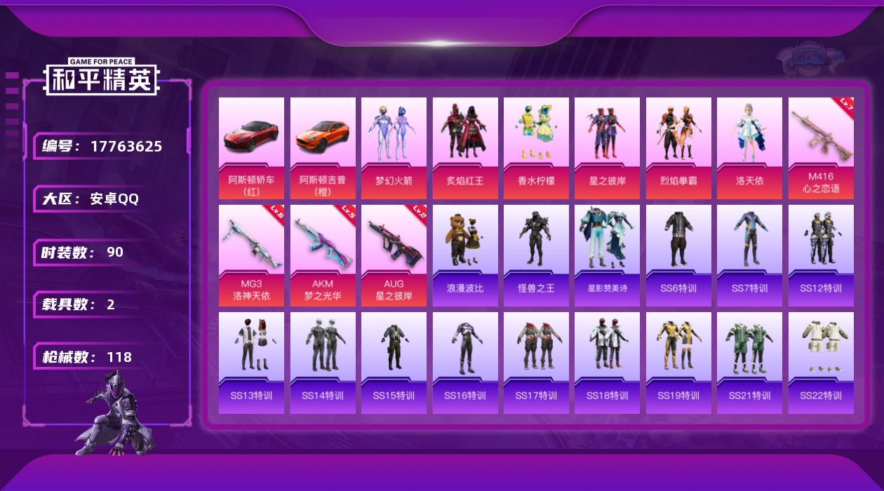 [17763625]安卓 手Q-6粉装-6特效枪-2载具-3粉色飞行器-43770热力值-6王牌印记-90套装-118枪皮