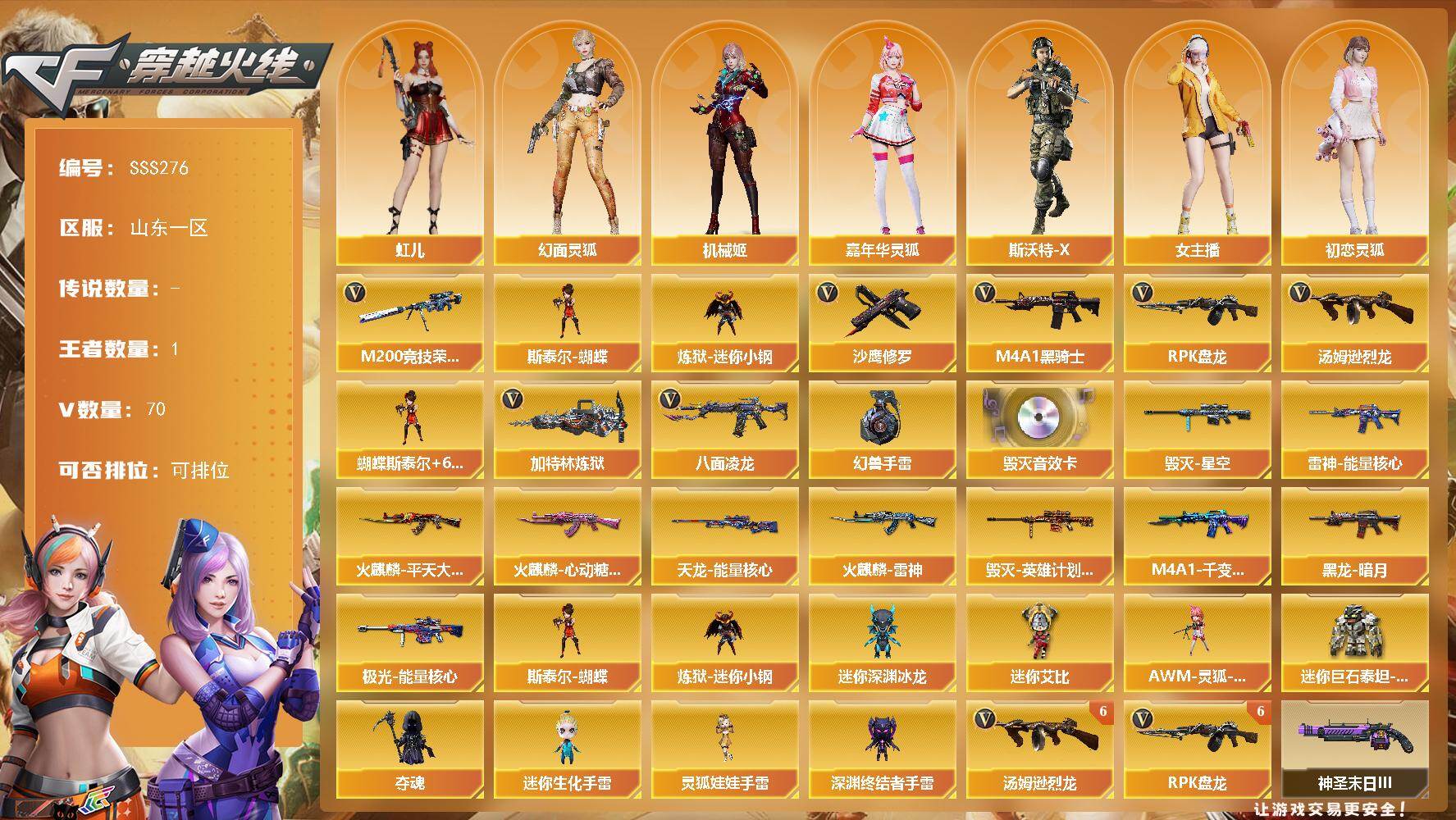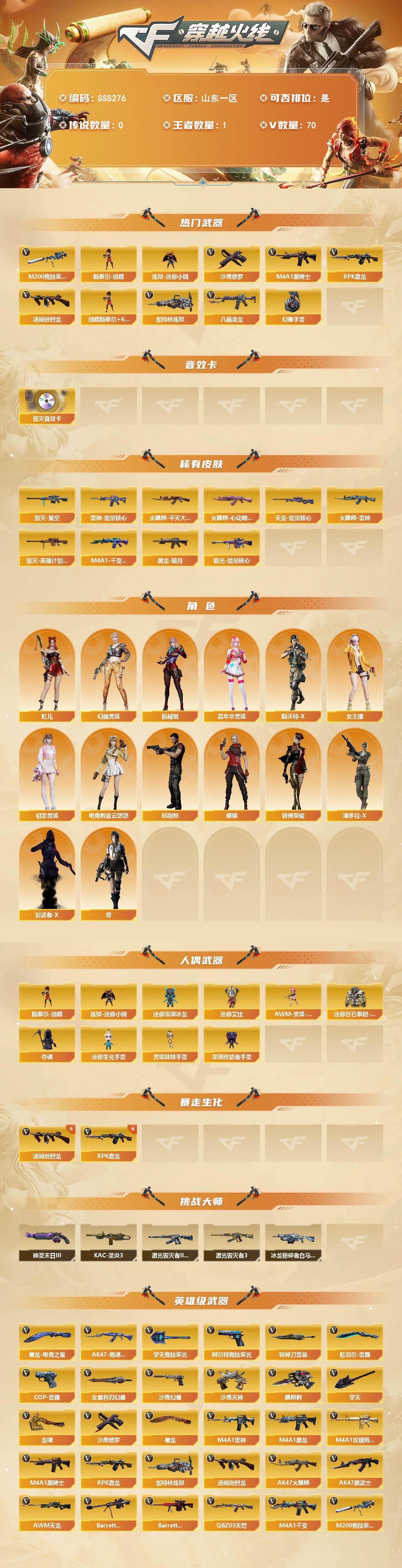 [17764518]山东一区-74V-1王者武器数-0炫金武器数 【热门武器】:M200-竞技荣光,八面凌龙,炼狱-迷你小钢,M4A1-黑骑士,汤姆逊-烈龙*6,RPK-盘龙*6,加特林-炼狱,斯泰尔-蝴蝶,沙鹰-修罗,高爆手雷-幻兽 【音效卡】:Barrett-毁灭音效卡 【皮肤】:雷神-能量核心,火麒麟-雷神*2,火麒麟-平天大圣,火麒麟-心动糖果,毁灭-星空,毁灭-英雄计划 皮肤,M4A1-千变-孔明皮肤,黑龙-暗月,天龙-能量核心,极光-能量核心 【角色】:零,电竞教官-云悠悠,机械姬,虹儿,幻面灵狐,初恋灵狐,嘉年华灵狐,娟娟,女主播,潘多拉-X,邱刚敖,斯沃特-X,铁骑荣耀,影武者-X 【人偶武器】:炼狱-迷你小钢,斯泰尔-蝴蝶,AWM-灵狐-15周年嘉年华,迷你深渊冰龙,夺魂,迷你生化手雷,深渊终结者手雷,迷你艾比,迷你巨石泰坦-魔花研究所,灵狐娃娃手雷 【挑战大师】:冰龙粉碎者-白马银枪,激光毁灭者III-白马银枪,激光毁灭者III,KAC-圣炎切割者III,神圣爆裂者-末日III 【英雄级武器】:M4A1-千变,AK47-火麒麟*2,M4A1-黑龙,M4A1-雷神*2,M4A1-黑骑士,AK47-黑武士,QBZ03-天罚,黑武士-锦绣游龙,八面凌龙,FAMAS G2-天戎,M4A1-玫瑰精灵,黑骑士-海王,HK417-朱雀-电竞之星,AWM-天龙,Barrett-毁灭,Barrett-极光,M200-竞技荣光,RPK-盘龙*6,加特林-炼狱,汤姆逊-烈龙*6,沙鹰-修罗,沙鹰-天神,COP-雷霆,COP 357-雷霆王者-觉醒版,柯尔特-竞技荣光,沙鹰-幻兽,屠龙*2,龙啸,擎天,麒麟刺,尼泊尔-雷霆,擎天-竞技荣光,斩神刀-雷暴,女皇利刃-幻兽,屠龙-电竞之星,高爆手雷-雷霆,高爆手雷-幻兽,高爆手雷-雷暴,高爆手雷-竞技荣光*2,高爆手雷-神工天巧,闪光弹-雷霆,闪光弹-幻兽,闪光弹-雷暴,闪光弹-竞技荣光*2,闪光弹-神工天巧,烟雾弹-雷霆,烟雾弹-幻兽,烟雾弹-雷暴,烟雾弹-竞技荣光*2,烟雾弹-神工天巧,AK47-竞魂无影 【源级武器】:源-千变,源·火麒麟*2,魂·火麒麟-百城,御·火麒麟-平天大圣,火麒麟-雷神*2,源-黑龙,御·黑龙-龙太子,源·雷神*2,魂-雷神-萌杀,魂·雷神-15周年嘉年华,御·雷神-机甲刑天,御·雷神-烈虎,雷神-赛博幻想,雷