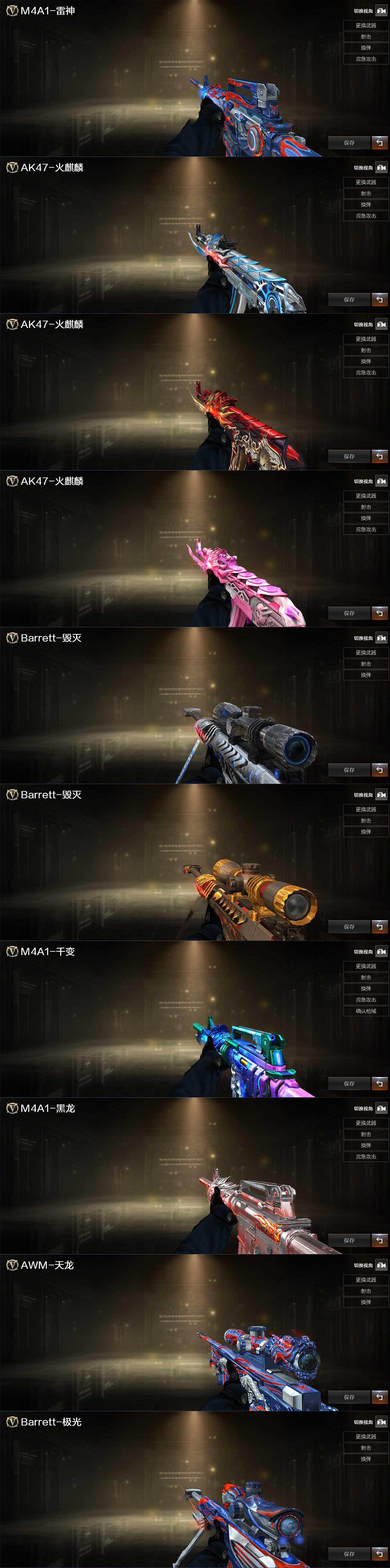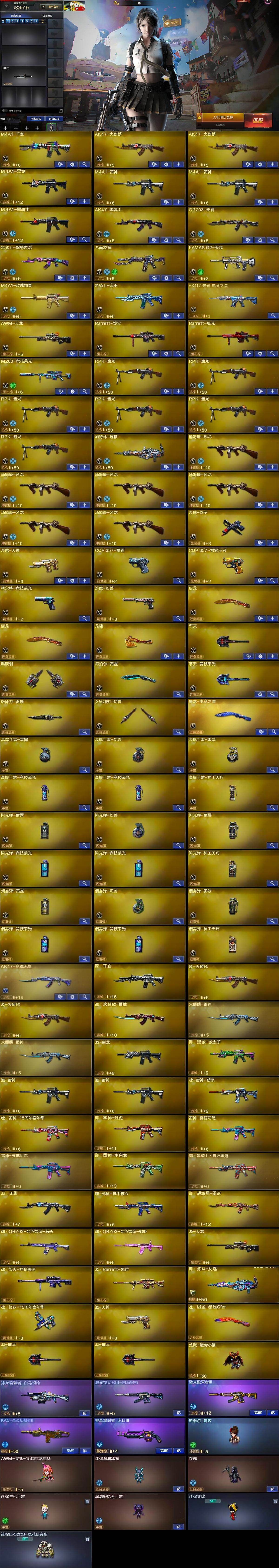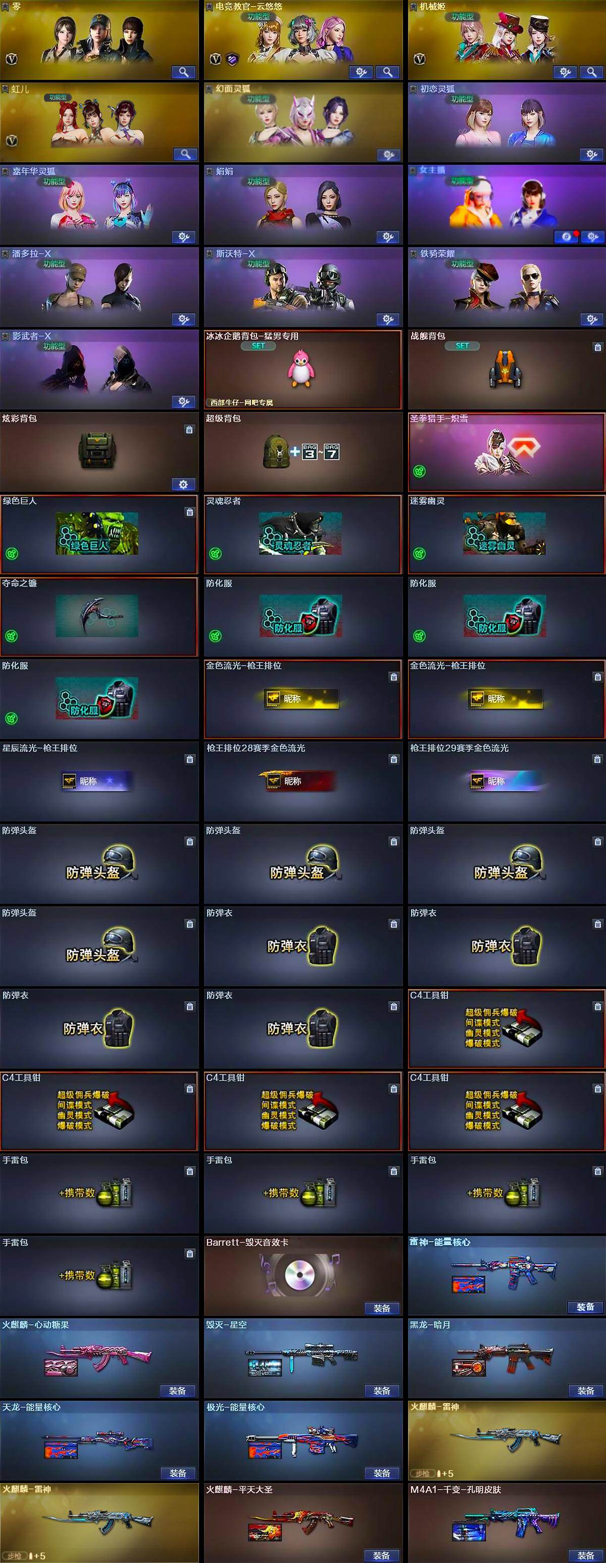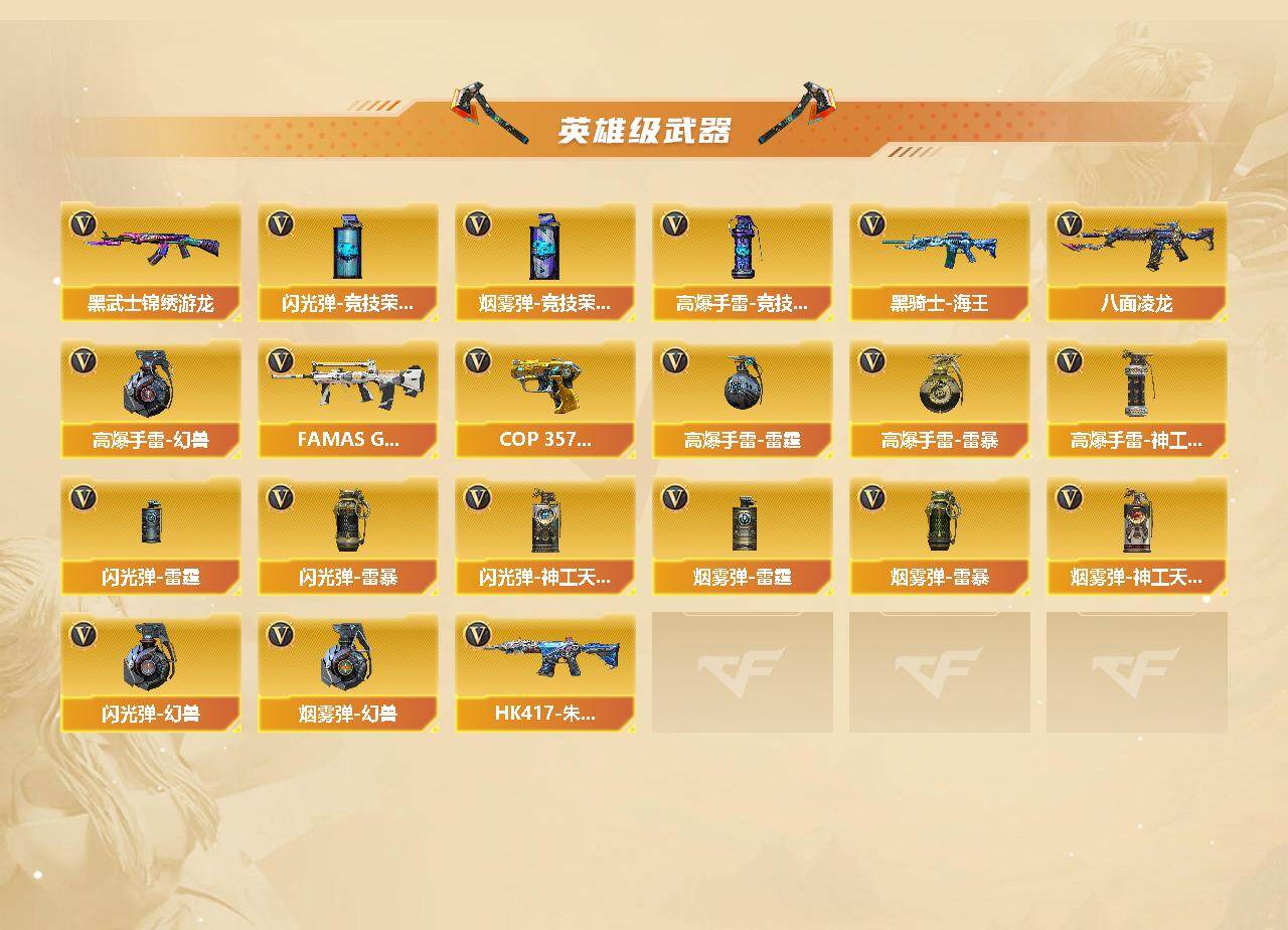 【英雄级武器】:M4A1-千变,AK47-火麒麟*2,M4A1-黑龙,M4A1-雷神*2,M4A1-黑骑士,AK47-黑武士,QBZ03-天罚,黑武士-锦绣游龙,八面凌龙,FAMAS G2-天戎,M4A1-玫瑰精灵,黑骑士-海王,HK417-朱雀-电竞之星,AWM-天龙,Barrett-毁灭,Barrett-极光,M200-竞技荣光,RPK-盘龙*6,加特林-炼狱,汤姆逊-烈龙*6,沙鹰-修罗,沙鹰-天神,COP-雷霆,COP 357-雷霆王者-觉醒版,柯尔特-竞技荣光,沙鹰-幻兽,屠龙*2,龙啸,擎天,麒麟刺,尼泊尔-雷霆,擎天-竞技荣光,斩神刀-雷暴,女皇利刃-幻兽,屠龙-电竞之星,高爆手雷-雷霆,高爆手雷-幻兽,高爆手雷-雷暴,高爆手雷-竞技荣光*2,高爆手雷-神工天巧,闪光弹-雷霆,闪光弹-幻兽,闪光弹-雷暴,闪光弹-竞技荣光*2,闪光弹-神工天巧,烟雾弹-雷霆,烟雾弹-幻兽,烟雾弹-雷暴,烟雾弹-竞技荣光*2,烟雾弹-神工天巧,AK47-竞魂无影