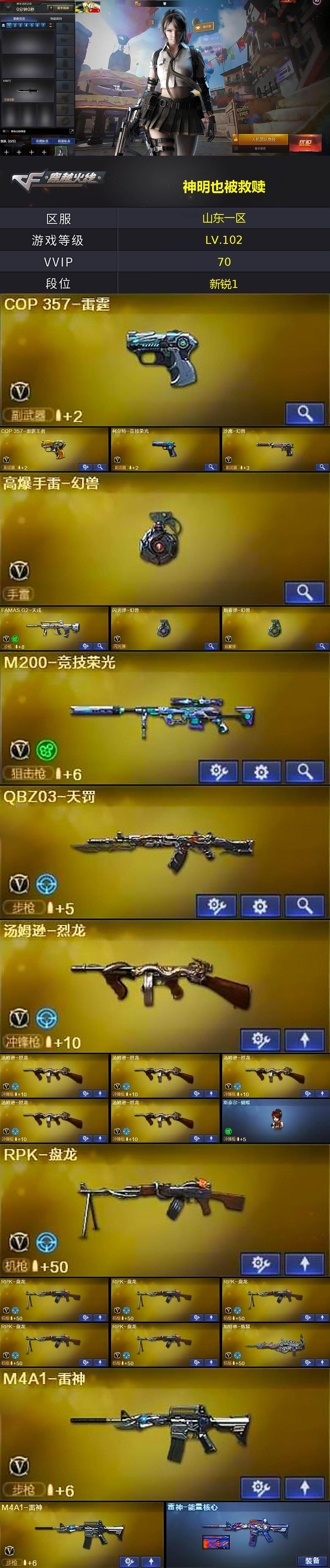 - [16886046]浙江一区-47V-2王者武器数-0炫金武器数 【传说武器】:传说辉光 【热门武器】:传说辉光,QBZ03-金色蔷薇,M4A1-青龙,M200-幻神,白虎-电玩蓝兔,M4A1-黑骑士,金色蔷薇-空,沙鹰-修罗*5 【王者炫金武器】:王者之魄高爆手雷 【音效卡】:M200-幻神音效卡 【皮肤】:M200-幻神-黄忠皮肤,幻神-AG-CFPLS17冠军,幻神-KZ-CFPLS25冠军 皮肤,Scar Light-白虎-暗星,金色蔷薇-电竞之星 皮肤,雷神-荣耀之魄,雷神-虎将,雷神-宇航兔皮肤,火麒麟-心动糖果,战神-流金岁月皮肤,AK47-B-常胜将军-曹操*2,AK47-B-常胜将军-刘备,极光-能量核心 【角色】:樱,战地猎狐,暗夜-X,初恋灵狐,芳心审判者,风暴女,虎妞,娟娟,潘多拉-X,蛇姬,斯沃特-X,兔囡囡 【人偶武器】:金色蔷薇-空,夺魂,生化手雷-机甲核心,迷你超能女侍 【暴走生化】:超级对讲机 【英雄级武器】:AK47-火麒麟,M4A1-雷神*2,M4A1-黑骑士,AN94-超新星,M4A1-青龙,QBZ03-天罚,无影-神兵利器,M4A1-玫瑰精灵,QBZ03-金色蔷薇,AK47-B-战神,白虎-电玩蓝兔,Barrett-毁灭,Barrett-极光,M200-幻神,沙鹰-修罗*5,USP-神工天巧,王者之锋-觉醒版,高爆手雷-雷暴,高爆手雷-竞技荣光,高爆手雷-神工天巧*2,闪光弹-雷霆*2,闪光弹-竞技荣光,闪光弹-神工天巧*3,烟雾弹-神工天巧*4 【道具】:BS战队炫彩背包,亚洲杯纪念炫彩背包,战舰背包,炫彩背包,女皇终结者-魔龙之吻,救世主-黑桃战神,绿色巨人,灵魂忍者,迷雾幽灵,夺命之镰*2,防化服*3,金色流光-枪王排位,流光-鎏金之域,流光-再燃火线,枪王排位29赛季金色流光,电玩兔兔表情,防弹头盔*4,防弹衣*4,C4工具钳*3,手雷包*3 【特殊枪械】:1黑骑士
