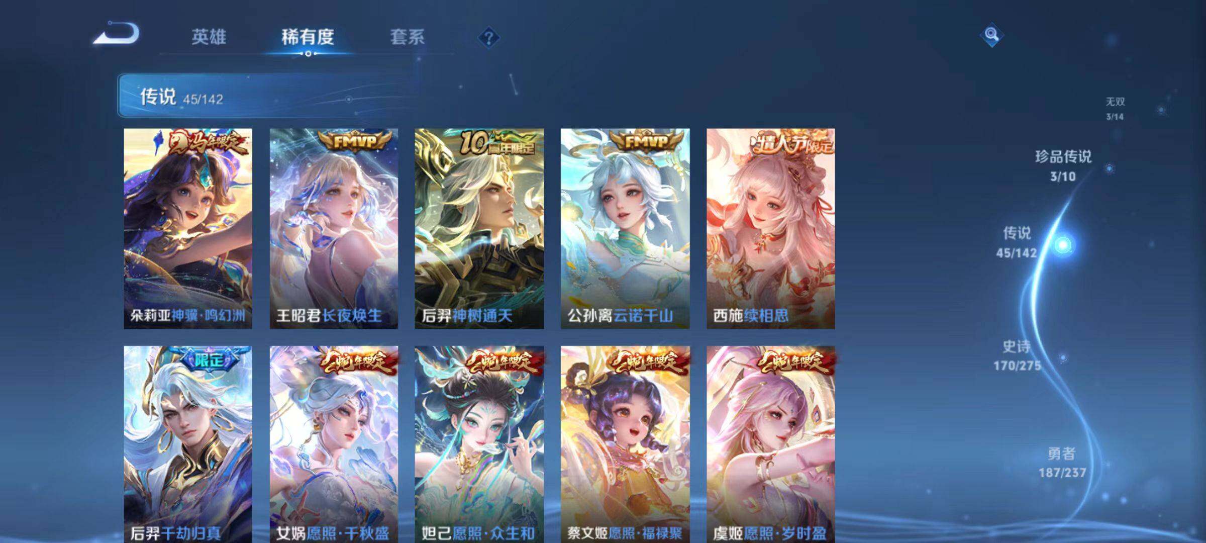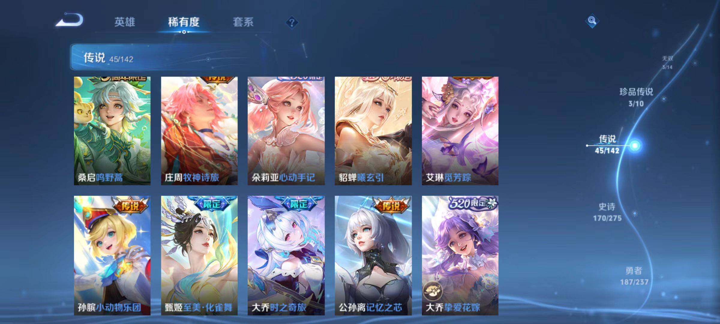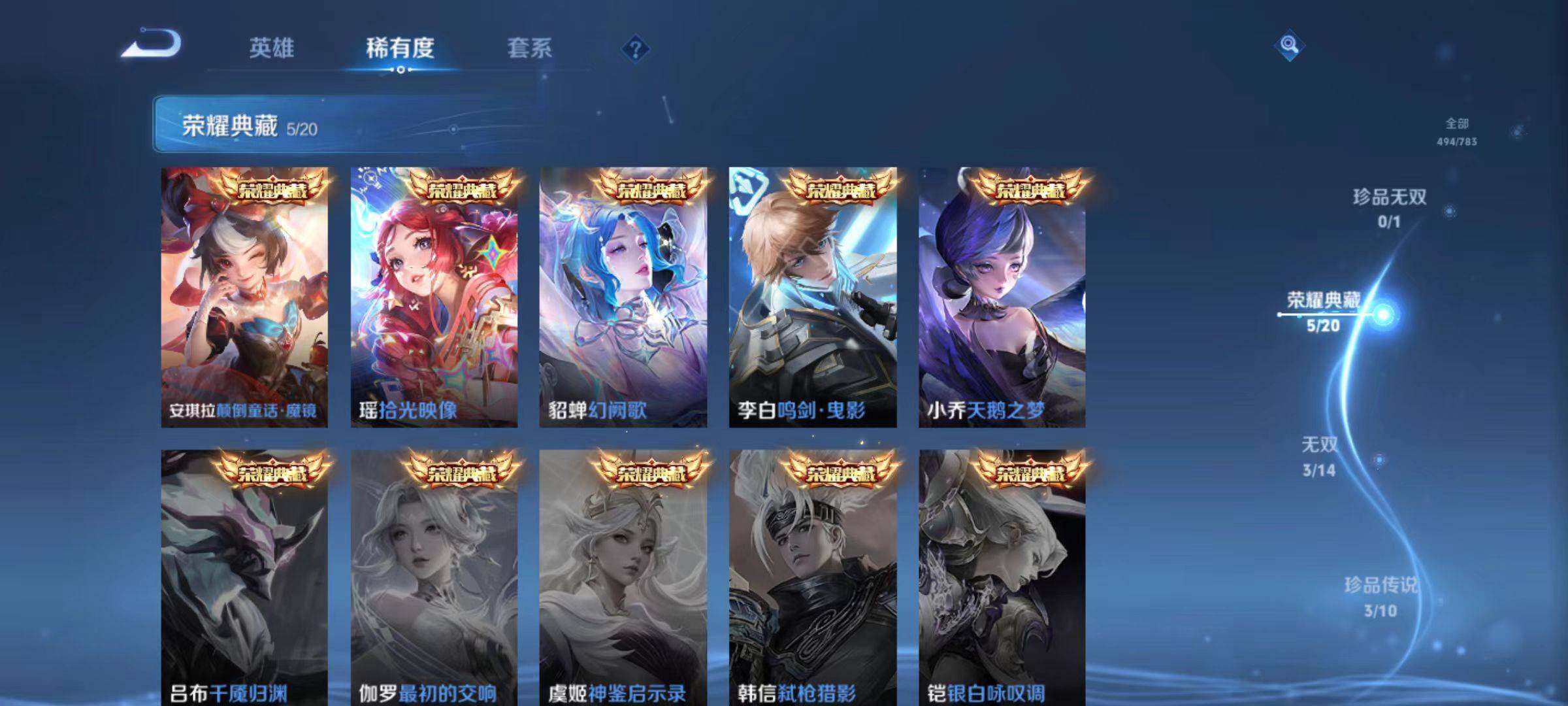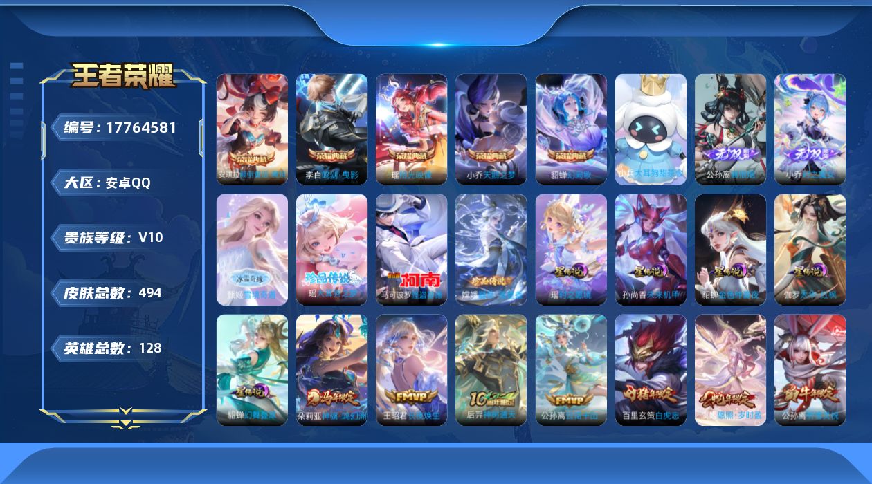 [17764581]安卓Q-V10-494皮肤-5典藏皮肤-3无双-3珍品传说-45传说-169史诗