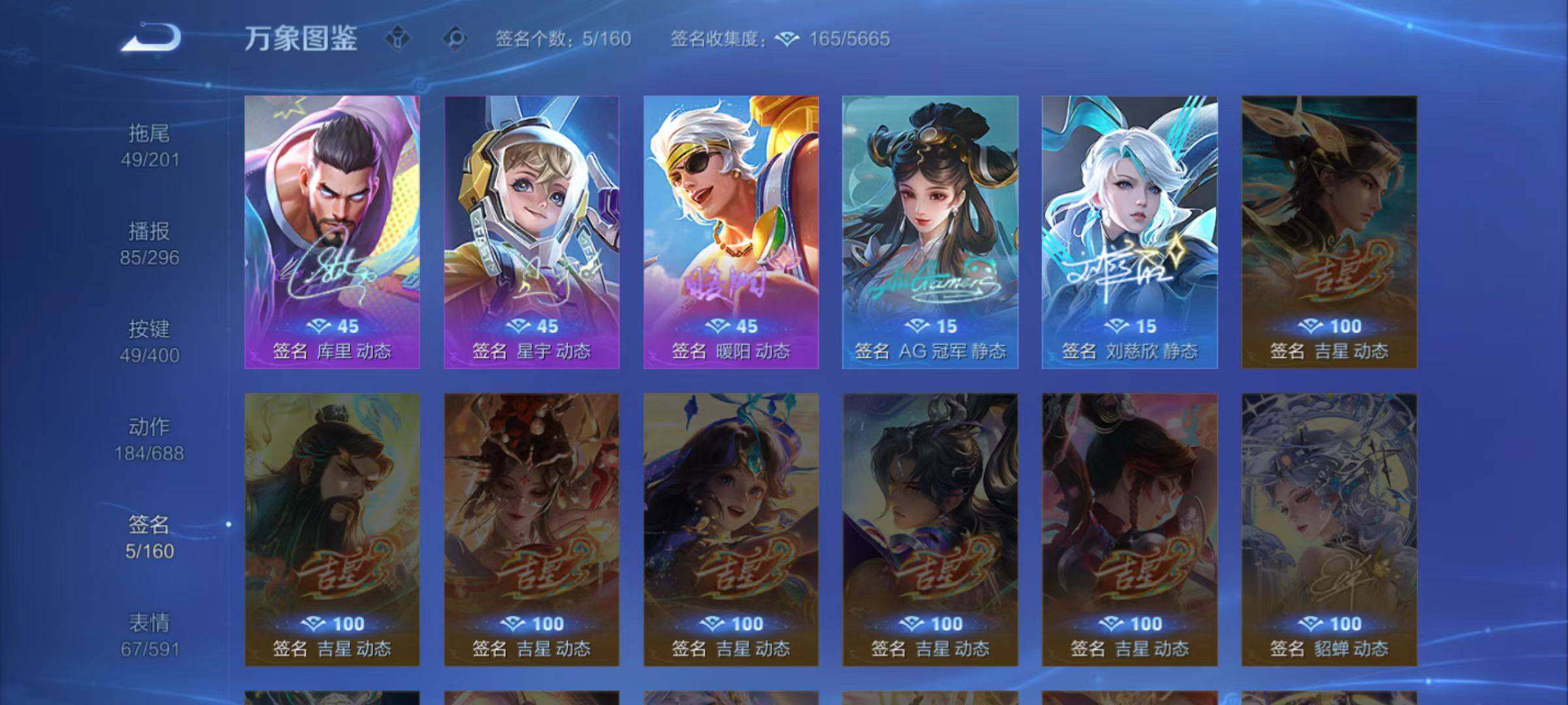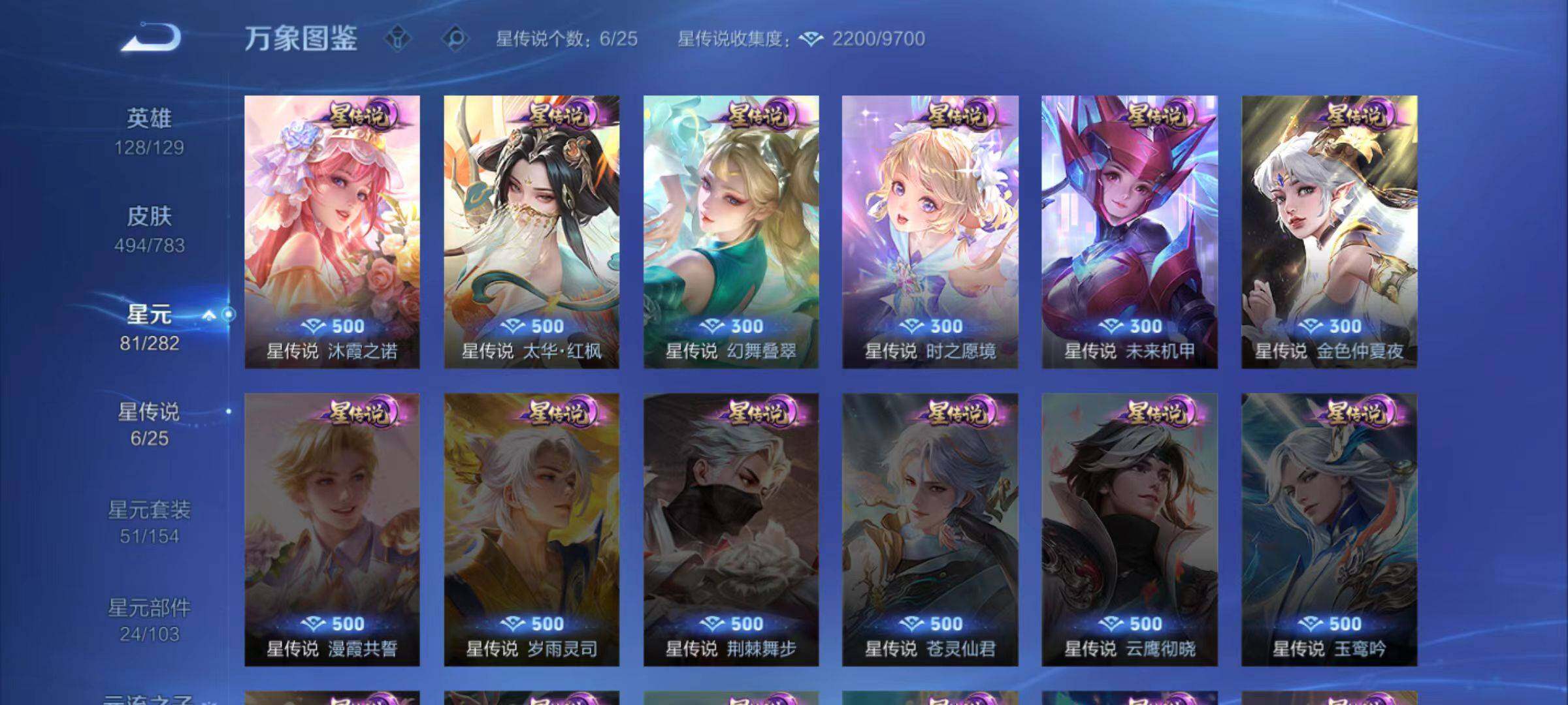 小乔青蛇,大乔白蛇,瑶遇见神鹿,娜可露露晚萤,伽罗箭羽风息,李元芳逐浪之夏,不知火舞魅语,公孙离无限星赏官,大乔猫狗日记,孙策猫狗日记,阿轲节奏热浪,露娜紫霞仙子,诸葛亮黄金分割率,王昭君偶像歌手,项羽苍穹之光,孙尚香时之恋人,阿轲暗夜猫娘,雅典娜冰冠公主,吕布末日机甲,鲁班七号电玩小子,橘右京修罗,墨子龙骑士,嬴政摇滚巨星,刘禅绅士熊喵,刘禅天才门将,白起星夜王子,安琪拉心灵骇客,安琪拉时之奇旅,程咬金功夫厨神,刘邦德古拉伯爵,兰陵王暗隐猎兽者,曹操幽灵船长,宫本武藏鬼剑武藏,司马懿暗渊魔法,亚瑟心灵战警,钟馗乐园奇幻夜,杨戬天秀·启明,蔡文姬舞动绿茵,廉颇地狱岩魂,西施诗语江南,小乔缤纷独角兽,夏侯惇乘风破浪,花木兰水晶猎龙者,铠曙光守护者,墨子金属风暴,吕布圣诞狂欢,貂蝉圣诞恋歌,百里守约特工魅影,嬴政暗夜贵公子,嫦娥拒霜思,李白千年之狐,夏洛特永昼,澜赏金猎手,艾琳奇遇舞章,弈星滕王阁序,杨玉环银翎春语,刘禅电玩·爆裂旋风,海月浮梦罗烟,赵怀真鹤归松栖,蒙犽百解令,周瑜雪夜绮愿,伽罗琥珀纪元,大乔乘龙·忆丹青,安琪拉乘龙·聚宝船,桑启奇遇星旅,上官婉儿群星魔术团,海诺心动手记