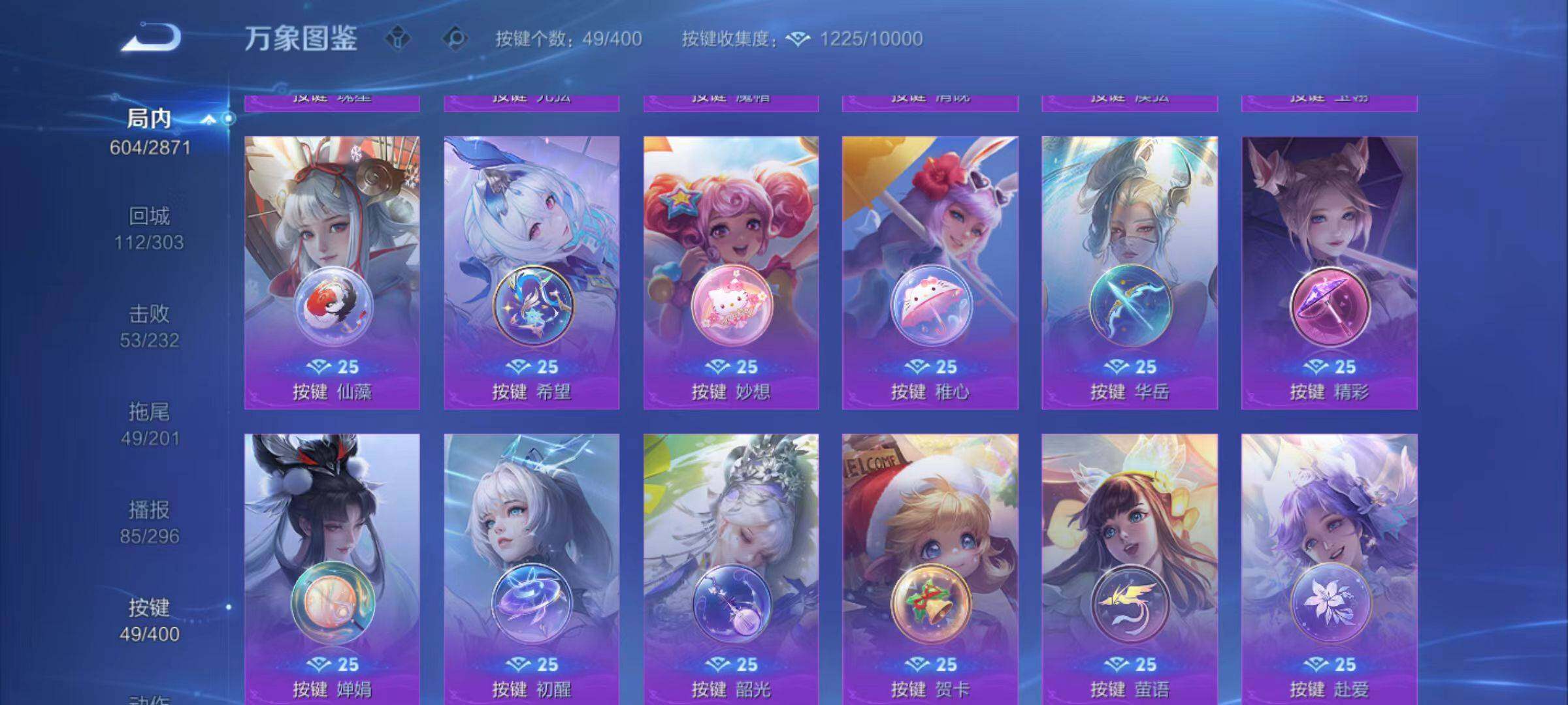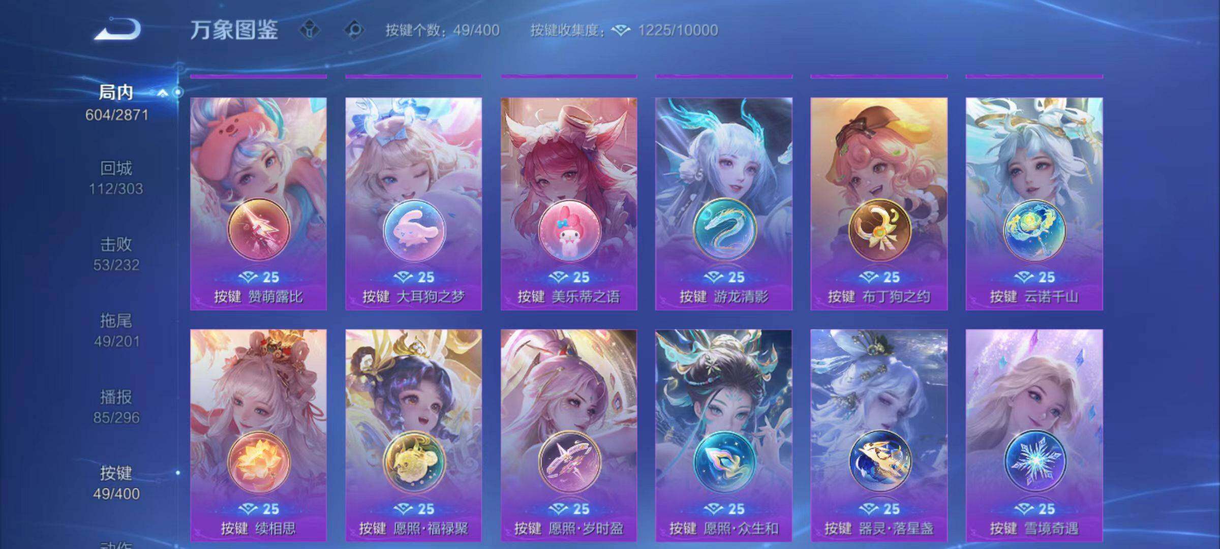 关羽冰锋战神,裴擒虎李小龙,上官婉儿梁祝,牛魔奔雷神使,公孙离祈雪灵祝,吕布御风骁将,诸葛亮时雨天司,赵云龙胆,关羽武圣,张飞虎魄,马超神威,后羿辉光之辰,庄周玄嵩,伽罗太华,裴擒虎天狼狩猎者,孙膑天狼运算者,上官婉儿天狼绘梦者,伽罗天狼溯光者,百里玄策白虎志,百里守约朱雀志,王昭君凤凰于飞,花木兰默契交锋,后羿如梦令,嫦娥如梦令,孙悟空至尊宝,干将莫邪冰霜恋舞曲,蔡文姬奇迹圣诞,妲己时之彼端,公孙离蜜橘之夏,芈月白晶晶,安琪拉魔法小厨娘,猪八戒猪悟能,廉颇寅虎·御盾,孙尚香异界灵契,孙悟空孙行者,甄姬女儿国国王,镜匿光追影者,鲁班七号寅虎·瑞焰,杨玉环寅虎·心曲,瑶时之祈愿,女娲补天,赵云百木心枪,公孙离玉兔公主,金蝉唐三藏,鲁班大师匿光启智者,盾山梦圆繁星,西施至美·乘鲤谣,甄姬至美·化雀舞,桑启鸣野蒿,艾琳陌上桑,蔡文姬愿照·福禄聚,虞姬愿照·岁时盈,妲己愿照·众生和,女娲愿照·千秋盛
