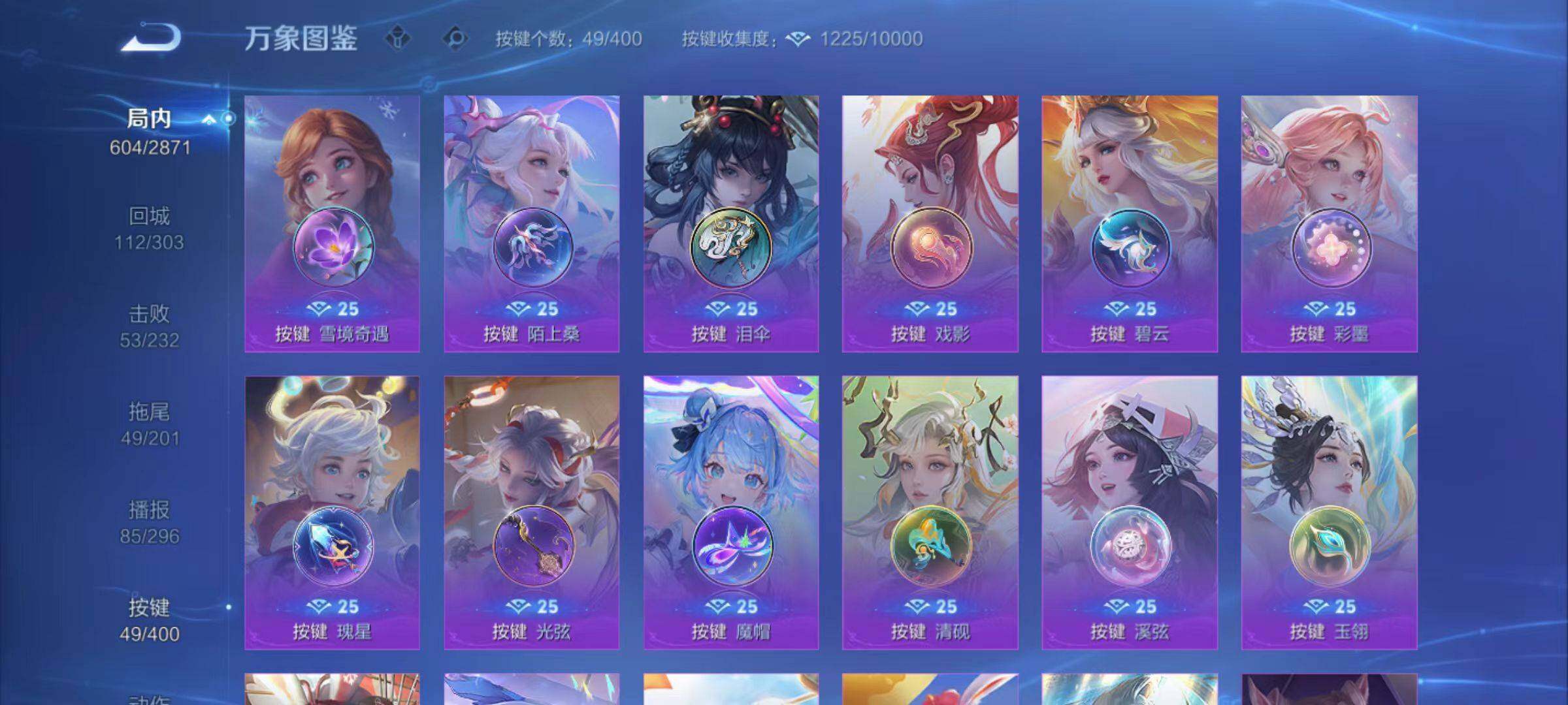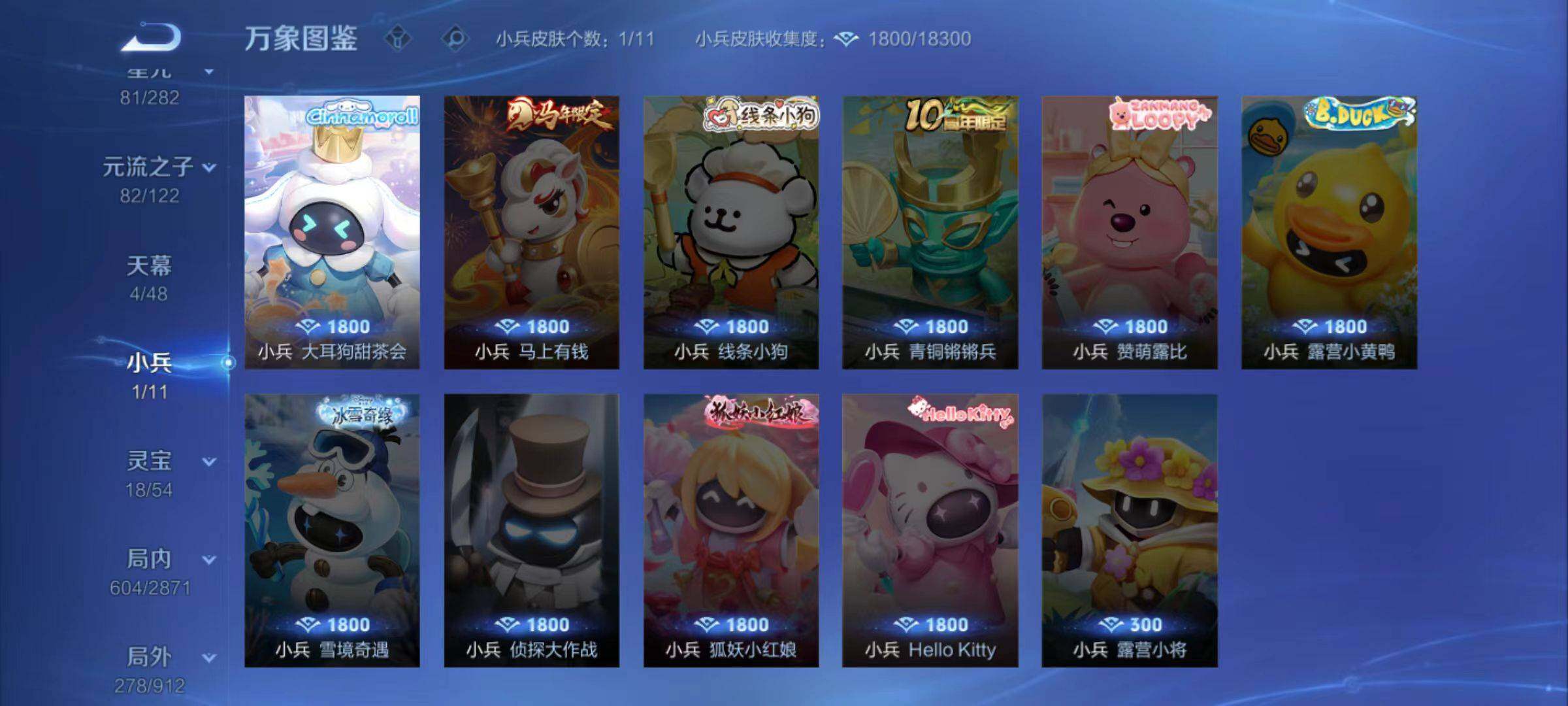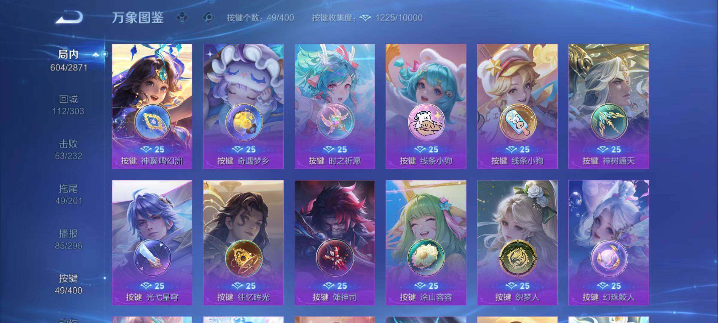 夏侯惇朔风刀,明世隐疑决卦,老夫子醍醐杖,鬼谷子原初探秘者,狄仁杰万华元夜,程咬金演武夺筹,钟馗驱傩正仪,苏烈千军破阵,嬴政白昼王子,鲁班七号狮舞东方,沈梦溪星空之诺,李元芳银河之约,刘邦夺宝奇兵,马可波罗暗影游猎,蒙犽狂想玩偶喵,元歌云间偶戏,弈星混沌棋,达摩沙漠行僧,兰陵王金庭之子,沈梦溪大漠名商,李元芳云中旅人,桑启海盐诗旅,裴擒虎擒涛扼浪,鲁班大师探海日志,张良古海寻踪,项羽苍威无极,镜青焰无极