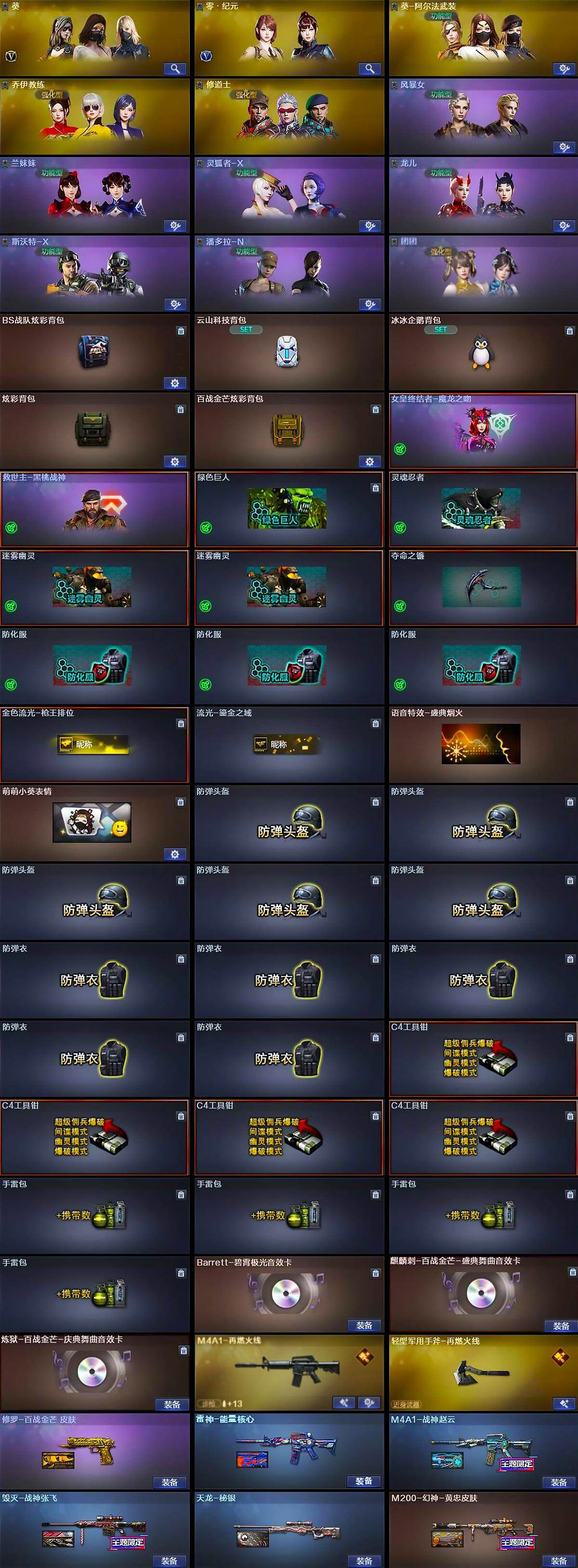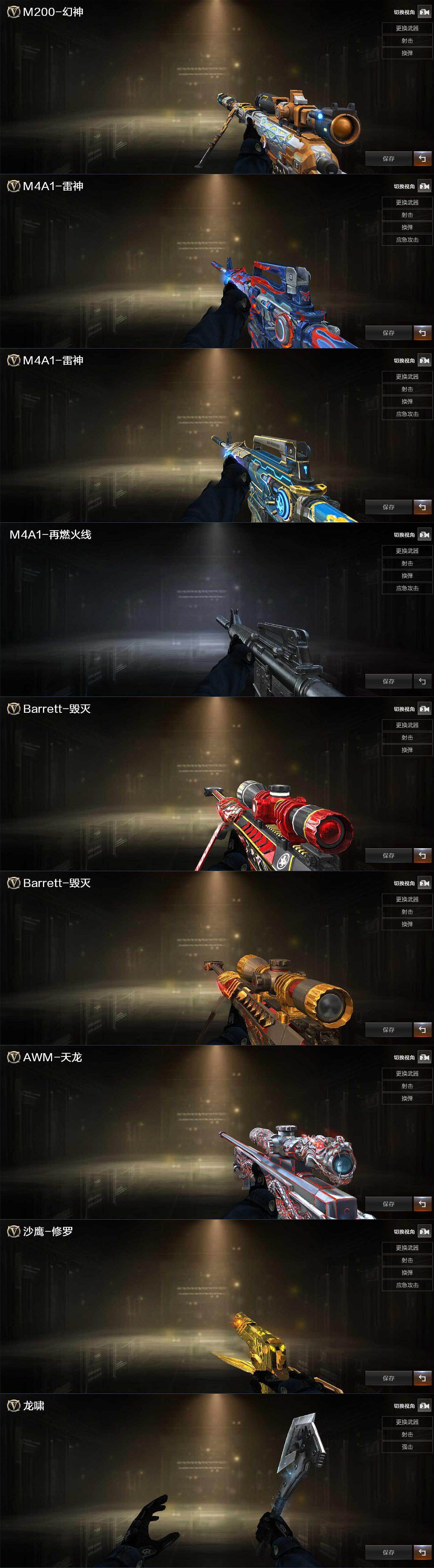 【英雄级武器】:AK47-火麒麟,M4A1-雷神,M4A1-黑骑士,AK47-机械迷城,无影-神兵利器,QBZ03-金色蔷薇,机械迷城-穹宇,AWM-天龙,Barrett-毁灭,Barrett-极光,M200-幻神,王者之怒-觉醒版,炼狱-百战金芒,沙鹰-修罗*2,屠龙*2,麒麟刺,麒麟刺-百战金芒,屠龙-斗烈龙驹,闪光弹-玄豹,M4A1-苍鸣雷神