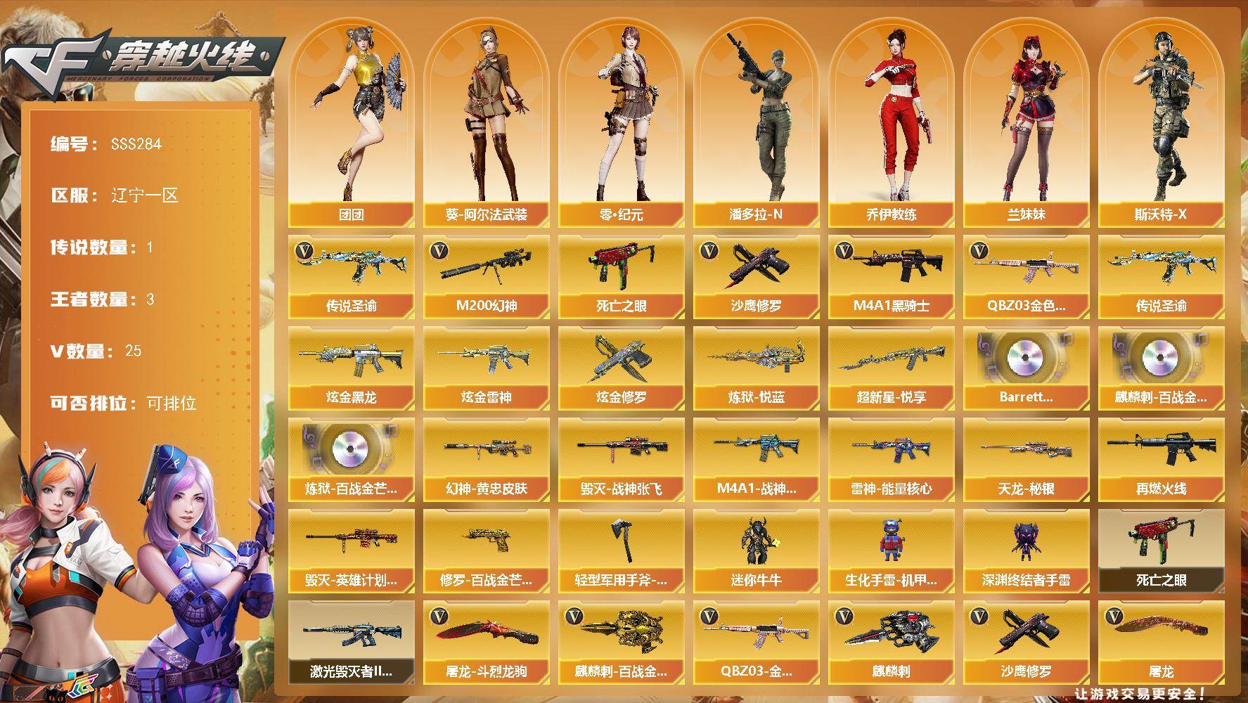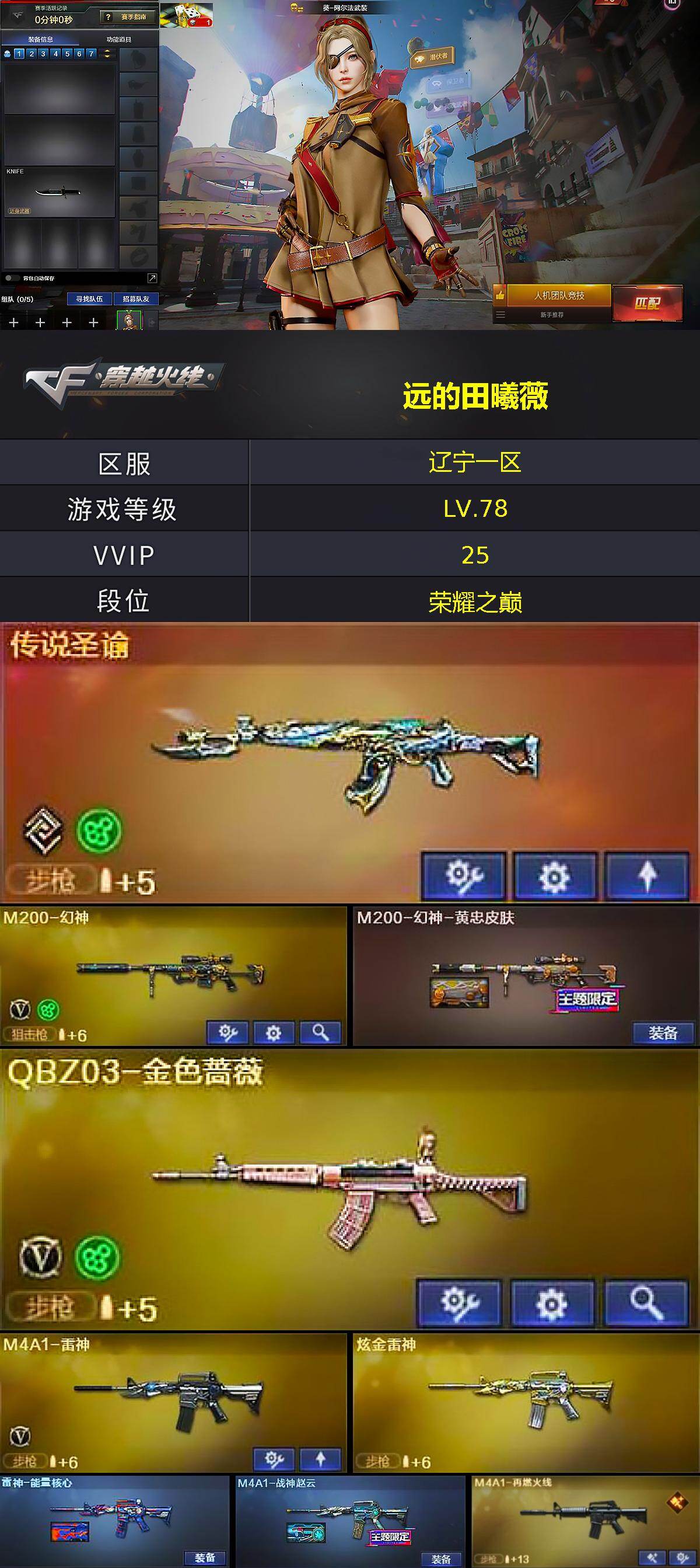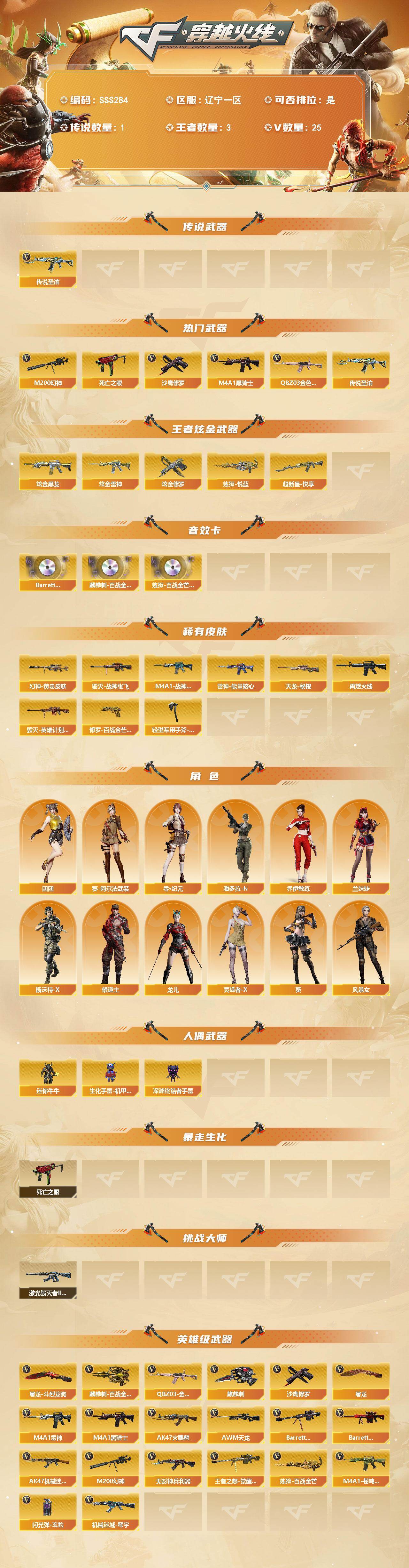 [17764909]辽宁一区-27V-3王者武器数-3炫金武器数 【传说武器】:传说圣谕 【热门武器】:传说圣谕,QBZ03-金色蔷薇,M200-幻神,死亡之眼,M4A1-黑骑士,沙鹰-修罗*2 【王者炫金武器】:超新星-悦享,炼狱-悦蓝,炫金黑龙,炫金雷神,炫金修罗 【音效卡】:Barrett-碧霄极光音效卡,麒麟刺-百战金芒-盛典舞曲音效卡,炼狱-百战金芒-庆典舞曲音效卡 【皮肤】:M200-幻神-黄忠皮肤,雷神-能量核心,M4A1-战神赵云,M4A1-再燃火线,毁灭-战神张飞,毁灭-英雄计划 皮肤,天龙-秘银,修罗-百战金芒 皮肤,轻型军用手斧-再燃火线 【角色】:葵,零·纪元,乔伊教练,修道士,葵-阿尔法武装,风暴女,兰妹妹,灵狐者-X,龙儿,斯沃特-X,潘多拉-N,团团 【人偶武器】:迷你牛牛,生化手雷-机甲核心,深渊终结者手雷 【暴走生化】:死亡之眼 【挑战大师】:激光毁灭者III-白马银枪 【英雄级武器】:AK47-火麒麟,M4A1-雷神,M4A1-黑骑士,AK47-机械迷城,无影-神兵利器,QBZ03-金色蔷薇,机械迷城-穹宇,AWM-天龙,Barrett-毁灭,Barrett-极光,M200-幻神,王者之怒-觉醒版,炼狱-百战金芒,沙鹰-修罗*2,屠龙*2,麒麟刺,麒麟刺-百战金芒,屠龙-斗烈龙驹,闪光弹-玄豹,M4A1-苍鸣雷神 【源级武器】:源-千变,源·火麒麟*2,源-黑龙,源·雷神*2,魂·M4A1-雷神-化蛇,魂·雷神-诺拉,魂·雷神-神秘按键,魂·雷神-新春神龙,御·雷神-机甲刑天,御·雷神-烈虎,M4A1-十二生肖·龙-雷神,源·黑骑士,魂·黑骑士-幻能朋克,灵·黑骑士-炫光,源·AK47-黑武士,源·天启,源·武圣,魂·龙血-锋芒破茧,源·青龙,M4A1-青龙-掌上穿越火线,源·HK417-朱雀,源-金色蔷薇,魂·QBZ03-金色蔷薇-萌杀,源·玫瑰精灵*2,源·猎神,魂·英雄-湾区光枢,源-极光,源·天龙,魂·毁灭-神秘黑洞*3,魂·Barrett-朱雀- 新春神龙,灵·Barrett-朱雀-炫光,加特林-炼狱-掌火,御·炼狱-女娲,魂·修罗-迷彩,魂·修罗-现代金属,源·天神,灵·天神-穹宇,魂·屠龙-春桃,魂·屠龙-惊鸿,源·擎天-萌杀,源-擎天,源·龙啸,魂·龙啸-玩具枪,灵·麒麟刺-穹宇 【道具】:BS战队炫彩背包,云山科技背包,冰冰企鹅背