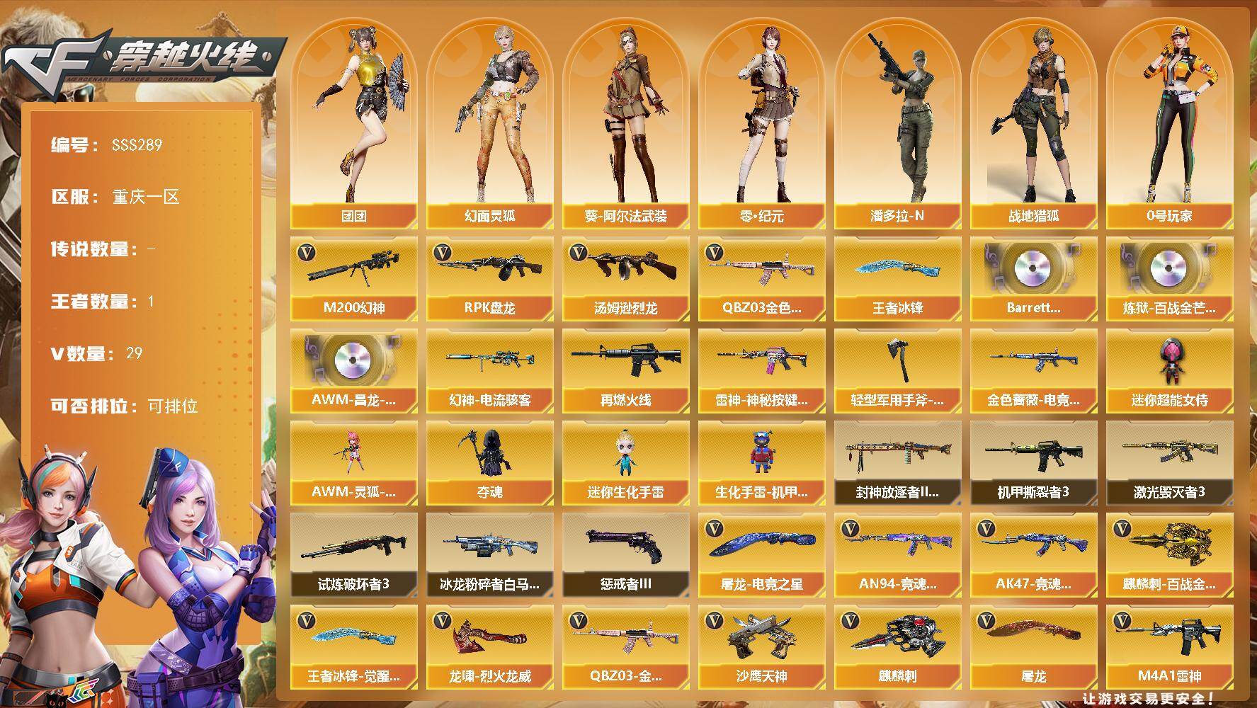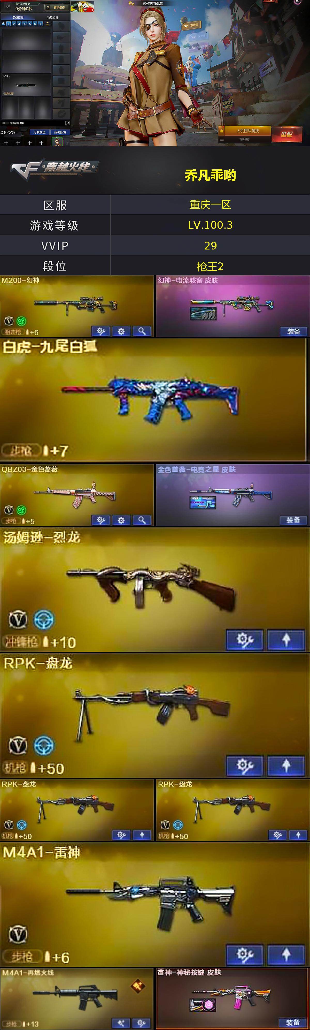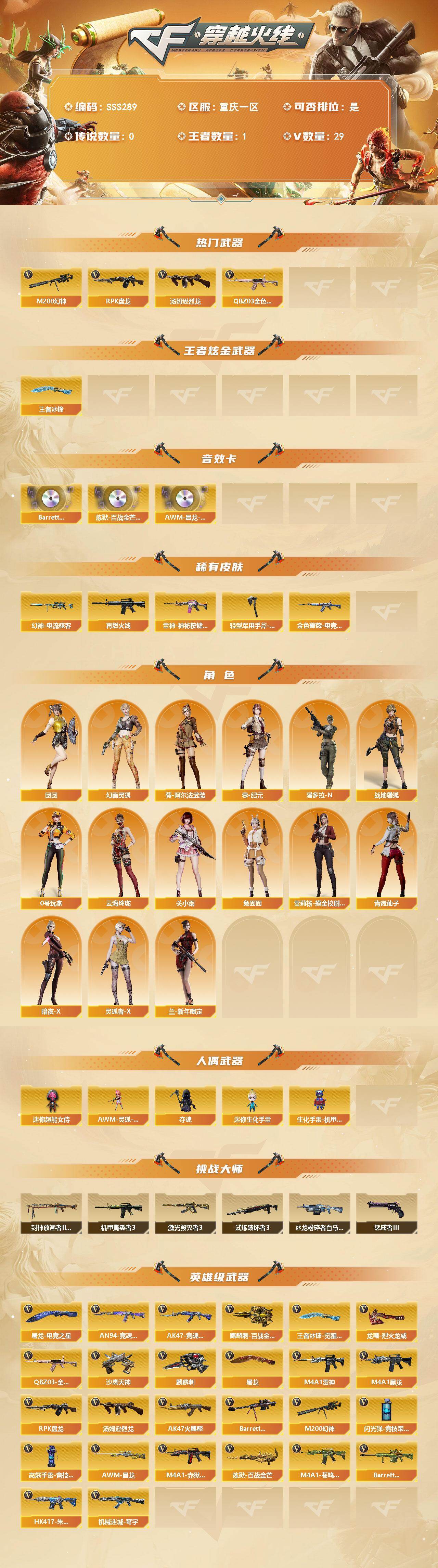 [17765019]重庆一区-33V-1王者武器数-0炫金武器数 【热门武器】:QBZ03-金色蔷薇,M200-幻神,汤姆逊-烈龙,RPK-盘龙*3 【王者炫金武器】:王者冰锋 【音效卡】:Barrett-碧霄极光音效卡,炼狱-百战金芒-庆典舞曲音效卡,AWM-昌龙-怀旧音效卡 【皮肤】:幻神-电流骇客 皮肤,金色蔷薇-电竞之星 皮肤,M4A1-再燃火线,雷神-神秘按键 皮肤,轻型军用手斧-再燃火线 【角色】:关小雨,零·纪元,战地猎狐,云海玲珑,葵-阿尔法武装,幻面灵狐,暗夜-X,兰-新年限定,0号玩家,灵狐者-X,青霞仙子,兔囡囡,雪莉杨-摸金校尉,潘多拉-N,团团 【人偶武器】:AWM-灵狐-15周年嘉年华,夺魂,迷你生化手雷,生化手雷-机甲核心*2,迷你超能女侍 【挑战大师】:冰龙粉碎者-白马银枪,激光毁灭者III,机甲撕裂者III,试炼破坏者III,惩戒者III,封神放逐者III 【英雄级武器】:AK47-火麒麟,M4A1-黑龙,M4A1-雷神,QBZ03-金色蔷薇,HK417-朱雀-电竞之星,机械迷城-穹宇,Barrett-毁灭,M200-幻神,RPK-盘龙*3,炼狱-百战金芒,汤姆逊-烈龙,沙鹰-天神,屠龙*2,麒麟刺,麒麟刺-百战金芒,王者冰锋-觉醒版,屠龙-电竞之星,龙啸-烈火龙威,高爆手雷-竞技荣光,闪光弹-竞技荣光,M4A1-赤狱骑士,M4A1-苍鸣雷神,AK47-竞魂无影,AN94-竞魂超新星,AWM-昌龙,Barrett-碧霄极光 【源级武器】:源·火麒麟,御·火麒麟-平天大圣,源·雷神,魂·雷神-诺拉,魂·雷神-神秘按键,魂·雷神-新春神龙,魂·雷神-15周年嘉年华,魂·雷神-萌柴,御·雷神-烈虎,魂·黑骑士-幻能朋克,御·黑骑士·哪吒闹海,灵·黑骑士-炫光,魂·HK417-朱雀-凤灵,灵·HK417-朱雀-甜蜜火力*2,源·HK417-朱雀,白虎-九尾白狐,源-金色蔷薇,金色蔷薇-狼王,魂·QBZ03-金色蔷薇-蛇姬,QBZ03-文殊坊,魂·9A91·烈火-电子连击,魂·玫瑰精灵-傲梅,魂·英雄-湾区光枢,Barrett-极光-掌火*2,源·天龙,魂·裁决-凤灵*2,魂·裁决-神秘按键,魂·裁决-新人王绿豆,魂·裁决-羽掣,魂·毁灭-神秘黑洞,灵·Barrett-金色蔷薇-甜蜜火力,魂·Barrett-朱雀-锦鲤,灵·Barrett-朱雀-炫光,魂·炼狱