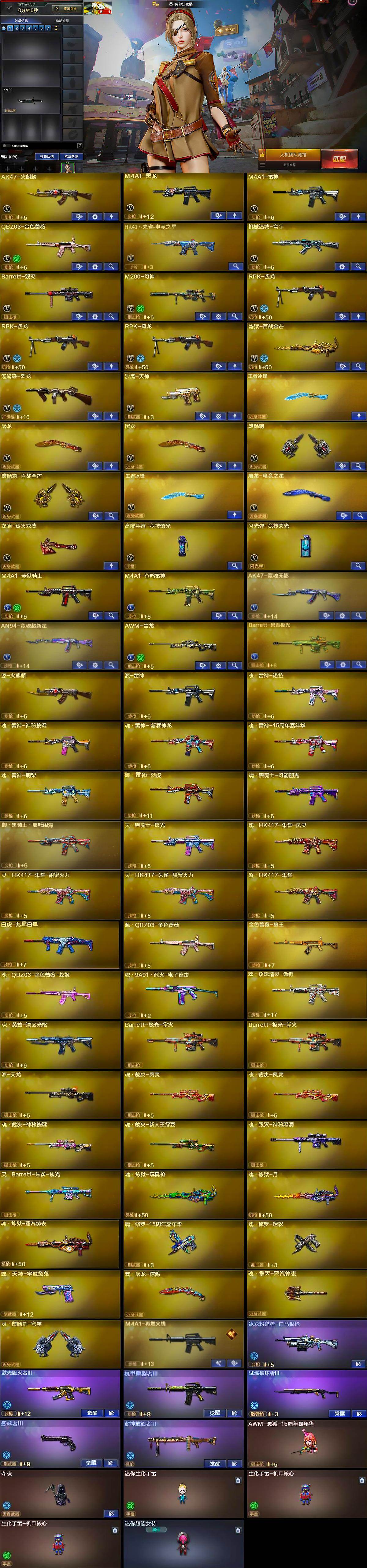 【英雄级武器】:AK47-火麒麟,M4A1-黑龙,M4A1-雷神,QBZ03-金色蔷薇,HK417-朱雀-电竞之星,机械迷城-穹宇,Barrett-毁灭,M200-幻神,RPK-盘龙*3,炼狱-百战金芒,汤姆逊-烈龙,沙鹰-天神,屠龙*2,麒麟刺,麒麟刺-百战金芒,王者冰锋-觉醒版,屠龙-电竞之星,龙啸-烈火龙威,高爆手雷-竞技荣光,闪光弹-竞技荣光,M4A1-赤狱骑士,M4A1-苍鸣雷神,AK47-竞魂无影,AN94-竞魂超新星,AWM-昌龙,Barrett-碧霄极光