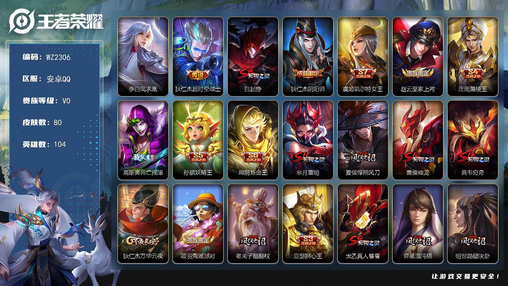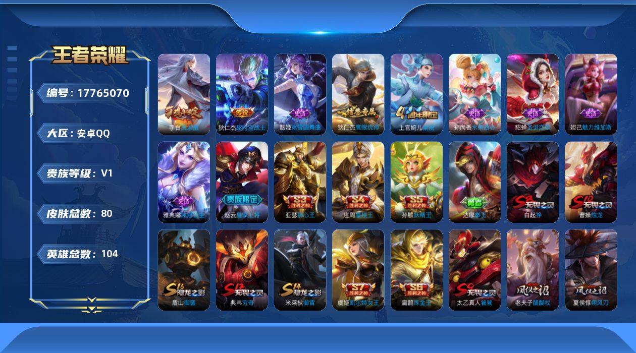 [17765070]安卓Q-80皮肤-2传说-8史诗 【传说皮肤】:李白凤求凰,狄仁杰超时空战士 【限定皮肤】:白起狰,狄仁杰阴阳师,虞姬凯尔特女王,赵云皇家上将,庄周蜃楼王,高渐离死亡摇滚,孙膑妖精王,扁鹊炼金王,芈月重明,夏侯惇朔风刀,曹操烛龙,典韦穷奇,狄仁杰万华元夜,项羽海滩派对,老夫子醍醐杖,亚瑟狮心王,太乙真人饕餮,弈星混沌棋,明世隐疑决卦,米莱狄御霄,盾山御銮,上官婉儿梁祝 【年限皮肤】:李白凤求凰 【赛季限定】:亚瑟狮心王,庄周蜃楼王,孙膑妖精王,扁鹊炼金王,虞姬凯尔特女王,白起狰,太乙真人饕餮,曹操烛龙,芈月重明,典韦穷奇,米莱狄御霄,盾山御銮,夏侯惇朔风刀,弈星混沌棋,明世隐疑决卦,老夫子醍醐杖,狄仁杰万华元夜 【史诗皮肤】:上官婉儿梁祝,狄仁杰鹰眼统帅,雅典娜冰冠公主,妲己魅力维加斯,孙尚香水果甜心,甄姬冰雪圆舞曲,貂蝉圣诞恋歌,赵云皇家上将 【其他皮肤】:狄仁杰万华元夜,老夫子醍醐杖,盾山圆桌骑士,明世隐疑决卦,哪吒次元突破,弈星混沌棋,夏侯惇朔风刀,沈梦溪鲨炮海盗猫,盾山御銮,明世隐虹云星官,米莱狄御霄,鬼谷子幻乐之宴,典韦穷奇,牛魔制霸全明星,老夫子功夫老勺,芈月重明,王昭君幻想奇妙夜,曹操烛龙,宫本武藏霸王丸,太乙真人饕餮,钟无艳海滩丽影,白起狰,虞姬凯尔特女王,关羽龙腾万里,扁鹊炼金王,李元芳黑猫爱糖果,刘备汉昭烈帝,孙膑妖精王,高渐离死亡摇滚,刘备纽约教父,庄周蜃楼王,狄仁杰阴阳师,亚瑟狮心王,达摩拳王,亚瑟死亡骑士,妲己少女阿狸,扁鹊化身博士,程咬金爱与正义,赵云忍炎影,赵云白执事,达摩大发明家,阿轲爱心护理,韩信教廷特使,项羽海滩派对,盘古创世神祝,李信灼热之刃,伽罗花见巫女,司马懿魇语军师,元歌午夜歌剧院,杨玉环霓裳曲,公孙离花间舞,梦奇美梦成真,百里玄策威尼斯狂欢,百里守约绝影神枪,干将莫邪第七人偶,黄忠芝加哥教父,诸葛亮星航指挥官,马可波罗激情绿茵,雅典娜战争女神,关羽天启骑士,刘邦圣殿之光,李元芳特种部队,钟馗地府判官,兰陵王隐刃,刘禅英喵野望,后羿精灵王,孙悟空西部大镖客,曹操超能战警,花木兰剑舞者,露娜绯红之刃 【营地ID】:447539303