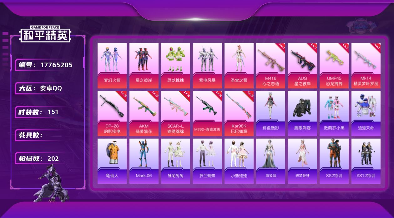 [17765205]安卓 手Q-6粉装-13特效枪-0载具-1粉色飞行器-66422热力值-10王牌印记-151套装-202枪皮