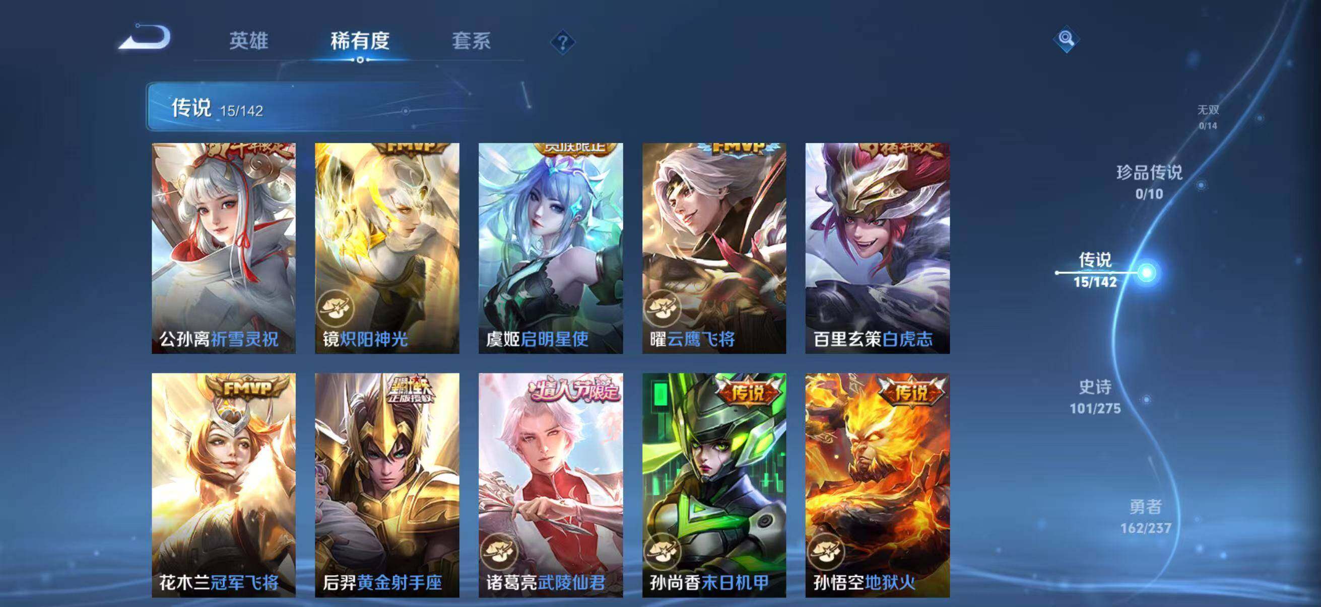 【传说皮肤】:吕布曦玄引,孙尚香乘龙问璇玑,澜逐花归海,公孙离记忆之芯,干将莫邪画中仙,公孙离祈雪灵祝,镜炽阳神光,虞姬启明星使,曜云鹰飞将,百里玄策白虎志,花木兰冠军飞将,后羿黄金射手座,诸葛亮武陵仙君,孙尚香末日机甲,孙悟空地狱火
