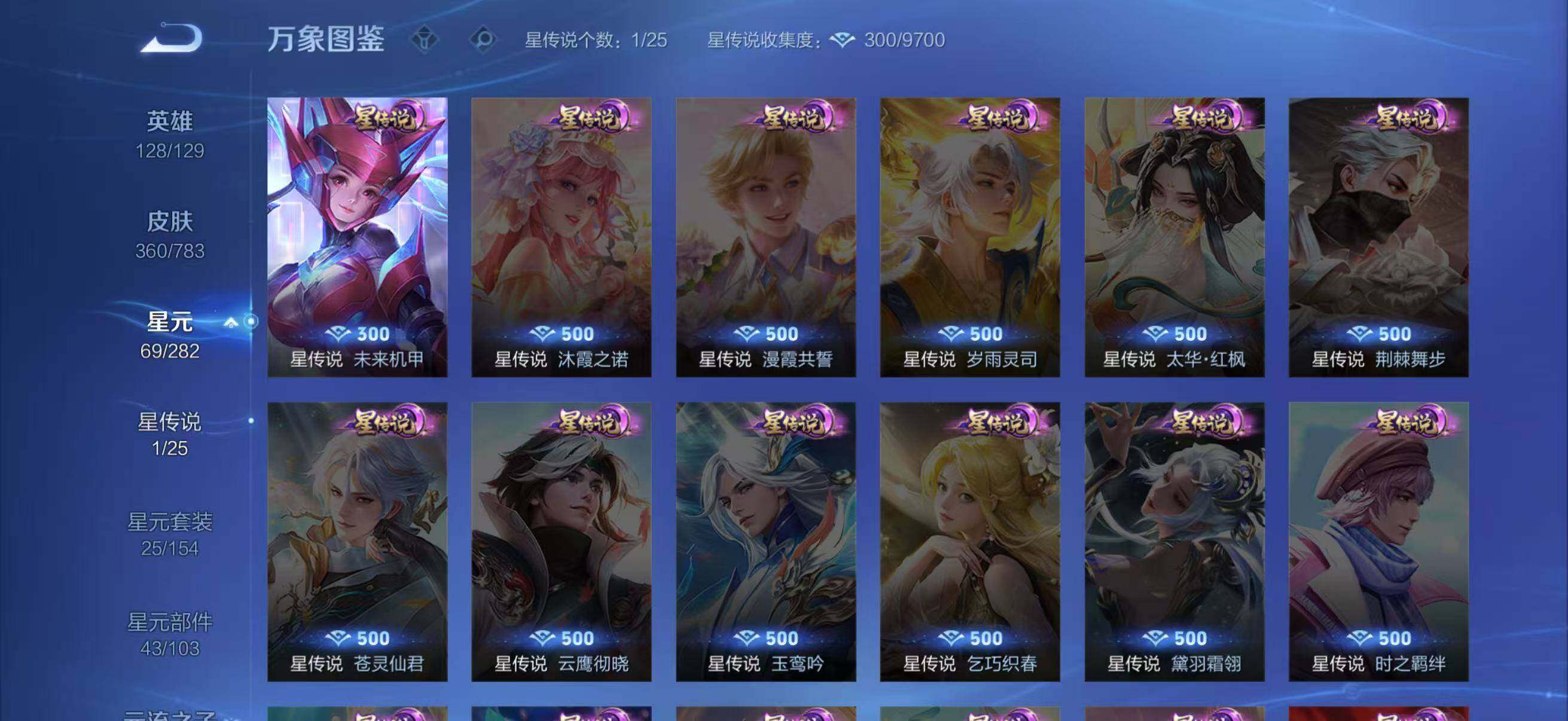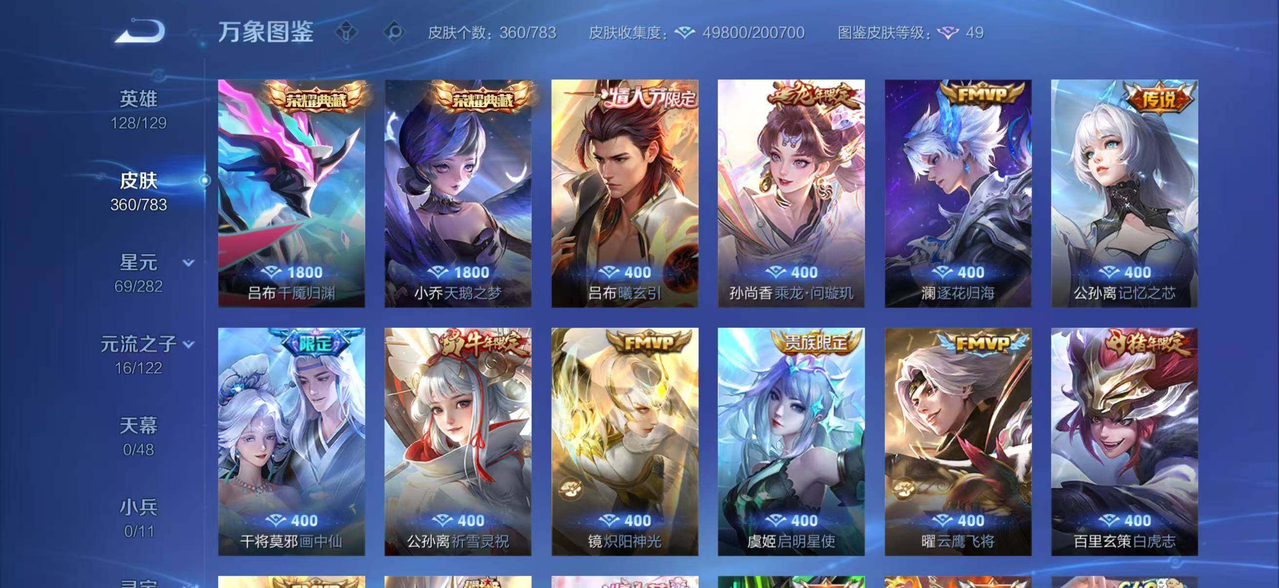 扁鹊炼金王,虞姬凯尔特女王,白起狰,太乙真人饕餮,曹操烛龙,芈月重明,典韦穷奇,狂铁御狮,米莱狄御霄,牛魔御旌,盾山御銮,夏侯惇朔风刀,明世隐疑决卦,老夫子醍醐杖,鬼谷子原初探秘者,狄仁杰万华元夜,程咬金演武夺筹,钟馗驱傩正仪,吕布猎兽之王,嬴政白昼王子,女娲朔望之晖,典韦蓝屏警告,沈梦溪星空之诺,李元芳银河之约,马可波罗暗影游猎,蒙犽狂想玩偶喵,元歌云间偶戏,弈星混沌棋,达摩沙漠行僧,沈梦溪大漠名商,李元芳云中旅人,桑启海盐诗旅,裴擒虎擒涛扼浪,鲁班大师探海日志,张良古海寻踪