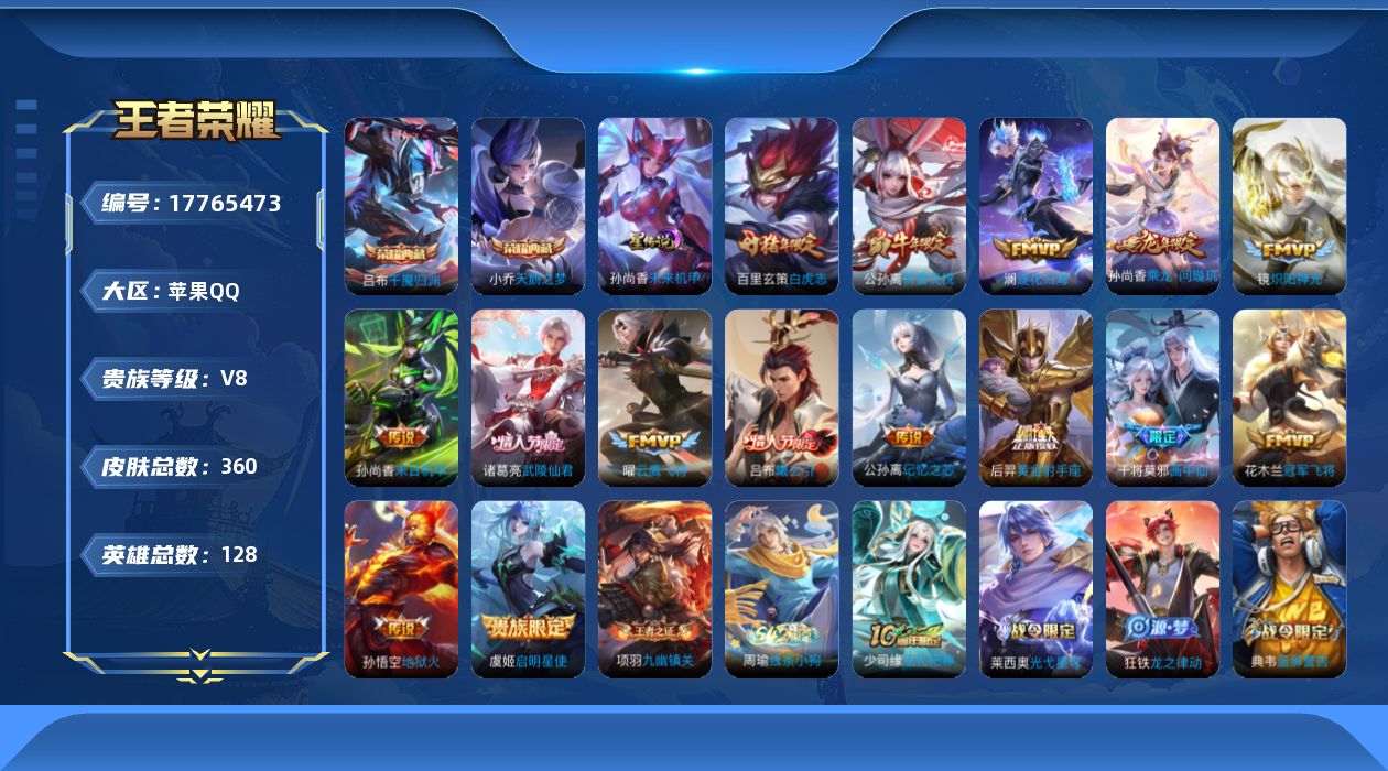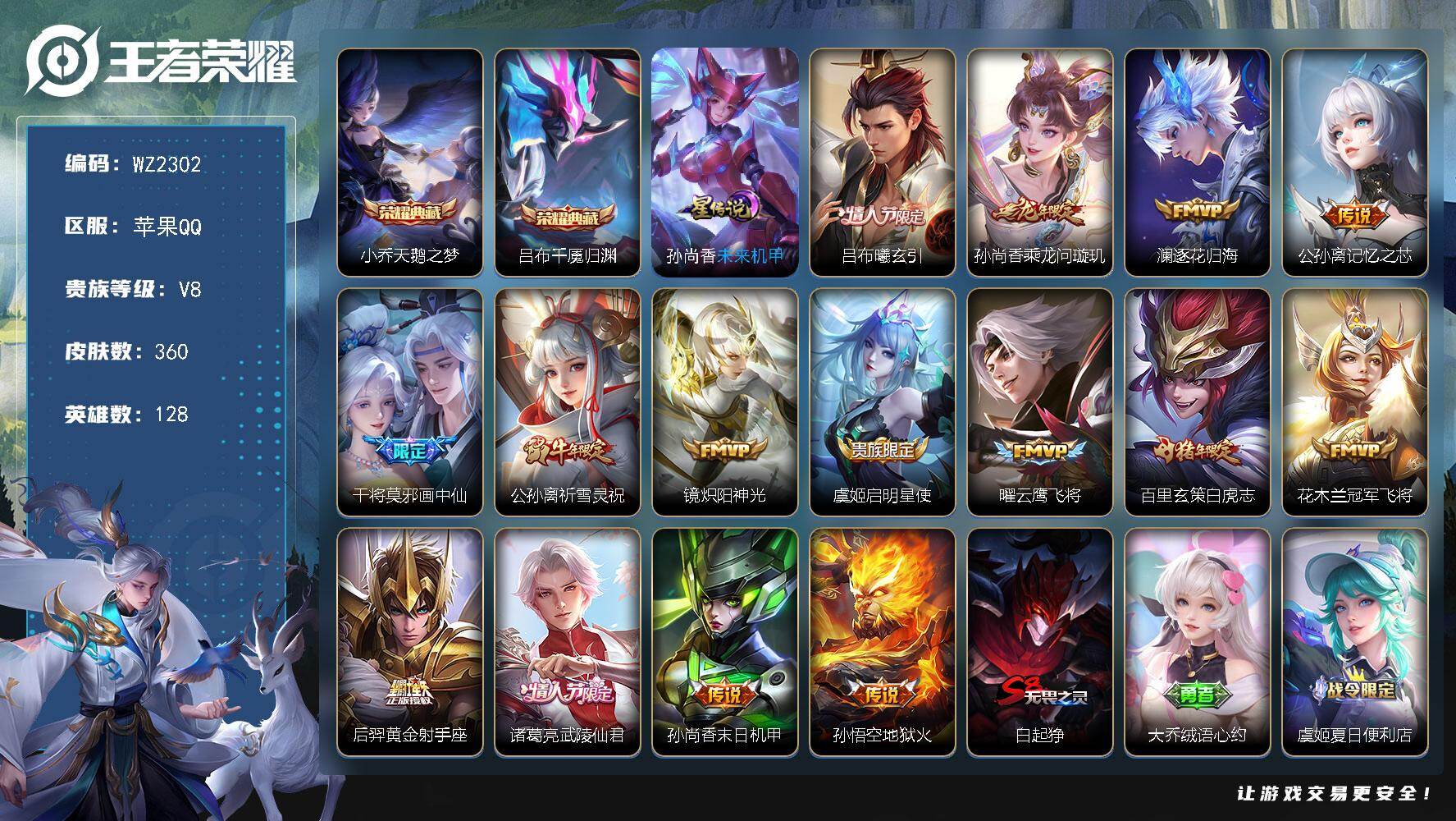 [17765473]苹果Q-V8-360皮肤-2典藏皮肤-15传说-100史诗 【英雄全皮】:孙权全皮,敖隐全皮,空空儿全皮,影全皮,海诺全皮 【荣耀典藏】:小乔天鹅之梦,吕布千魇归渊 【传说皮肤】:吕布曦玄引,孙尚香乘龙问璇玑,澜逐花归海,公孙离记忆之芯,干将莫邪画中仙,公孙离祈雪灵祝,镜炽阳神光,虞姬启明星使,曜云鹰飞将,百里玄策白虎志,花木兰冠军飞将,后羿黄金射手座,诸葛亮武陵仙君,孙尚香末日机甲,孙悟空地狱火 【限定皮肤】:白起狰,大乔绒语心约,虞姬夏日便利店,姜子牙天穹之誓,狄仁杰阴阳师,虞姬凯尔特女王,赵云皇家上将,赵云引擎之心,嬴政白昼王子,庄周云端筑梦师,庄周高山流水,高渐离死亡摇滚,高渐离玩趣恶龙,钟无艳王者之锤,扁鹊炼金王,扁鹊奇幻香踪,芈月重明,吕布猎兽之王,周瑜赤莲之焰,元歌云间偶戏,元歌无心,夏侯惇朔风刀,甄姬游园惊梦,曹操烛龙,典韦穷奇,典韦蓝屏警告,马可波罗暗影游猎,马可波罗山海玄木吟,狄仁杰魔术师,狄仁杰万华元夜,达摩星际陆战队,达摩沙漠行僧,项羽海滩派对,项羽霸王别姬,老夫子圣诞老人,老夫子醍醐杖,关羽冰锋战神,程咬金演武夺筹,露娜一生所爱,兰陵王驯魔猎人,花木兰青春决赛季,亚瑟潮玩骑士王,孙悟空大圣娶亲,牛魔御旌,李元芳银河之约,李元芳云中旅人,虞姬霸王别姬,虞姬启明星使,钟馗驱傩正仪,杨玉环遇见飞天,杨戬潮玩骑兵,女娲朔望之晖,干将莫邪冰霜恋舞曲,干将莫邪画中仙,雅典娜单词大作战,雅典娜黎明之约,蔡文姬繁星吟游,太乙真人饕餮,太乙真人华丽摇滚,鬼谷子原初探秘者,鬼谷子五谷丰年,诸葛亮武陵仙君,铠青龙志,百里玄策白虎志,百里玄策原初追逐者,百里守约朱雀志,弈星混沌棋,梦奇顽趣,公孙离祈雪灵祝,沈梦溪星空之诺,沈梦溪大漠名商,明世隐疑决卦,裴擒虎李小龙,裴擒虎擒涛扼浪,狂铁御狮,米莱狄御霄,米莱狄胡桃异想国,云中君纤云弄巧,盾山御銮,猪八戒西部大镖客,上官婉儿梁祝,嫦娥拒霜思,嫦娥暖冬兔眠,西施玲珑珍味,蒙犽狂想玩偶喵,鲁班大师探海日志,桑启海盐诗旅,暃星界游侠,戈娅驭风魔法,艾琳女武神,艾琳流音漫舞,司空震地狱燃心,阿古朵江河有灵,张良古海寻踪,蒙犽百解令,蒙恬荣光圣徽,鬼谷子天穹祈灯,孙尚香乘龙问璇玑,吕布曦玄引,沈梦溪龙舞盛年,刘邦剑破天穹,程咬金群星魔术团,关羽决胜骁骑,海诺心动手记,刘备异域游侠,芈月浮光幕影,周瑜熔金海岸 【年限皮肤】:百