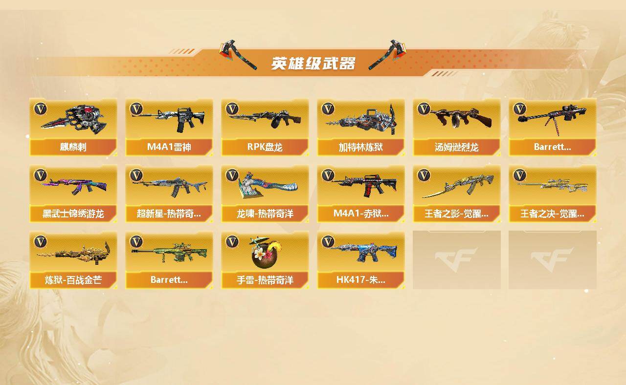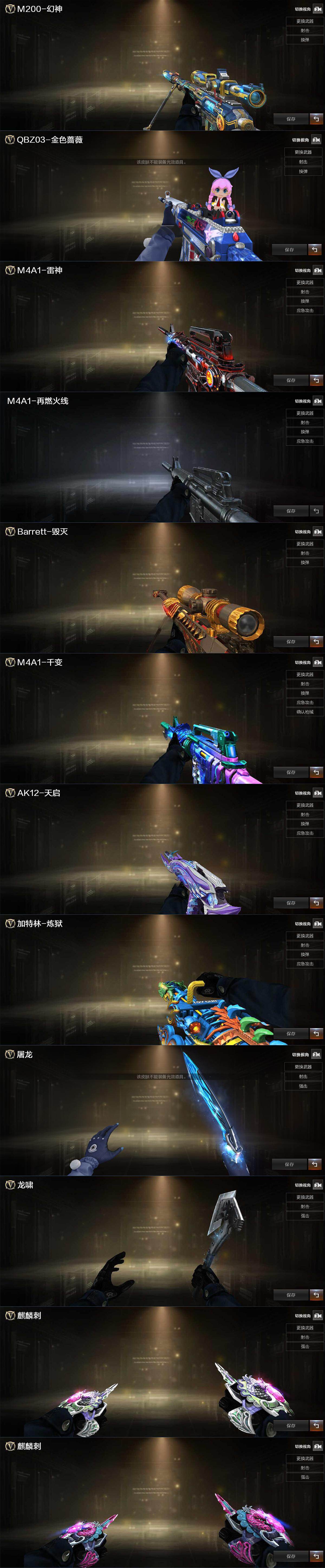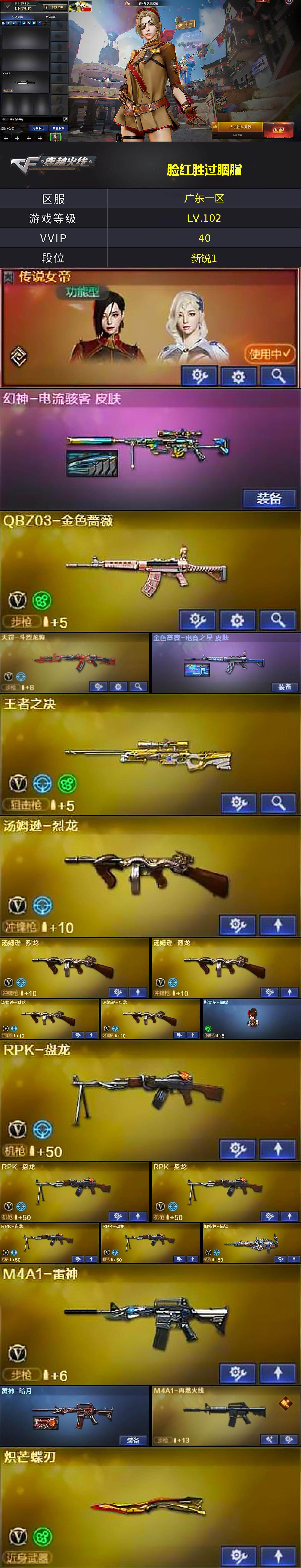 - [17261429]河南一区-90V-8王者-4炫金 【热门武器】:QBZ03-金色蔷薇,Scar Light-白虎,M200-幻神,死亡之眼,M4A1-黑骑士,汤姆逊-烈龙*6,RPK-盘龙*6,加特林-炼狱,COP 357-幻灵,沙鹰-修罗*3 【王者炫金武器】:天启-悦智,王者之怒,烈龙-悦心,炫金黑龙,炫金武士,炫金超新星,炫金修罗 【音效卡】:M4A1-雷神-云海游龙音效卡,Barrett-极光音效卡 【皮肤】:金色蔷薇-电竞之星 皮肤,裁决-胜者为王 皮肤,雷神-暗月,雷神-虎将,毁灭-暗月,毁灭-荣耀之怒,毁灭-英雄计划 皮肤,黑龙-能量核心,黑龙-暗月,无影-能量核心,天龙-能量核心,极光-能量核心,修罗-能量核心*2,天神-暗月,屠龙-荣耀之锋,龙啸-青青莓果 皮肤 【角色】:樱,鹰,隼,司雨,审判者,王者春,云海玲珑,空,北极狐-X,电竞少女,芳心审判者,飞虎队-X,风暴女,虎妞,嘉年华灵狐,娟娟,兰-新年限定,猎狐者-追月,0号玩家,灵狐-花神,灵狐者-X,灵狐者-黄金海岸,灵狐者-七夕宝贝,麻雀,潘多拉-X,潘多拉-甜心教官,铁骑荣耀,兔囡囡,维纳斯,新娜塔莎,雪莉杨,夜玫瑰-宠粉,樱-战斗天使,影武者-X,游珑儿 【人偶武器】:AWM-灵狐-15周年嘉年华,迷你深渊冰龙,生化手雷-机甲核心 【暴走生化】:死亡之眼,超级对讲机 【挑战大师】:冰龙粉碎者-白马银枪,激光毁灭者III-白马银枪,激光毁灭者III*2,神圣爆裂者-末日III 【英雄级武器】:AK47-火麒麟,M4A1-黑龙,M4A1-雷神*2,M4A1-黑骑士,AK47-无影,M4A1-死神,AK12-天启,AN94-超新星,Scar Light-白虎,无影-神兵利器,黑武士-锦绣游龙,M4A1-玫瑰精灵,QBZ03-金色蔷薇,王者之魄-觉醒版,AWM-天龙,Barrett-毁灭*2,Barrett-极光,AWM-裁决,M200-幻神,Barrett-金色蔷薇,王者之决-觉醒版,RPK-盘龙*6,加特林-炼狱,汤姆逊-烈龙*6,沙鹰-修罗*3,沙鹰-天神*2,COP 357-幻灵,屠龙*5,龙啸*2,擎天,麒麟刺,斩神刀-雷暴,王者之锋-觉醒版,高爆手雷-雷暴,高爆手雷-幻灵*4,高爆手雷-云龙*2,闪光弹-雷暴,闪光弹-幻灵*5,闪光弹-云龙*4,烟雾弹-雷暴,烟雾弹-幻灵*6,烟雾弹-云龙,烟雾