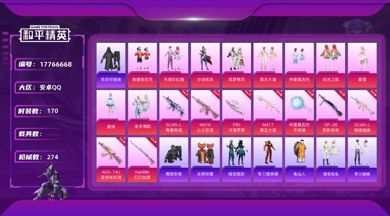 [17766668]安卓 手Q-10粉装-9特效枪-0载具-4粉色飞行器-87551热力值-9王牌印记-170套装-274枪皮 【热门品类】:粉装-音爆索尼克,套装-奇异狩猎者,角色-军刀雅典娜,套装-龟仙人 【粉色套装】:粉装-天使彩虹糖,粉装-沙场疾风,粉装-筑梦精灵,粉装-音爆索尼克,粉装-第五大道,粉装-仲夏莫吉托,粉装-炫光之旅,角色-美雪,角色-美琪,粉装-金丰海韵 【粉色枪皮等级】:SCAR-L-青春物语(七级),SCAR-L-锦绣绵绵(五级),M416-心之恋语(七级),AKS-74U-星穹咏叹调(五级),P90-冷漠罗丽(七级),Kar98K-巳巳如意(五级),M417-第五大道(六级),DP-28-豹影疾电(五级),平底锅-仲夏莫吉托(六级) 【粉色枪皮】:SCAR-L-青春物语,SCAR-L-锦绣绵绵,M416-心之恋语,AKS-74U-星穹咏叹调,P90-冷漠罗丽,Kar98K-巳巳如意,M417-第五大道,DP-28-豹影疾电,平底锅-仲夏莫吉托 【粉色飞行器】:花间之火飞行器,星夜魔法师飞行翼,电糖天使飞行器 【粉色降落伞】:至尊龙雀降落伞,四圣焕新降落伞,潮汐统领降落伞,香水柠檬降落伞,王牌四分卫降落伞,暗夜玫瑰降落伞,风花雪月降落伞,旋转彩虹降落伞,第五大道降落伞,仲夏莫吉托降落伞,拂晓神骑降落伞,精灵梦叶罗丽降落伞,创世·救赎降落伞,智耀战神降落伞,荧海星豚降落伞,喜羊羊与灰太狼降落伞,炫彩糖果降落伞 【稀有套装】:套装-龟仙人,套装-炫彩糖果,套装-雏菊兔兔,套装-萝兰蝴蝶,角色-多纳泰罗,套装-糖糖葫芦,套装-青团波波,角色-都市丽猫,套装-彩虹兔,套装-云朵鹅,套装-雪绒豹,套装-蓝海鲸歌 【稀有枪皮】:AUG-冰晶雪宝,AKM-夜灯,AKM-奇异狩猎者,AKM-灼热熔岩,AKM-萌趣颜团子,AKM-虎虎生威,AKM-阿狸红,AKM-霓虹街区,AKM-龙的传人,M16A4-幻世战舞者,M16A4-甜心亚梦,M16A4-蓝色火焰,SCAR-L-夜灯,SCAR-L-炫彩节奏,SCAR-L-玉兔迎春,SCAR-L-红色方程式,SCAR-L-冷漠罗丽,SCAR-L-净心行者,M416-夜灯,M416-糯团青竹,M416-红色方程式,M416-绯红前夜,M416-绿野极光,M416-蓝色火焰,M416-诡夜天鹅,M416-黄金狮王,GROZA-彩虹符号,