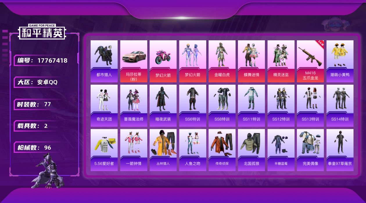 [17767418]【特价出售/店主推荐】安卓 手Q-4粉装-4特效枪-2载具-4粉色飞行器-35274热力值-3王牌印记-77套装-96枪皮 【热门品类】:粉装-梦幻火箭,套装-都市猎人,套装-潮萌小黄鸭 【粉色套装】:粉装-金曜白虎,粉装-蝶舞迷情,粉装-精灵迷巫,粉装-梦幻火箭 【粉色枪皮等级】:M416-五爪金龙(六级),UMP45-萌骑冒险(四级),AKS-74U-森灵之息(三级),Mk14-福马献瑞(五级) 【粉色载具】:玛莎拉蒂Ghibli(粉),双人摩托-梦幻火箭 【粉色枪皮】:M416-五爪金龙,UMP45-萌骑冒险,AKS-74U-森灵之息,Mk14-福马献瑞 【粉色飞行器】:春暖花开飞行器,精灵迷巫飞行器,梦幻火箭飞行器 【粉色降落伞】:深海曼妙降落伞,至尊龙雀降落伞,春暖花开降落伞,精灵迷巫降落伞,梦幻火箭降落伞,神秘黑猫降落伞,古堡领主降落伞 【稀有套装】:套装-雪国风尚,套装-马上来财,套装-雨过天青,套装-红釉青花,角色-曹焱兵 【稀有枪皮】:AKM-冰凉西瓜,AKM-春暖花开,M16A4-红色方程式,M16A4-魔法学院,SCAR-L-炫彩节奏,SCAR-L-红色方程式,SCAR-L-雷霆特警,M416-红色方程式,M416-蓝色火焰,M416-魔法学院,GROZA-影袭,GROZA-春暖花开,GROZA-暗夜武装,GROZA-暮色玫影,AUG-耀粉歌者,AUG-魔法学院,QBZ-洛神天依,M762-天降萌叽,M762-拳皇97,M762-牛气冲天,UZI-众神之王,UZI-影袭,UZI-炫彩节奏,UZI-红色方程式,UZI-魔法学院,UMP45-春暖花开,汤姆逊-勇闯险境,汤姆逊-耀粉歌者,汤姆逊-像素花束,MP5K-众神之王,Kar98K-梦幻火箭,Kar98K-深海曼妙,M24-影袭,M24-众神之王,M24-冰封烈焰,SKS-勇闯险境,VSS-星之彼岸,Mini14-春暖花开,Mini14-梦幻火箭,Mini14-炫彩节奏,Mini14-耀粉歌者,SLR-众神之王,S686-冰封烈焰,S686-魔法学院,S1897-勇闯险境,S1897-春暖花开,M249-拳皇97,DP-28-彩虹符号,P92-拳皇97,P92-雷霆特警,P1911-冰封烈焰,蝎式手枪-欢乐香蕉 【其他套装】:套装-SS6特训,套装-SS8特训,套装-SS11特训,套装-SS
