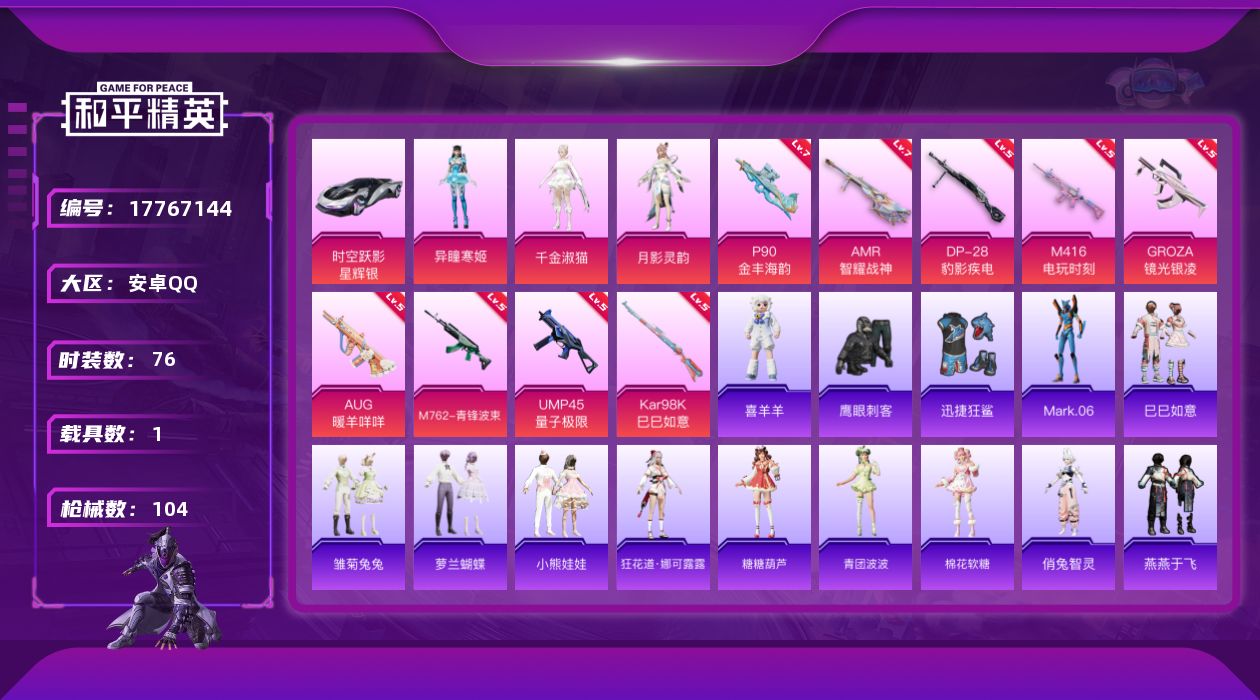 【粉色枪皮】:M416-电玩时刻,GROZA-镜光银凌,AUG-暖羊咩咩,M762-青锋波束,UMP45-量子极限,P90-金丰海韵,Kar98K-巳巳如意,AMR-智耀战神,DP-28-豹影疾电