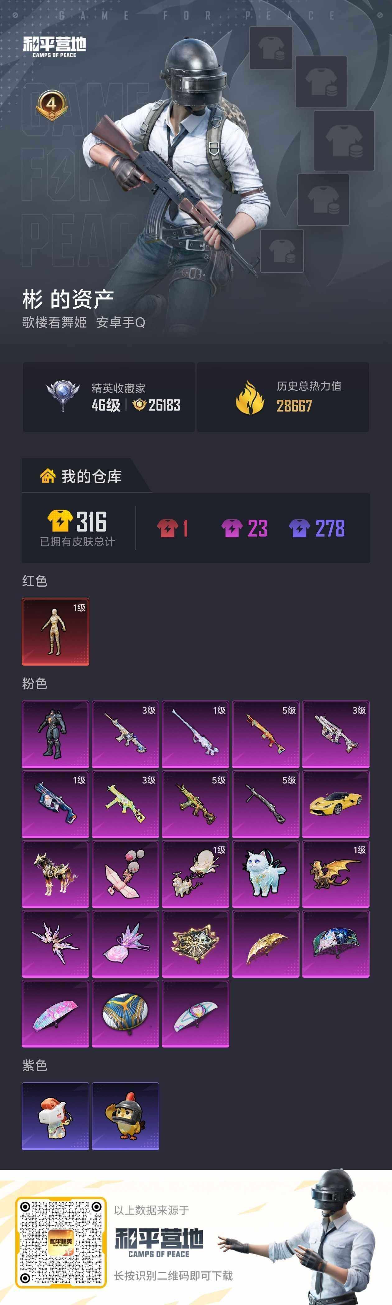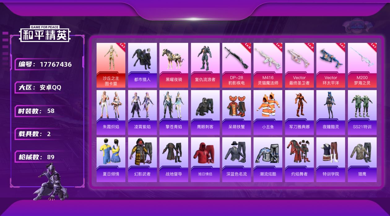 - [16543466]安卓 手Q-1神装-3粉装-5特效枪-0载具-2粉色飞行器-54115热力值-9王牌印记-145套装-184枪皮 【红色神装等级】:角色-银枪赵云(一级) 【红色角色神装】:角色-银枪赵云 【热门品类】:套装-忍者信条,套装-龟仙人,套装-暗影哥特,熔岩游骑兵连帽夹克 【粉色套装】:粉装-幻影战神,粉装-智能音符,粉装-未来歌姬 【粉色枪皮等级】:AKM-绿萝繁花(五级),SCAR-L-锦绣绵绵(五级),M416-暖熊萌萌(五级),Vector-飒粉甜心(四级),MG3-梦幻舞会(五级) 【粉色枪皮】:AKM-绿萝繁花,SCAR-L-锦绣绵绵,M416-暖熊萌萌,Vector-飒粉甜心,MG3-梦幻舞会 【粉色飞行器】:超新星飞行器 【粉色降落伞】:未来歌姬降落伞,拂晓神骑降落伞,莲影清波降落伞,异瞳寒姬降落伞,炫彩糖果降落伞 【稀有套装】:套装-龟仙人,套装-雪国风尚,套装-炫彩糖果,套装-糖糖葫芦,套装-青团波波,玩偶服-懒羊羊 【稀有枪皮】:AUG-冰晶雪宝,AKM-夜灯,AKM-彩虹符号,AKM-影袭,AKM-破晓战魂,AKM-萌趣颜团子,AKM-虎虎生威,AKM-霓虹街区,AKM-龙的传人,M16A4-幻世战舞者,M16A4-红色方程式,M16A4-蓝色火焰,SCAR-L-玉兔迎春,SCAR-L-红色方程式,SCAR-L-黄金龙骨,M416-夜灯,M416-糯团青竹,M416-红色方程式,M416-蓝色火焰,GROZA-彩虹符号,GROZA-影袭,GROZA-懵萌河马,AUG-天降萌叽,AUG-幻影战神,AUG-耀粉歌者,AUG-青春冒险家,AUG-绝对恒星,QBZ-彩虹符号,QBZ-未来歌姬,QBZ-神秘黑猫,M762-天降萌叽,M762-牛气冲天,M762-第五大道,M762-绯红前夜,Mk47-妙红点点,Mk47-炫光之旅,G36C-六号树人,G36C-懵萌河马,AC-VAL-天降萌叽,AC-VAL-快闪甜心,蜜獾-垂柳戏鸭,蜜獾-天降萌叽,蜜獾-娇憨猪猪,UZI-啾咪啾咪,UZI-天降萌叽,UZI-娇憨猪猪,UZI-影袭,UZI-炫彩节奏,UZI-红色方程式,UMP45-夜灯,UMP45-涂山之恋,UMP45-炫光之旅,UMP45-生命誓言,UMP45-蓝色火焰,Vector-彩虹符号,Vector-暗夜玫瑰,Vector-生命誓言,汤姆逊-天降