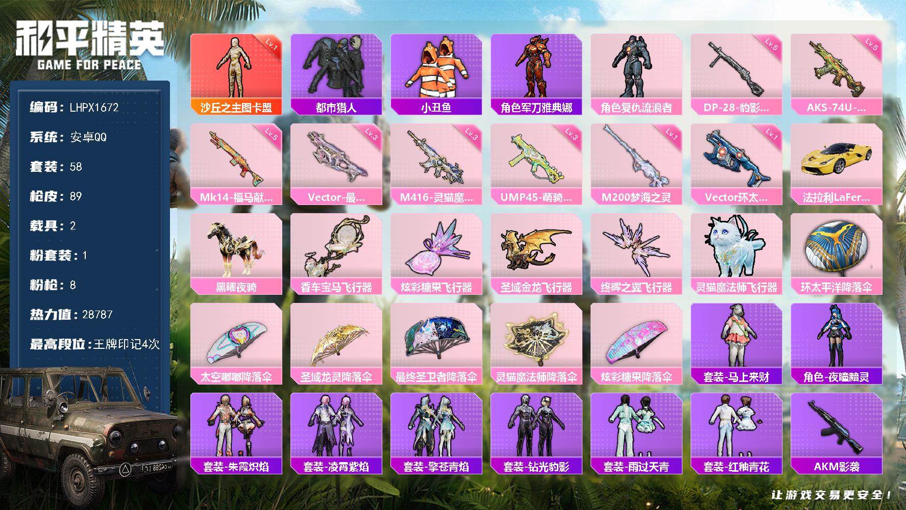 [17767436]【特价出售/店主推荐】安卓 手Q-1神装-1粉装-8特效枪-2载具-6粉色飞行器-28787热力值-4王牌印记-58套装-89枪皮